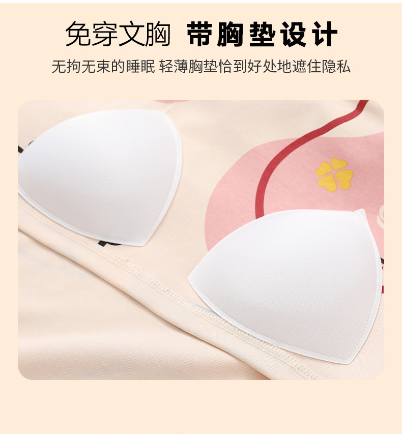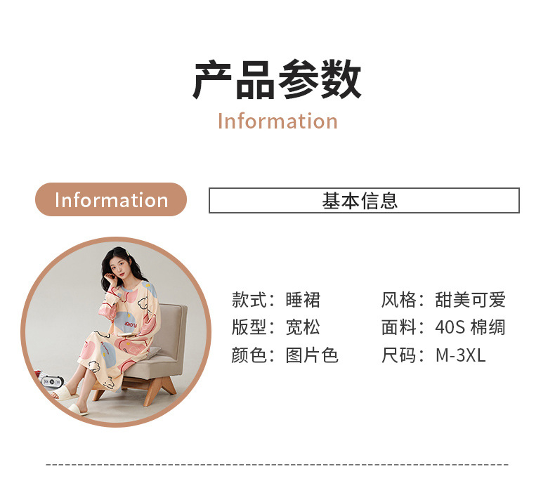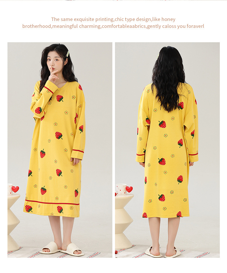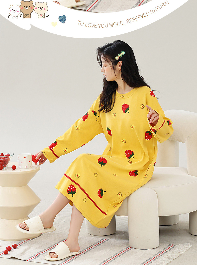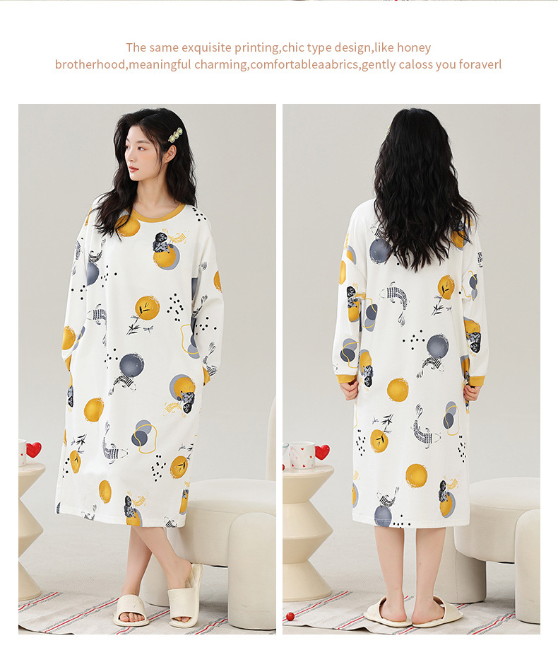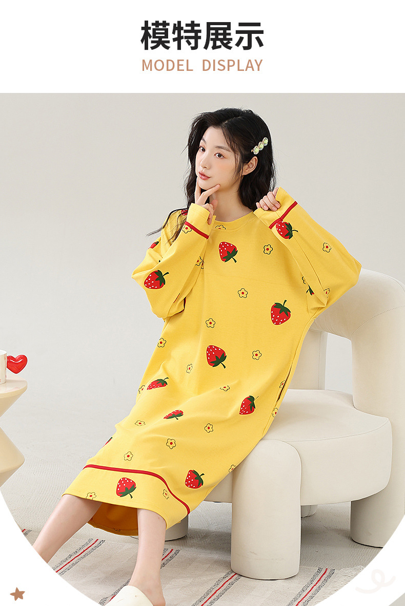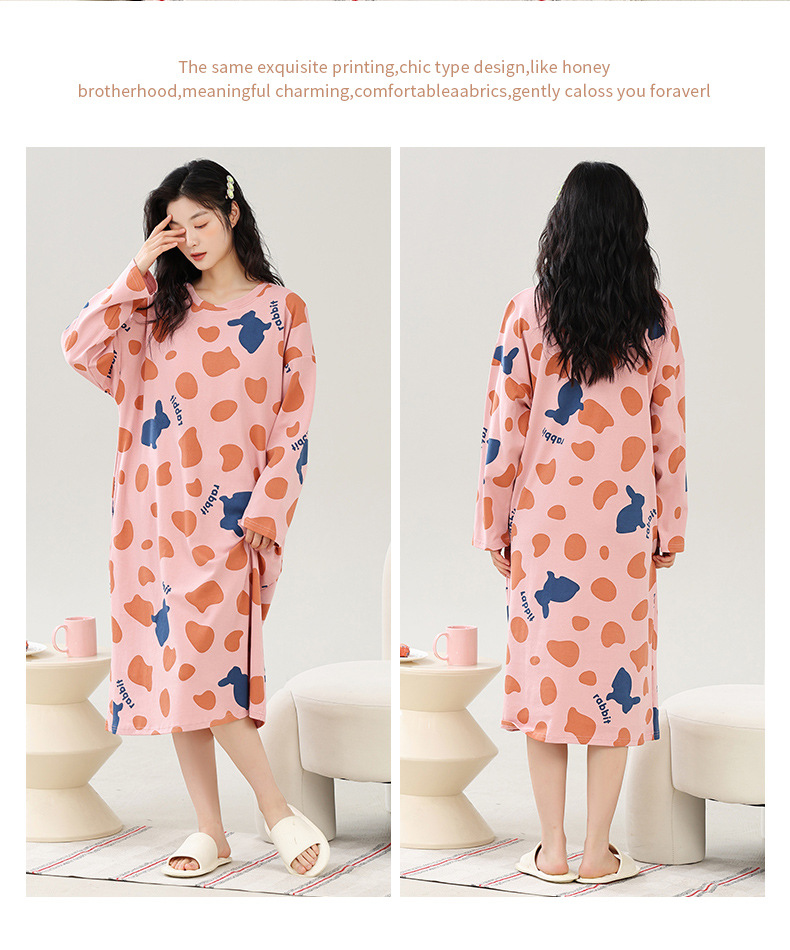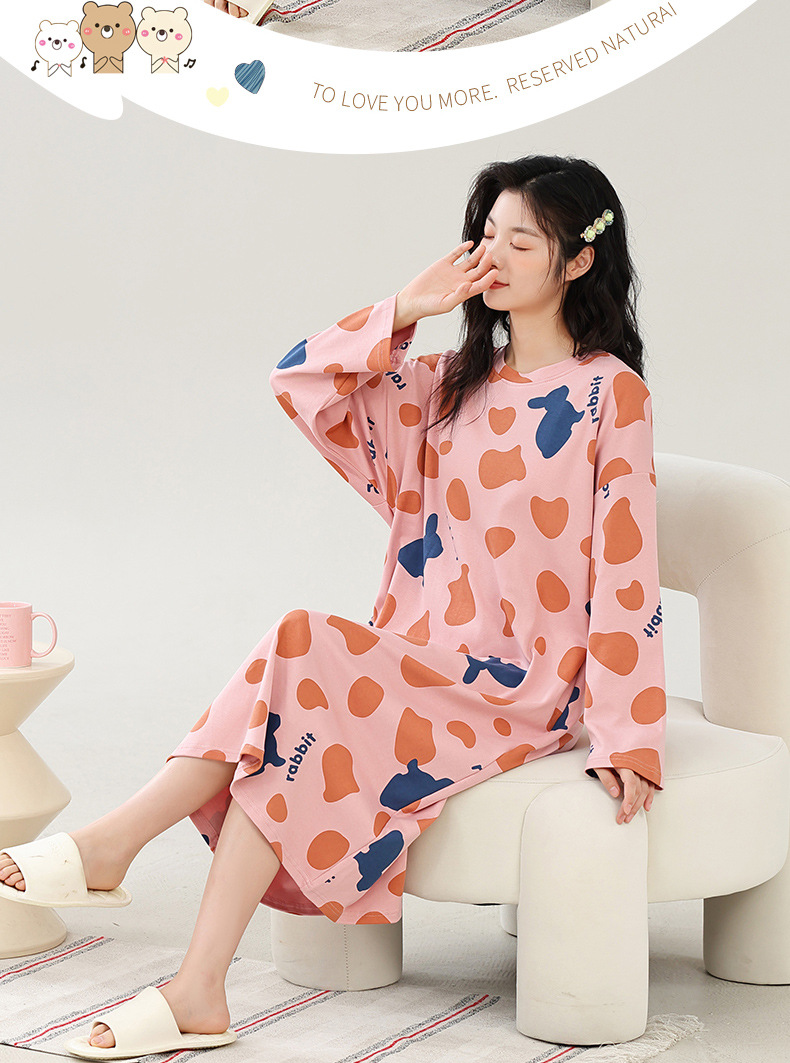 带胸垫长袖睡裙睡衣女秋季圆领卡通中长款宽松裙大码家居服可外穿