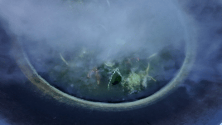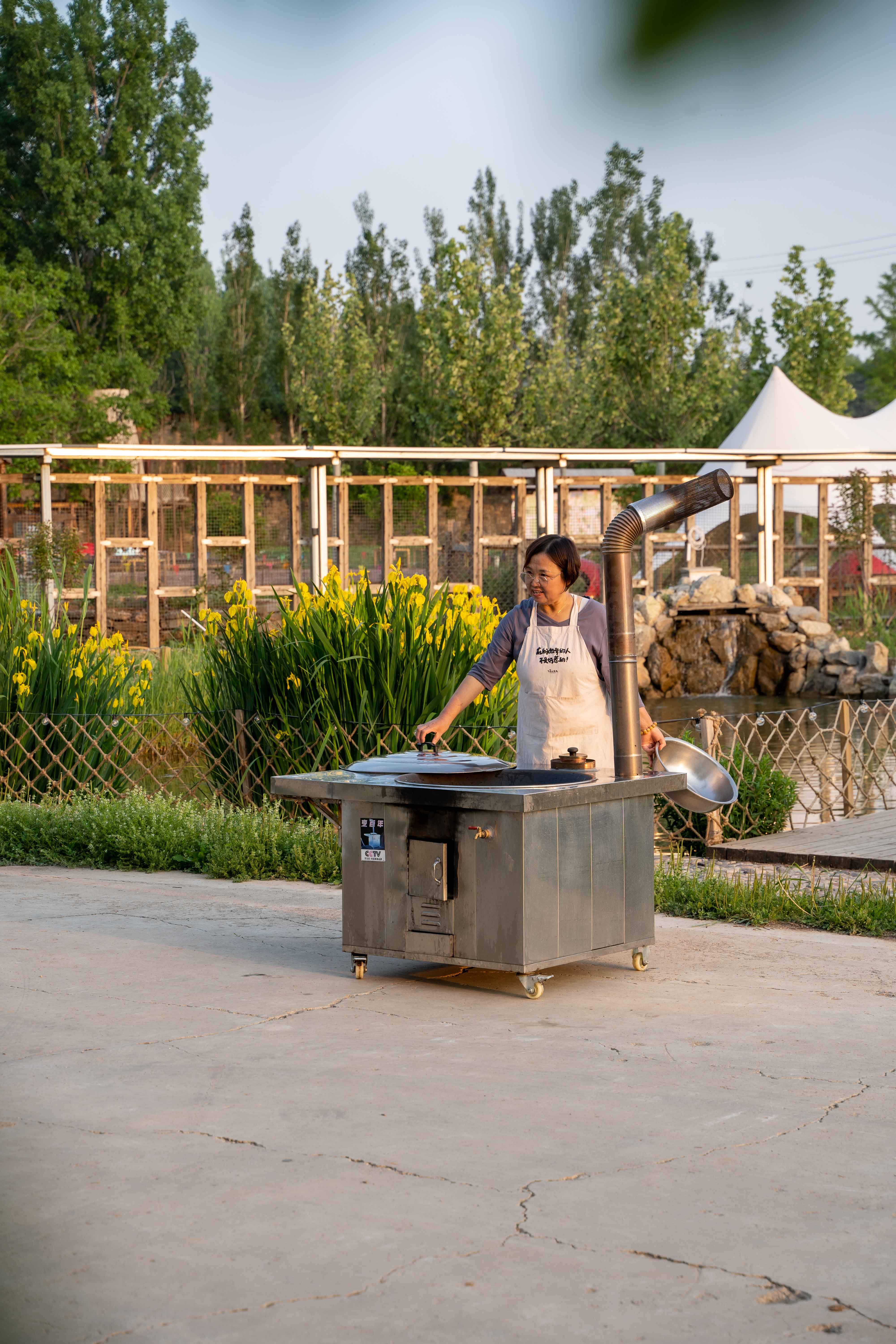 柴火正旺,粽子在柴锅中翻滚着,飘出阵阵粽香,背后是盛开的鸢尾花和水池的潺潺水声。