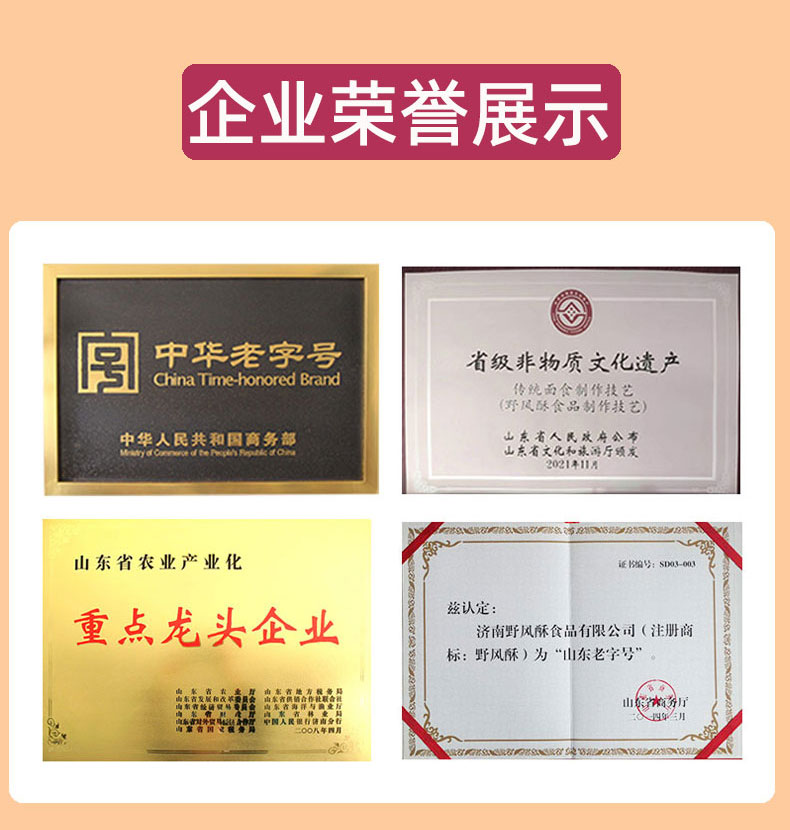 - 济南野风酥食品有限公司是一家从事绿色无公害农产品深加工,生产山东特产食品的企业。职工总人数586人,其中高中级技术人员56人。2007年济南野风酥食品有限公司被山东省人民政府授予省级农业产业化经营重点龙头企业。我公司生产的糖酥煎饼等系列产品曾连续获农业部、山东省优质产品奖,被人民大会堂定为国宴用品。“九顶塔”牌商标获得“省优”“部优”商标称号。全国著名的营养学家于若木曾来厂视察并亲笔题词,姜春云、苏毅然等国家、省级领导先后来厂视察。“野风酥”被中国食品协会评为“优秀民族食品”,获得“中华名吃”称号。产品连续获得国家级食品展销会的畅销产品奖,成为山东省的特色食品,省、市旅游局的十佳旅游商品。“山东煎饼”和“山东烧饼” 被认证为绿色食品。