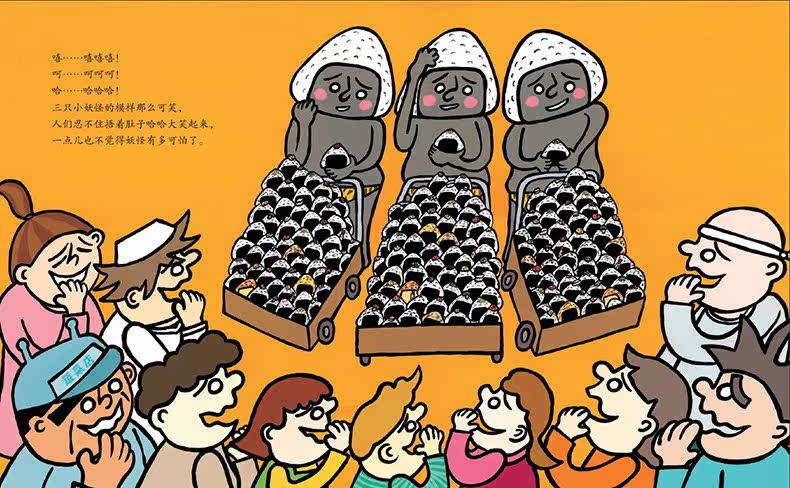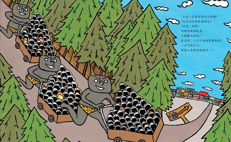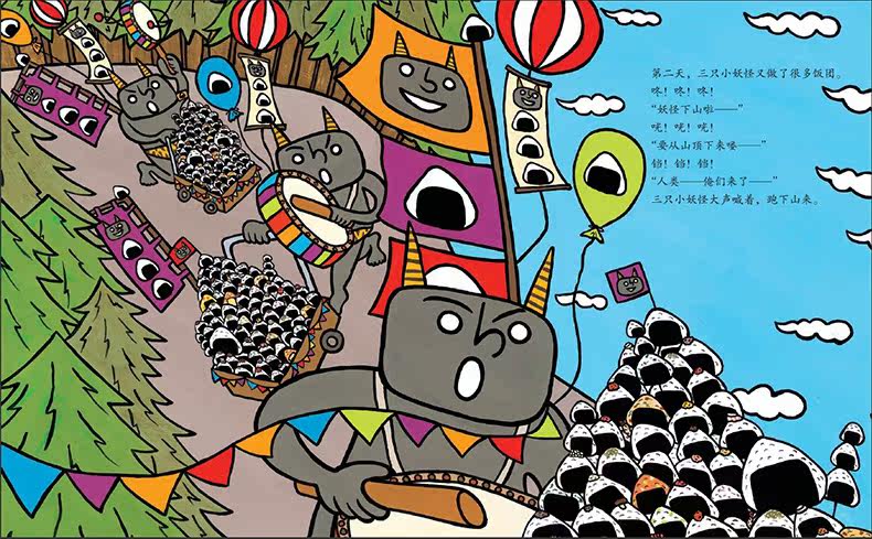 "三只小妖怪非常喜欢吃饭团。他们觉的自己做的饭团好吃极了。又一次,他们在山上吃饭团,上山来野餐的人类被吓跑了。小妖怪发现了人类留下的饭团,咬一口……啊,真难吃!人类好可怜啊,吃这么难吃的饭团。这三个有爱的小妖怪觉得应该把自己做的好吃的饭团送给人类吃,他们精心准备了满满的三车饭团,送到山下去给人类。可是,人类一看到他们就吓得一溜烟跑掉了。小妖怪真难过。他们觉得,一定是人类不喜欢不速之客,于是他们又推着饭团,敲锣打鼓地出发去给人类送。人类还是吓跑了。这可怎么办呢……"