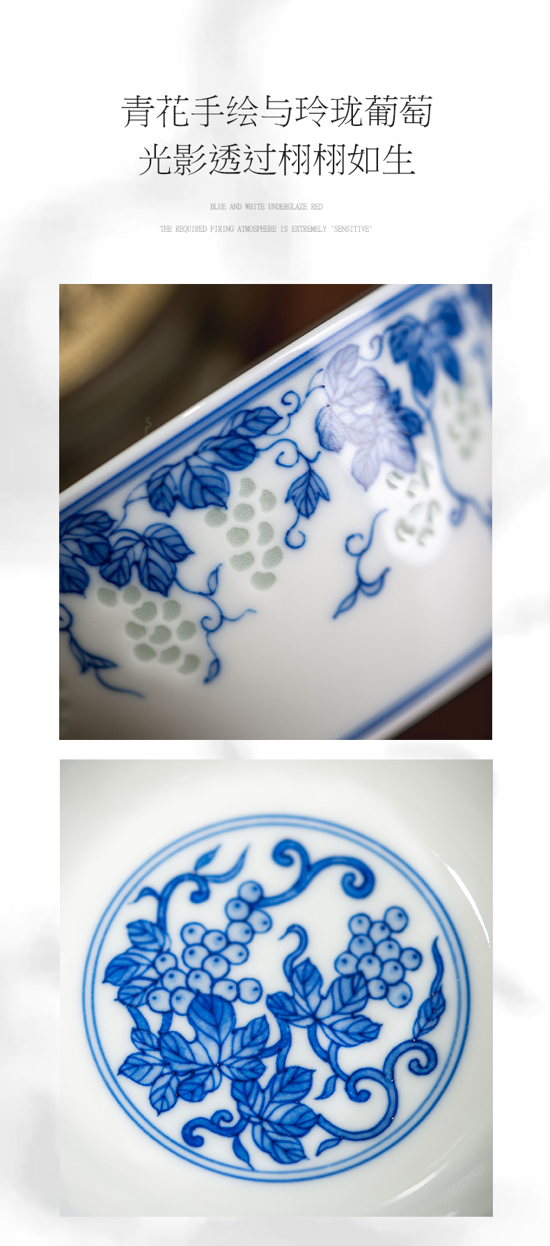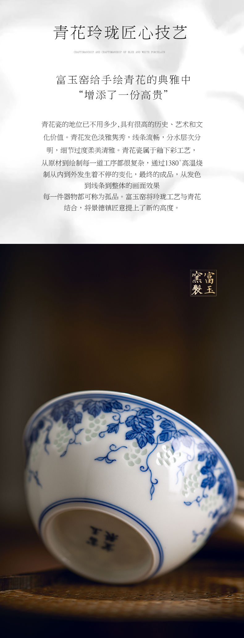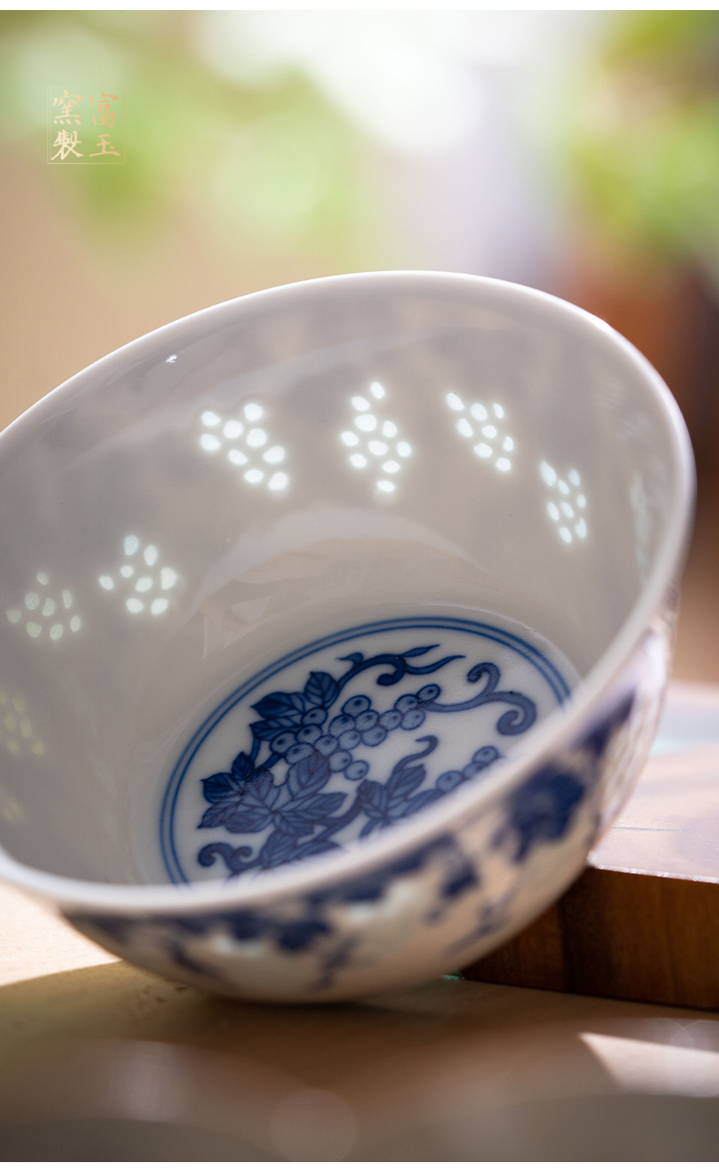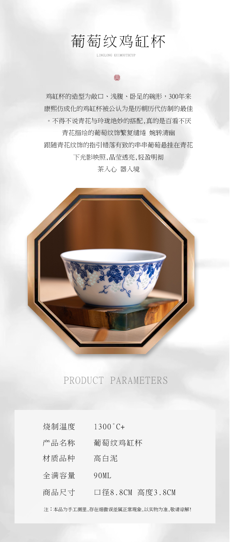富玉窑 景德镇全手工玲珑瓷手绘青花葡萄纹鸡缸杯