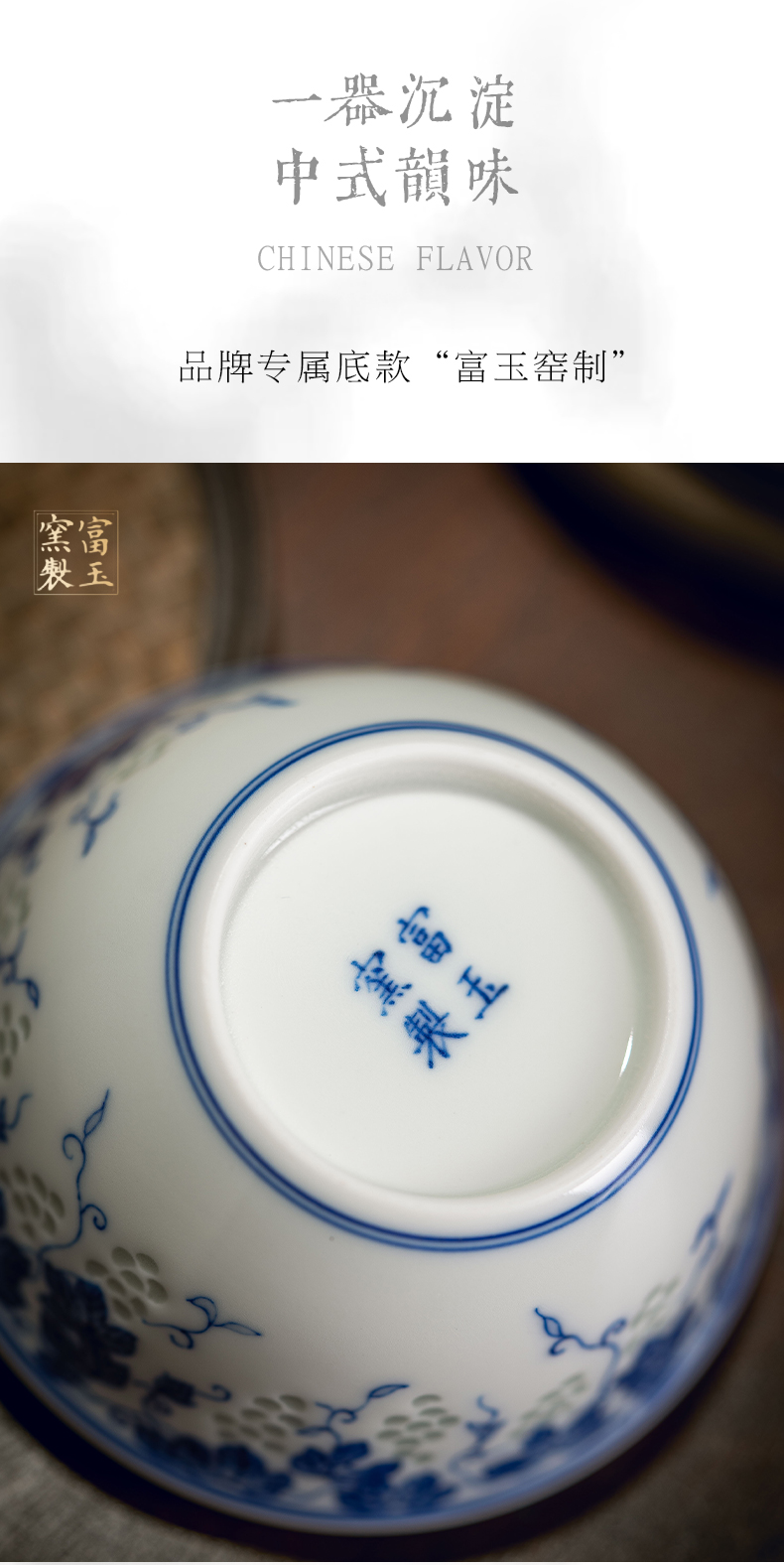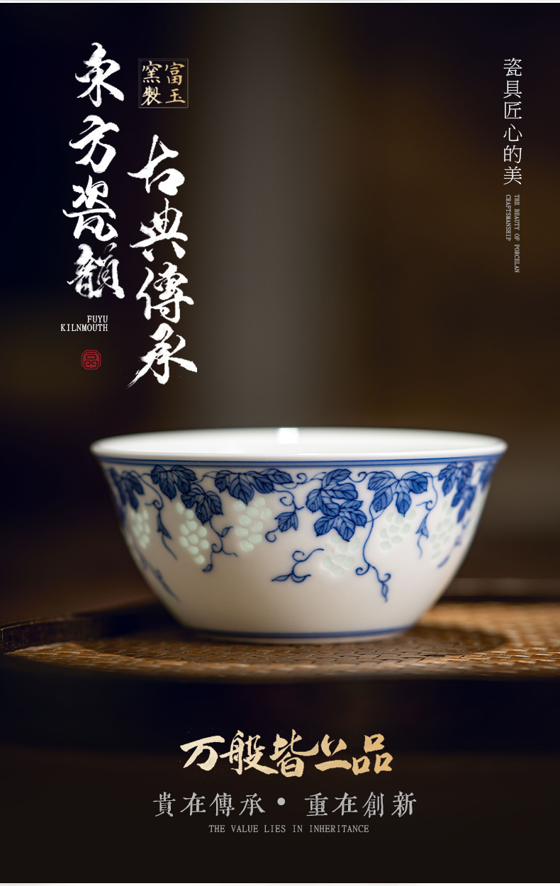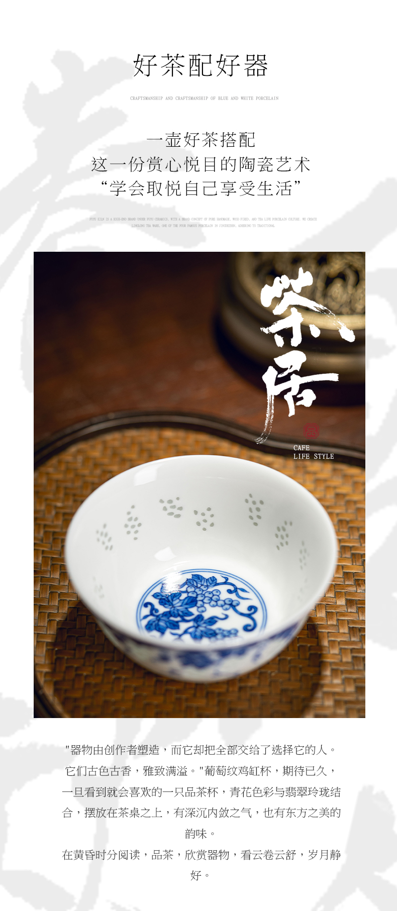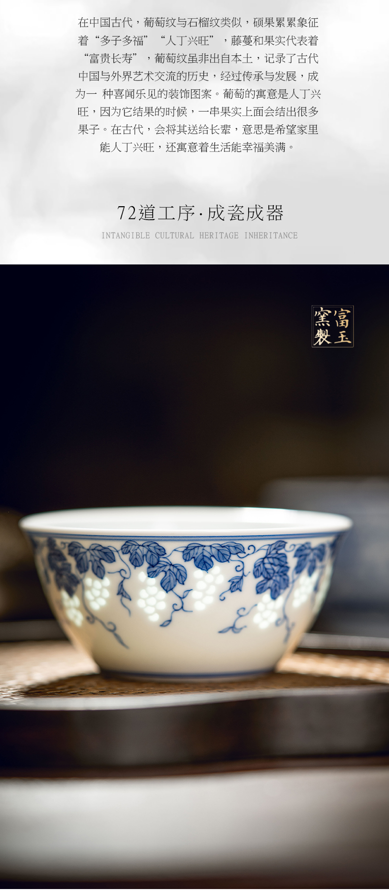 富玉窑 景德镇全手工玲珑瓷手绘青花葡萄纹鸡缸杯