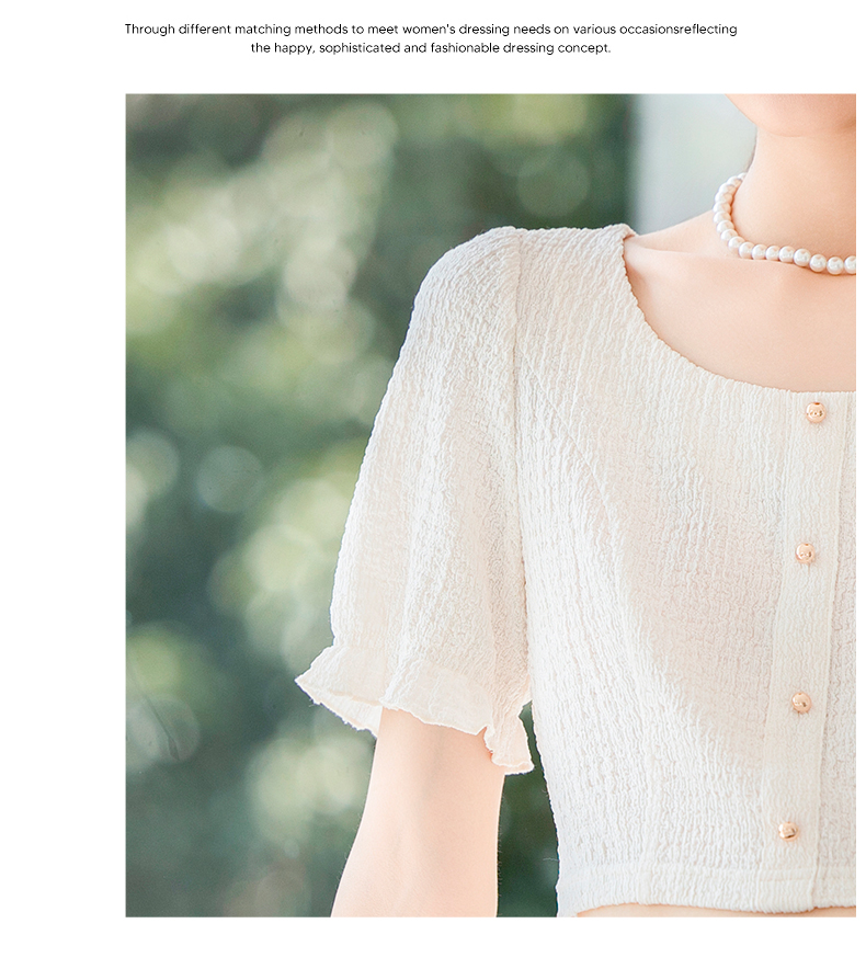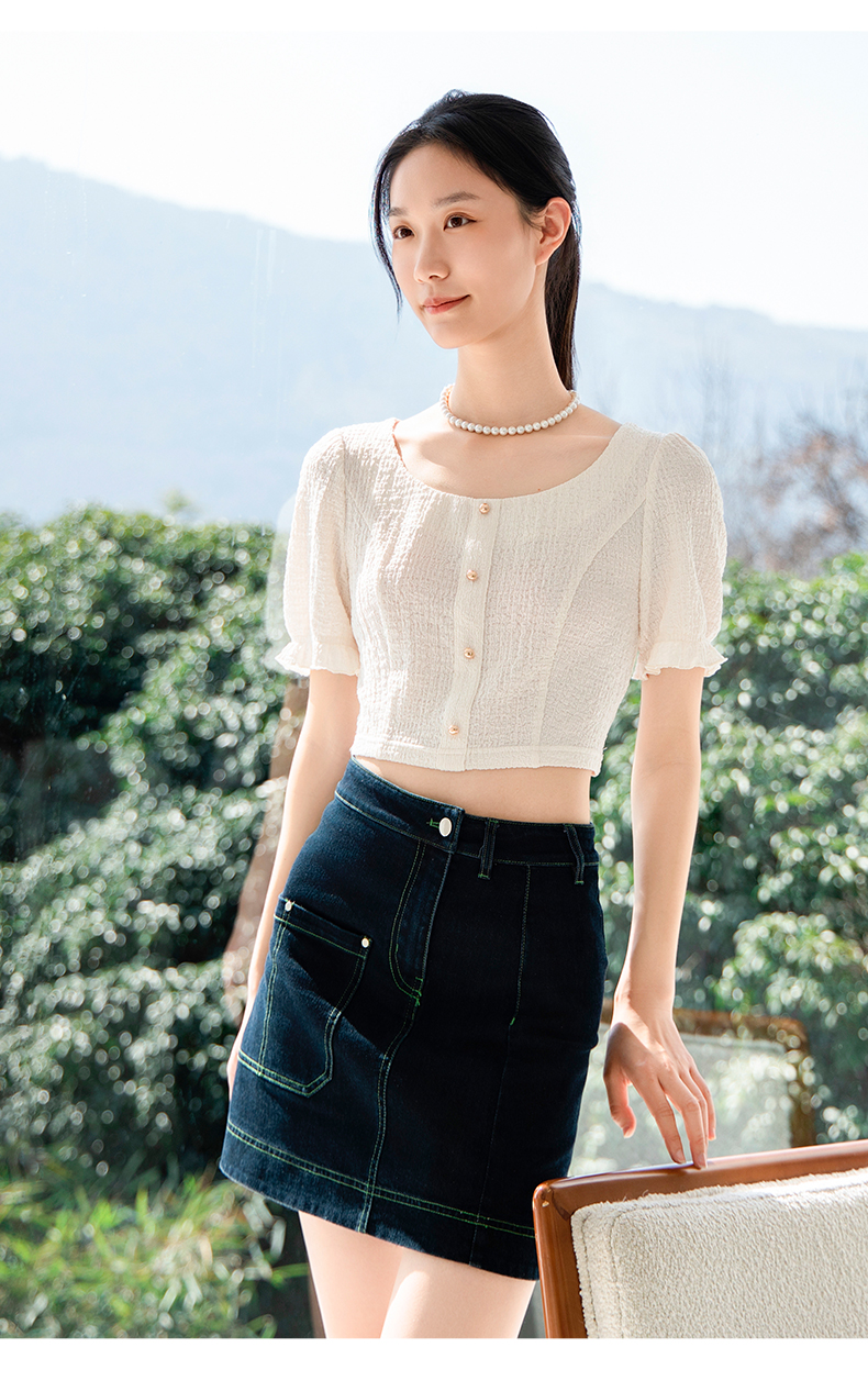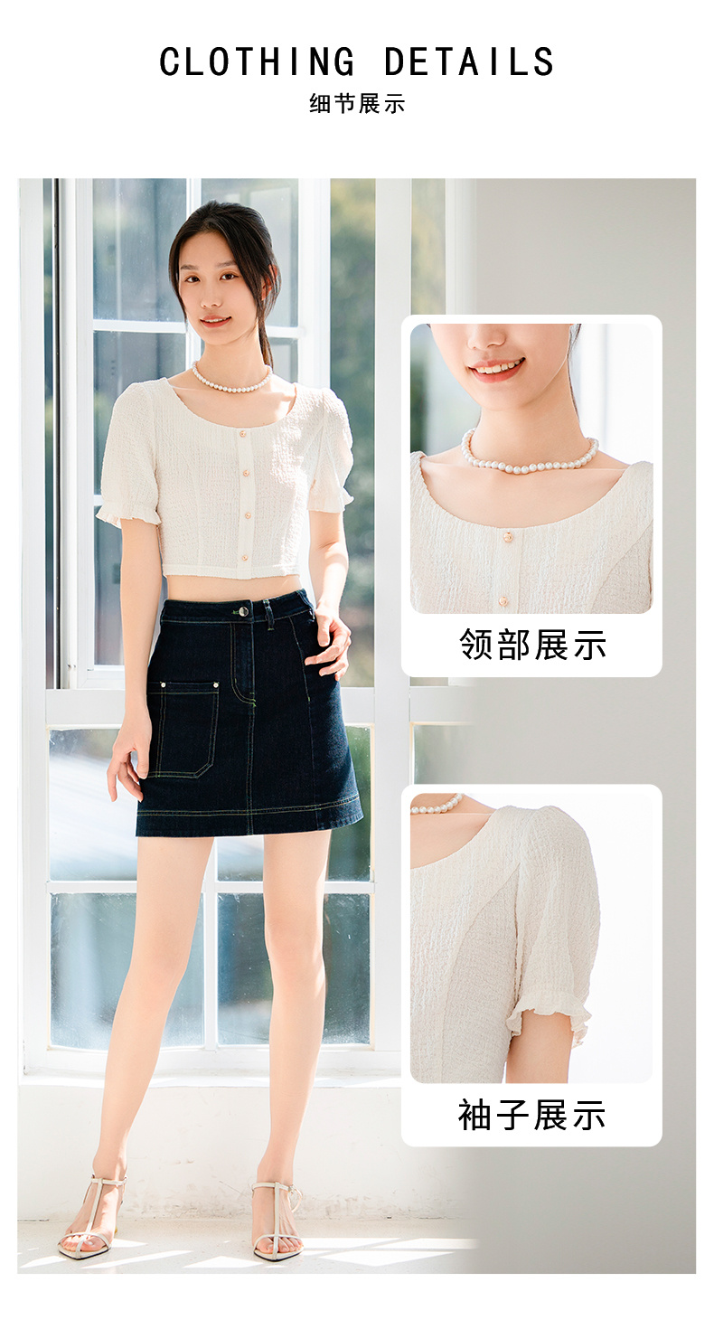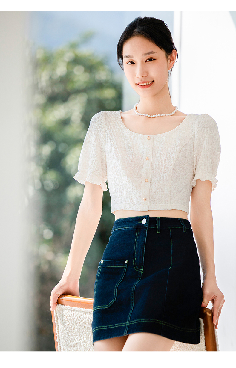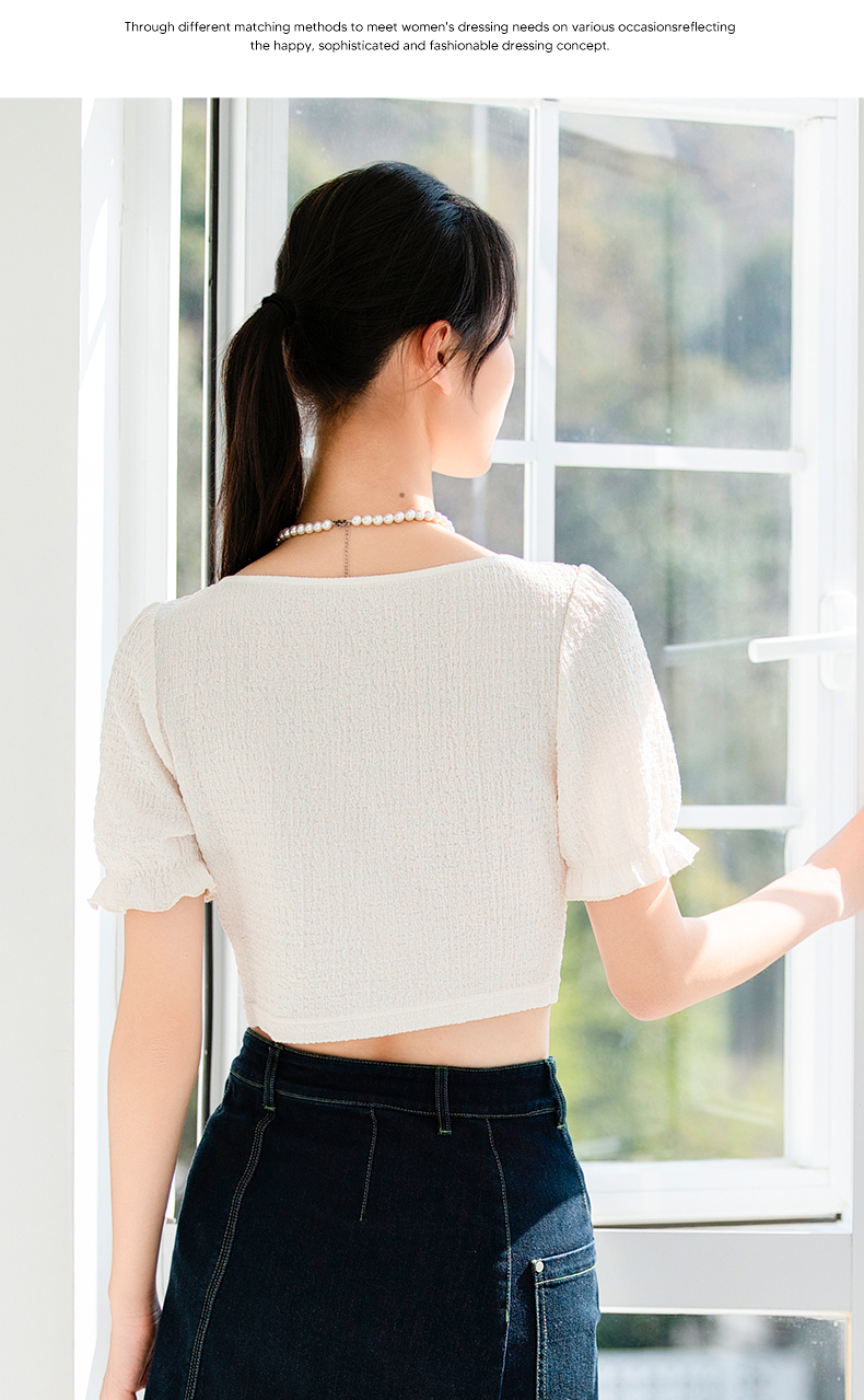 NUTS女短袖t恤夏薄款法式方领衬衫泡泡袖短款上衣423011192