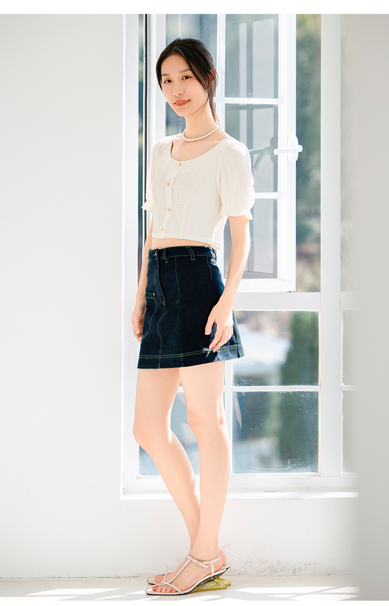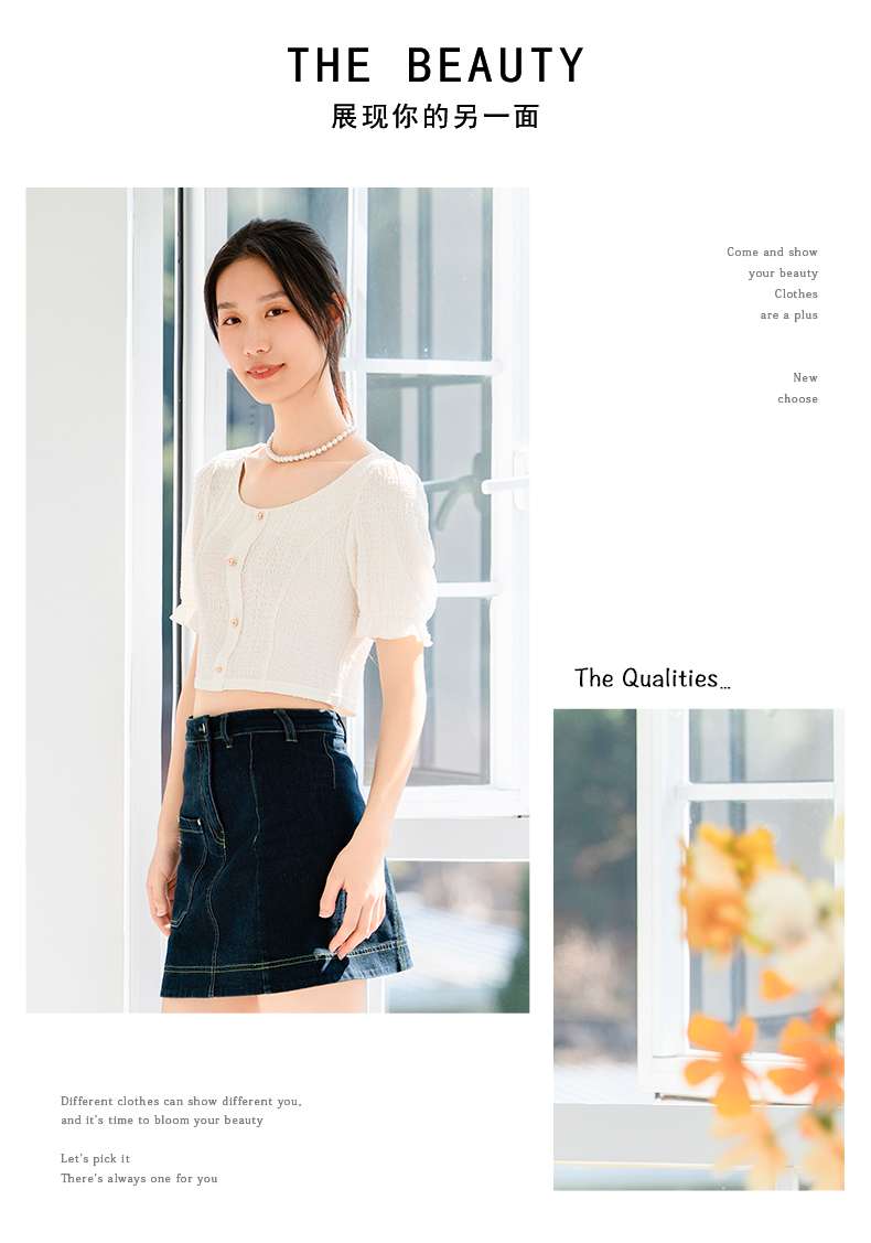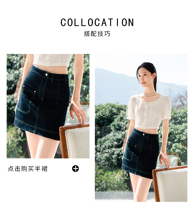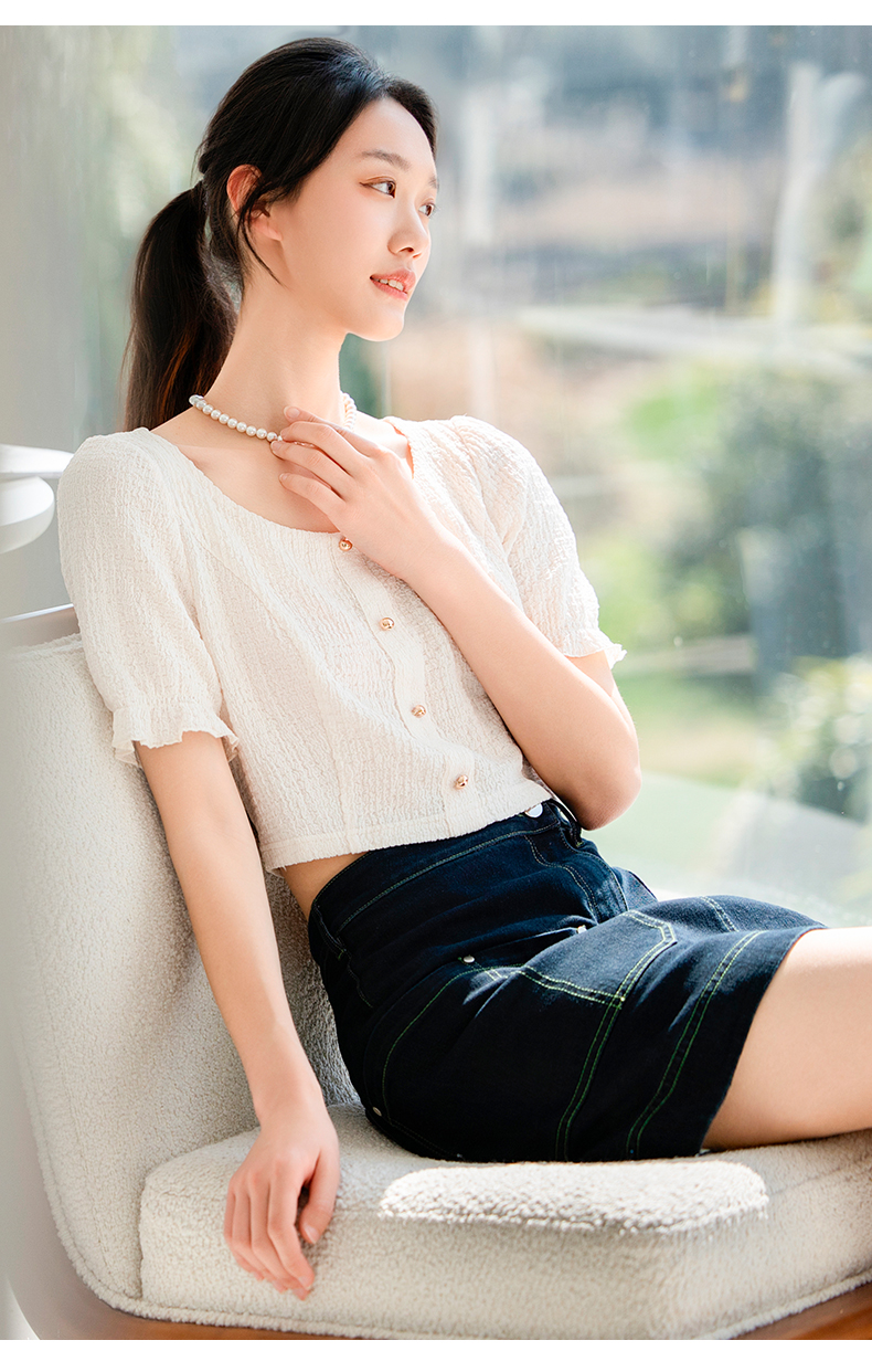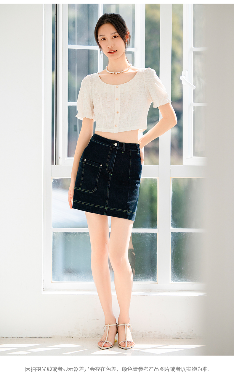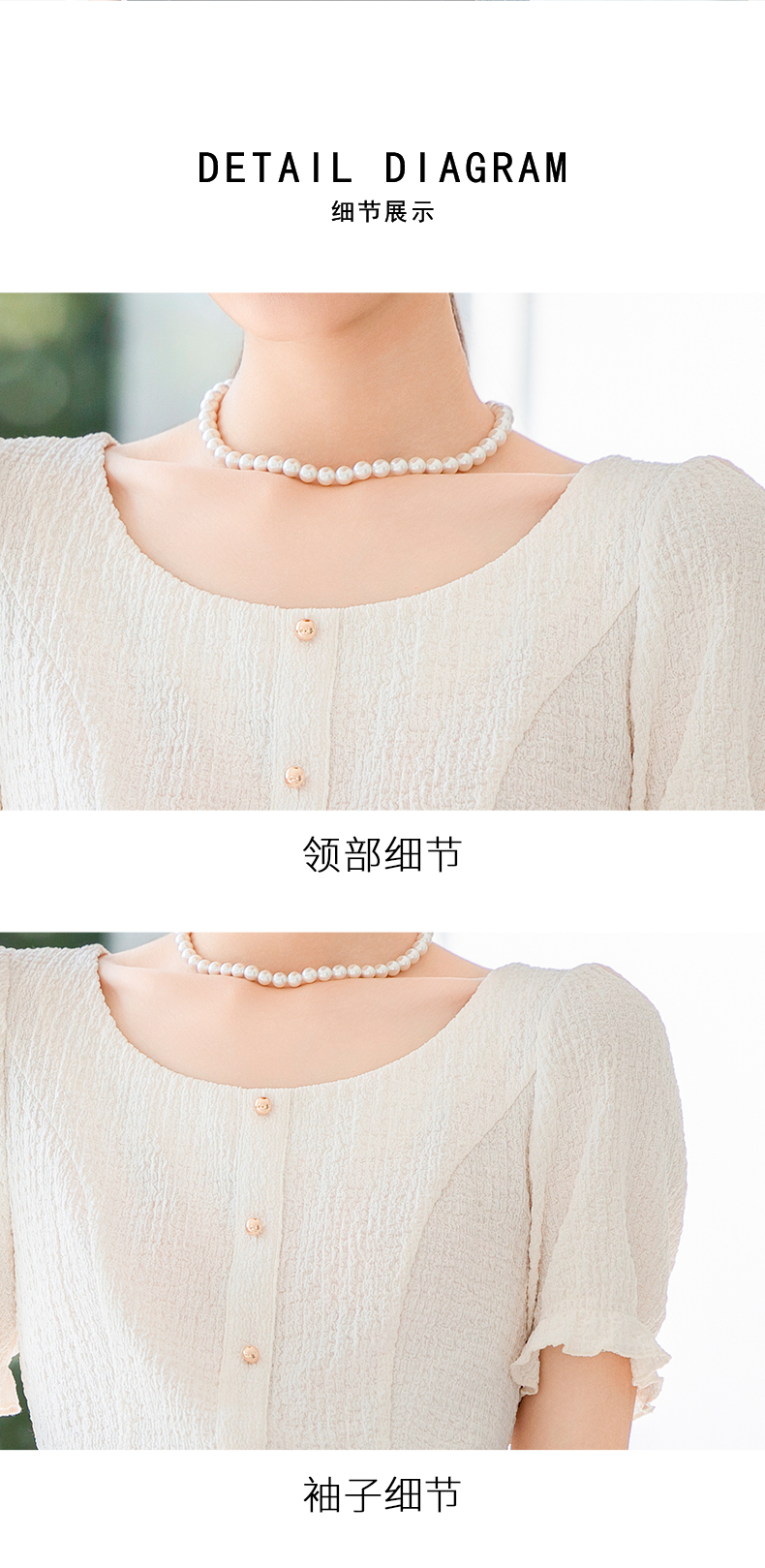 NUTS女短袖t恤夏薄款法式方领衬衫泡泡袖短款上衣423011192
