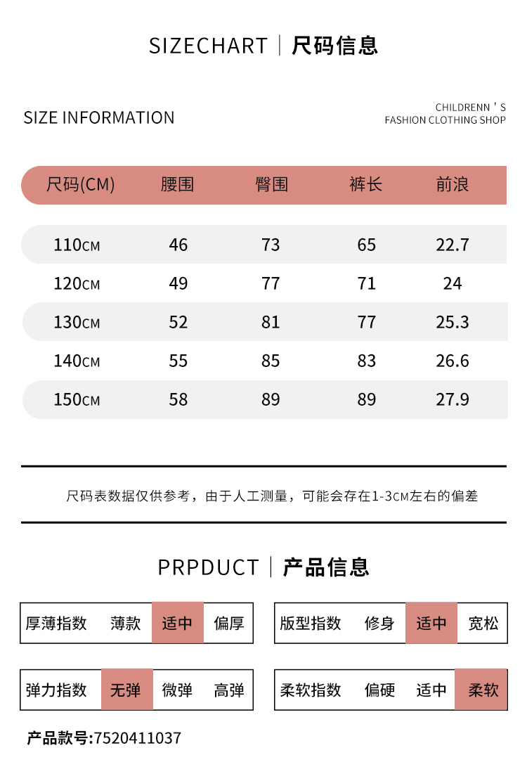 | 参考身高: 110/50 120/53 130/53 140/55 150/58 | 适用季节: 春秋 |