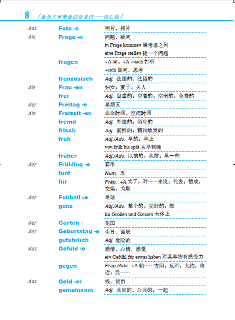 《备战大学德语四级考试—词汇篇》以教学大纲为基准,收录单词2600余个,短语300余条。所选单词覆盖了大学德语教学大纲中所规定的四级词汇,同时补充了一些六级词汇和大纲中没有收录的常用词汇。这些非四级词汇中,有些是当今日常生活中常用的词汇,有些则是与相应的四级词汇在构词法上密切相关,且由此容易掌握的词汇。