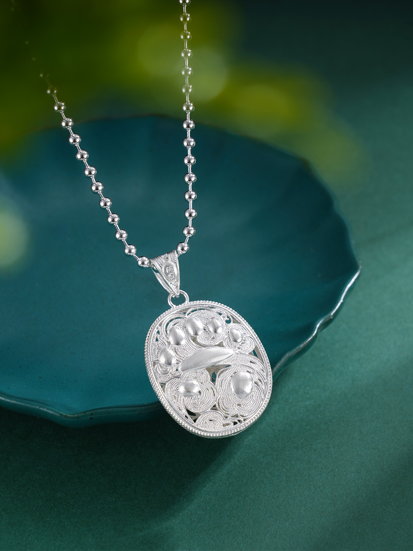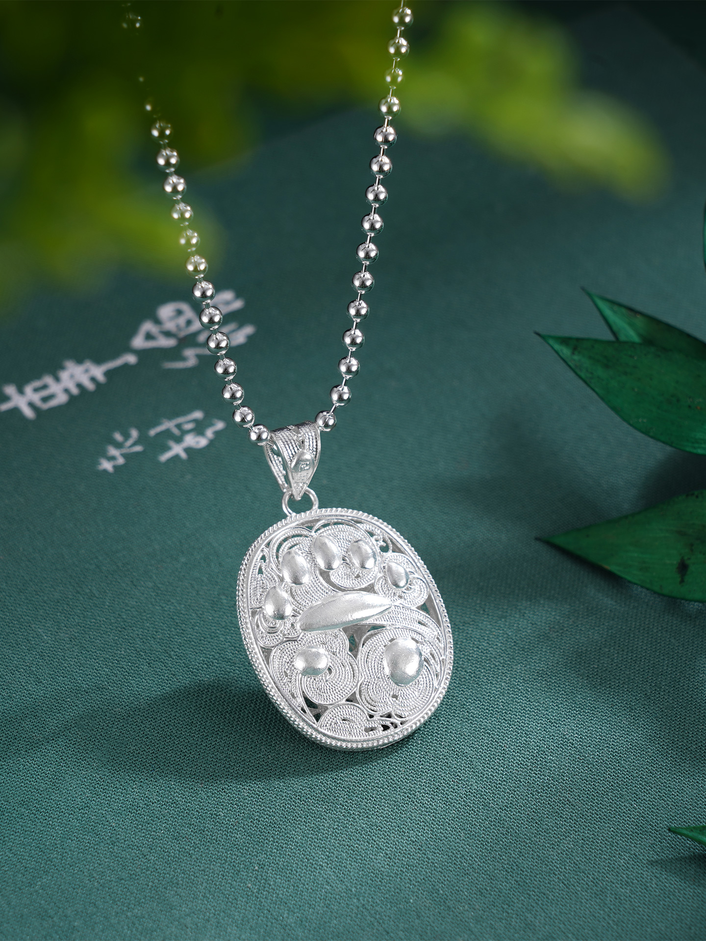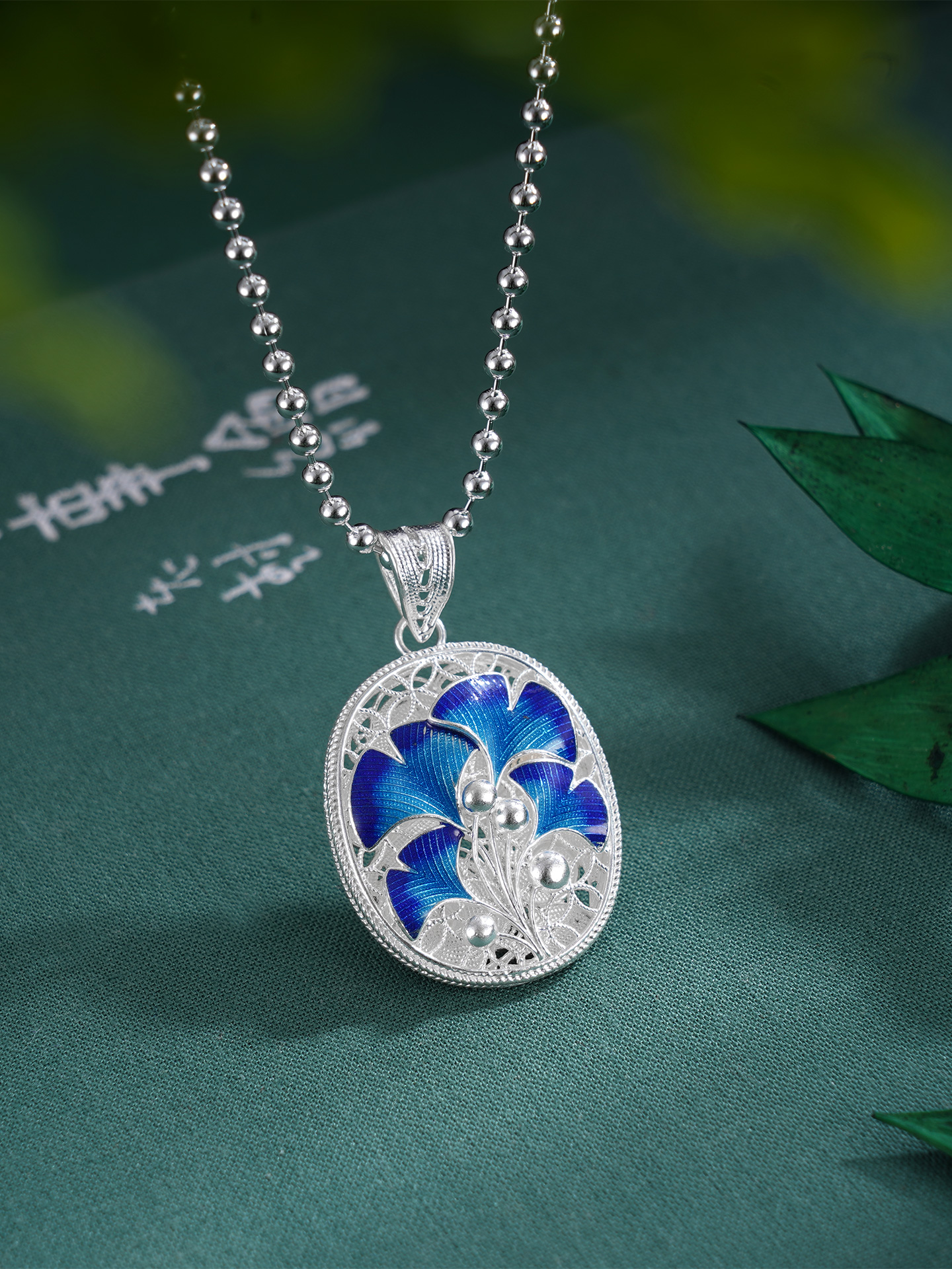 【寓意】:银花丝工艺精细勾勒出银杏轮廓,赋予吊坠轻盈形态,展现出清宁与雅致兼具的风格。设计中融入象征着健康长寿、幸福吉祥的银杏元素,使得整件作品不仅是一件装饰品,更承载着深厚的情感寄托。