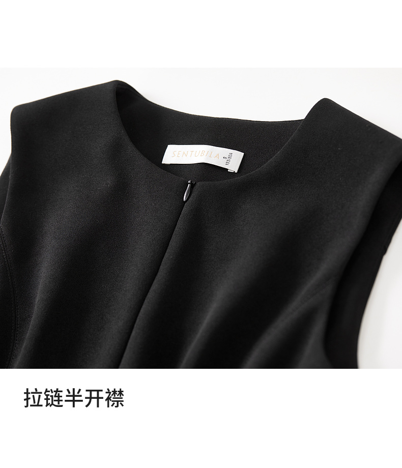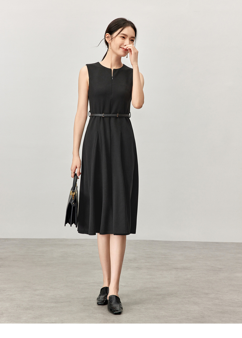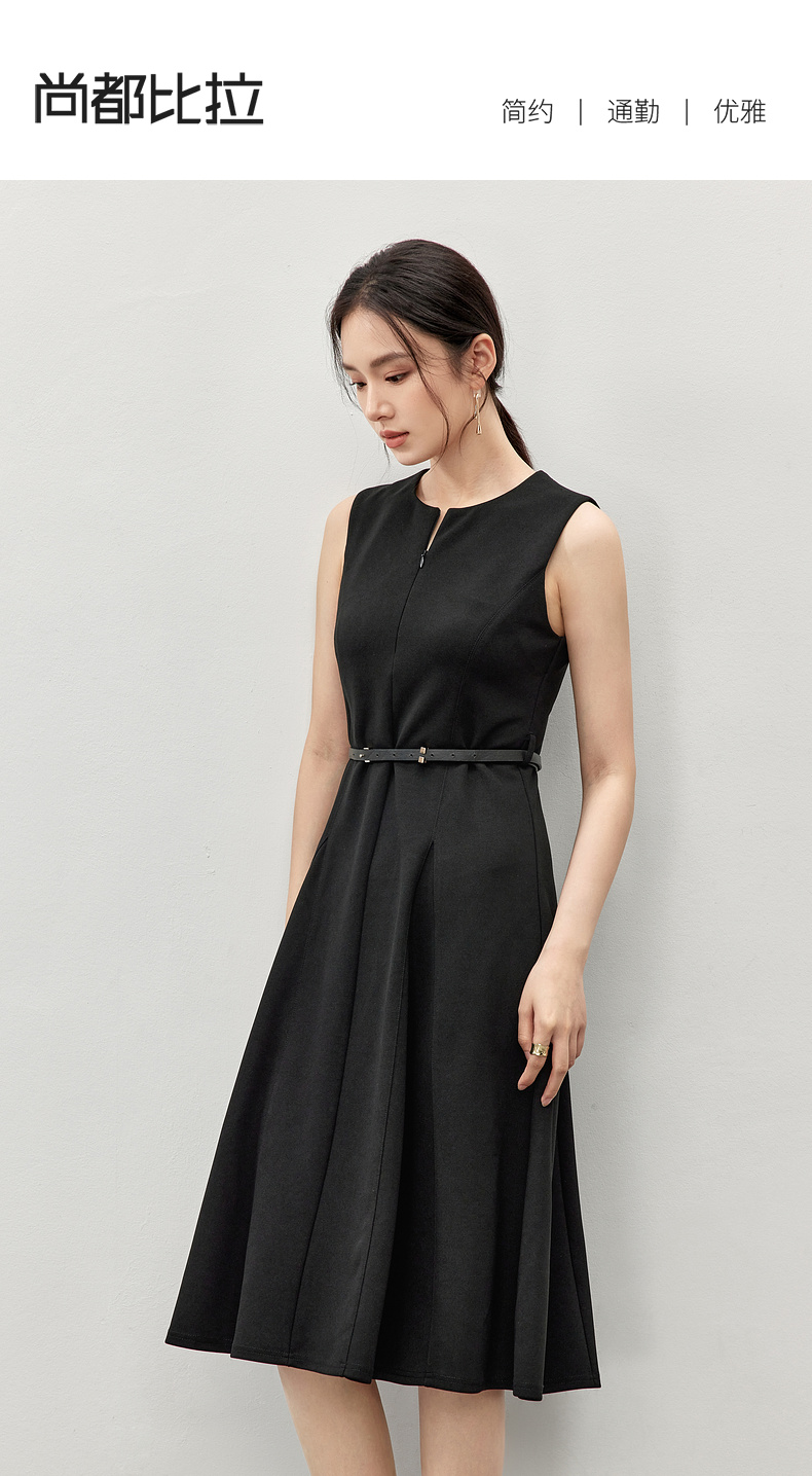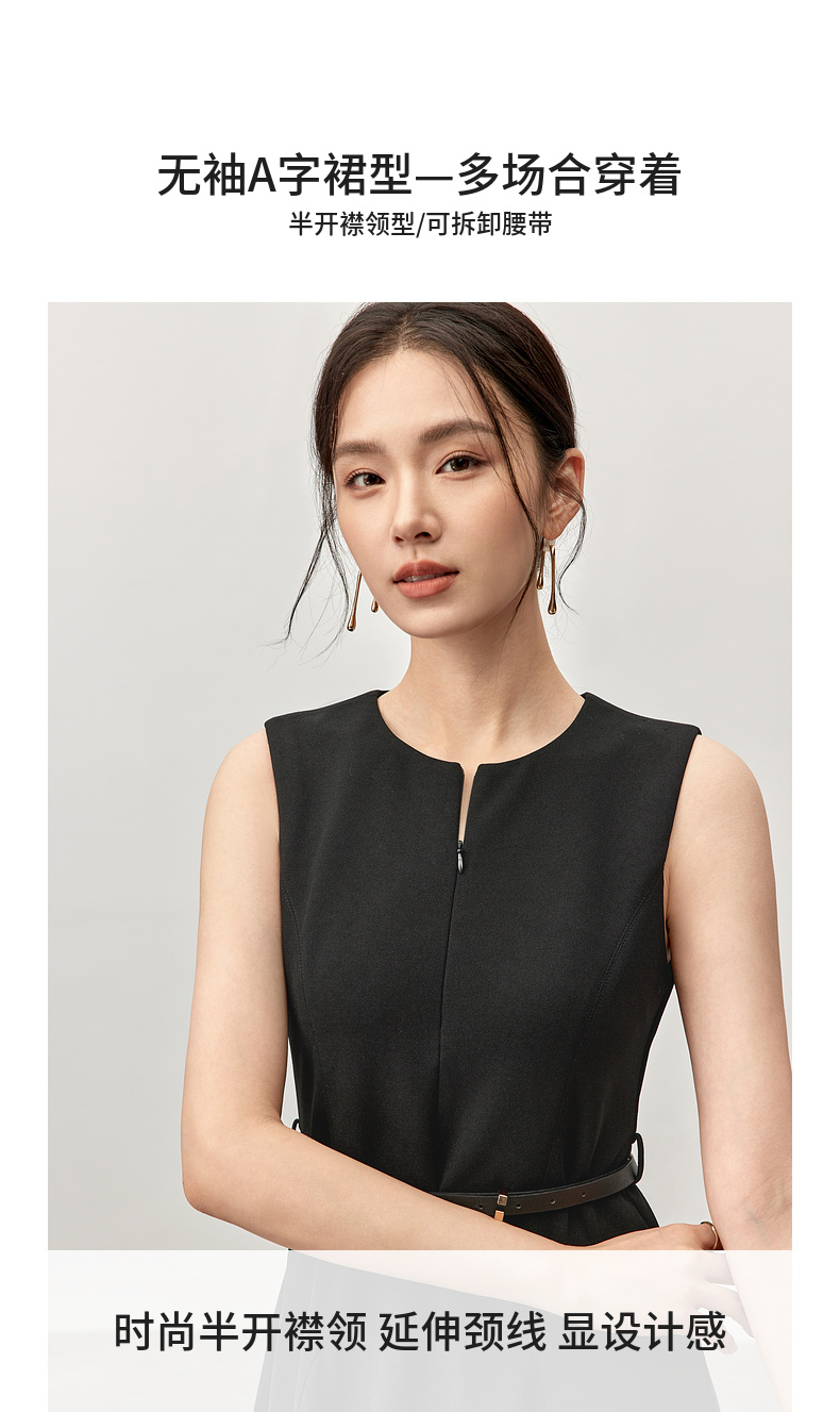 【内购】拉链半开小圆领无袖收腰显瘦气质背心连衣裙长款黑色赫本风裙子-151L57383