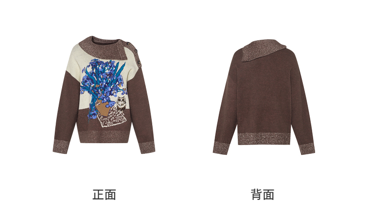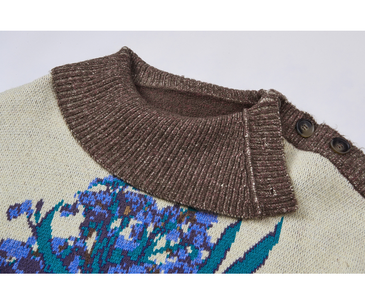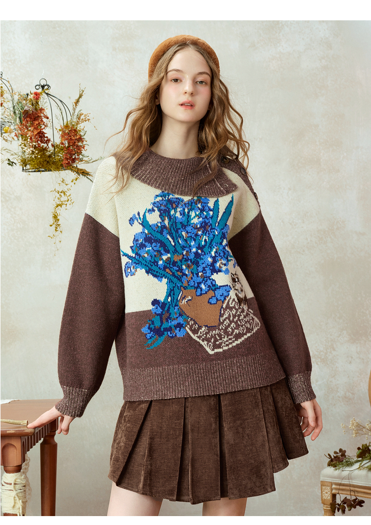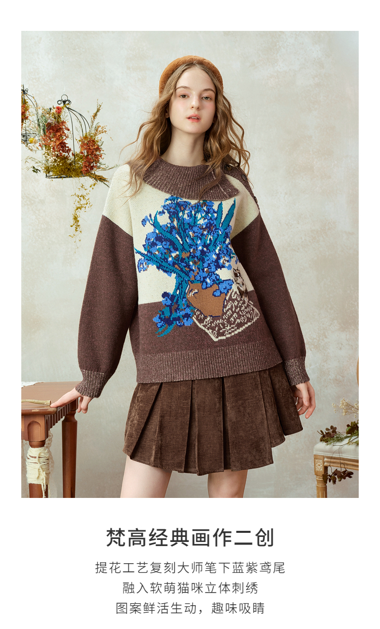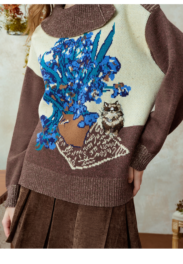 两三事梵高文艺捕风花影2025冬季新款拼色翻领提花刺绣毛衣女宽松