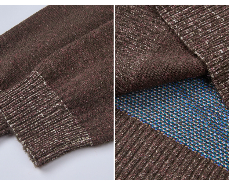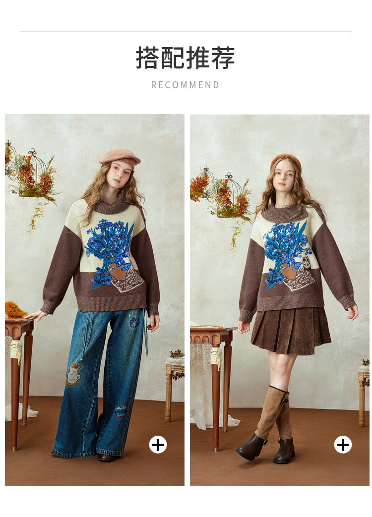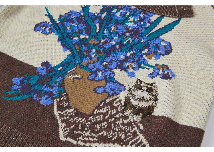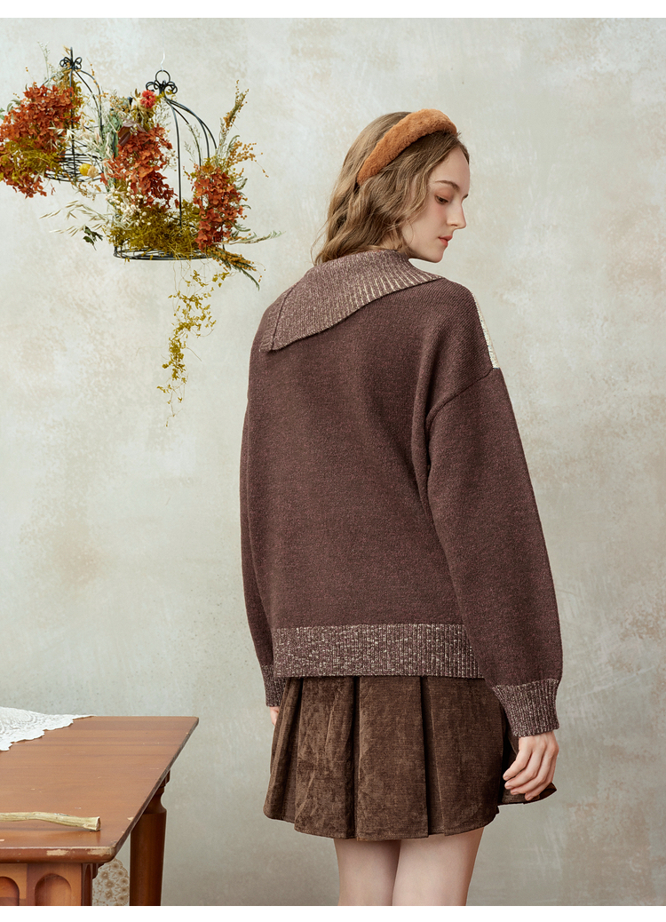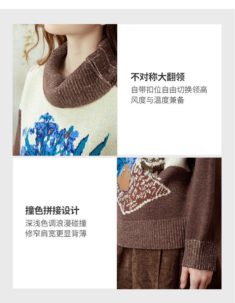 两三事梵高文艺捕风花影2025冬季新款拼色翻领提花刺绣毛衣女宽松