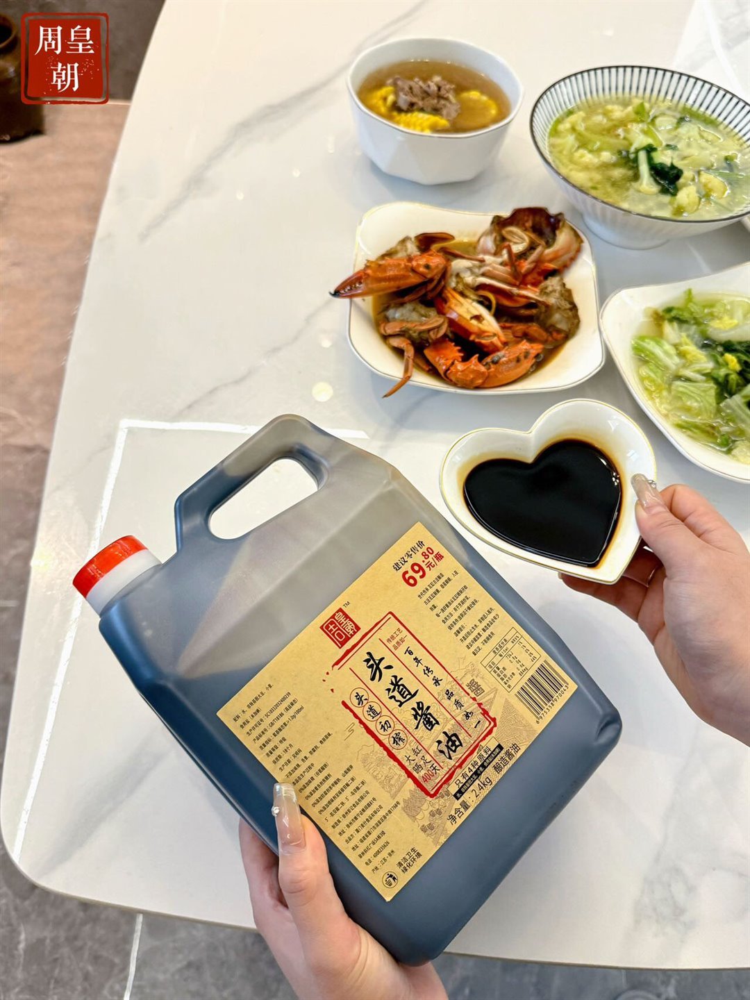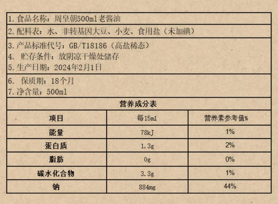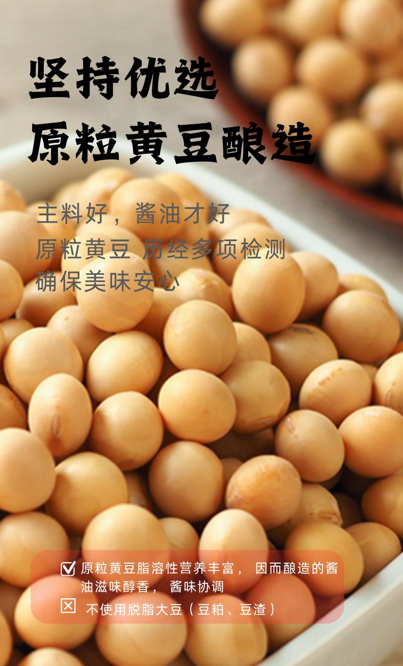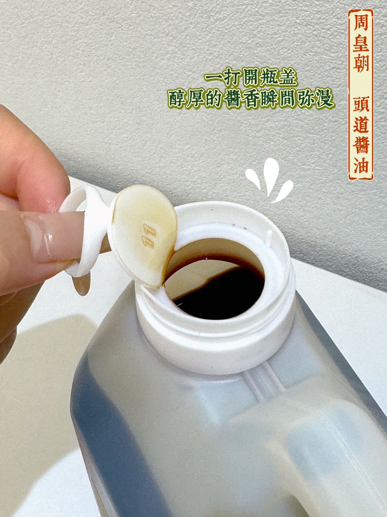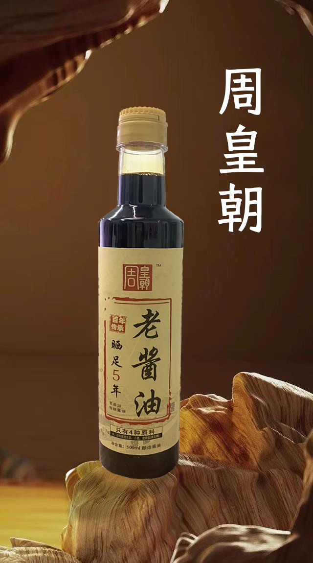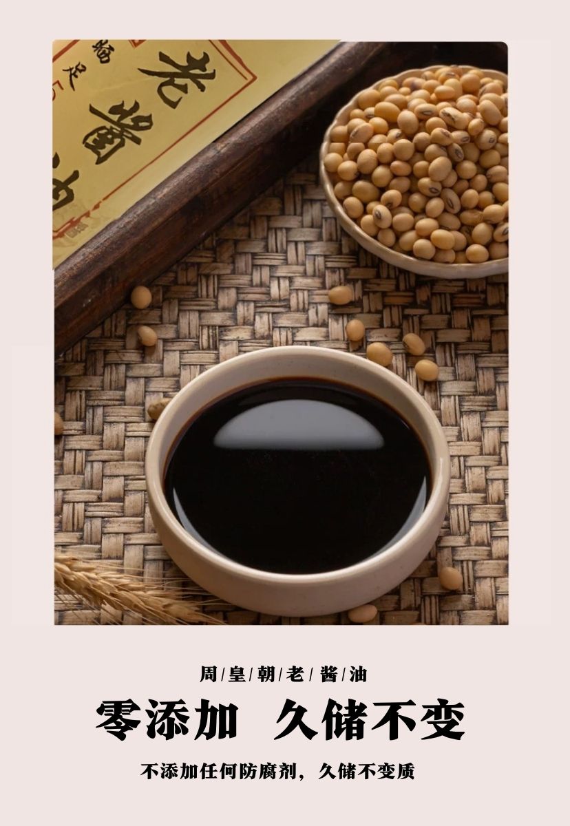 晒足400天 头道酱油 周皇朝 大缸酿造工艺;头道初榨 原始风味;无添加味精、防腐剂、着色剂等;鲜香味美