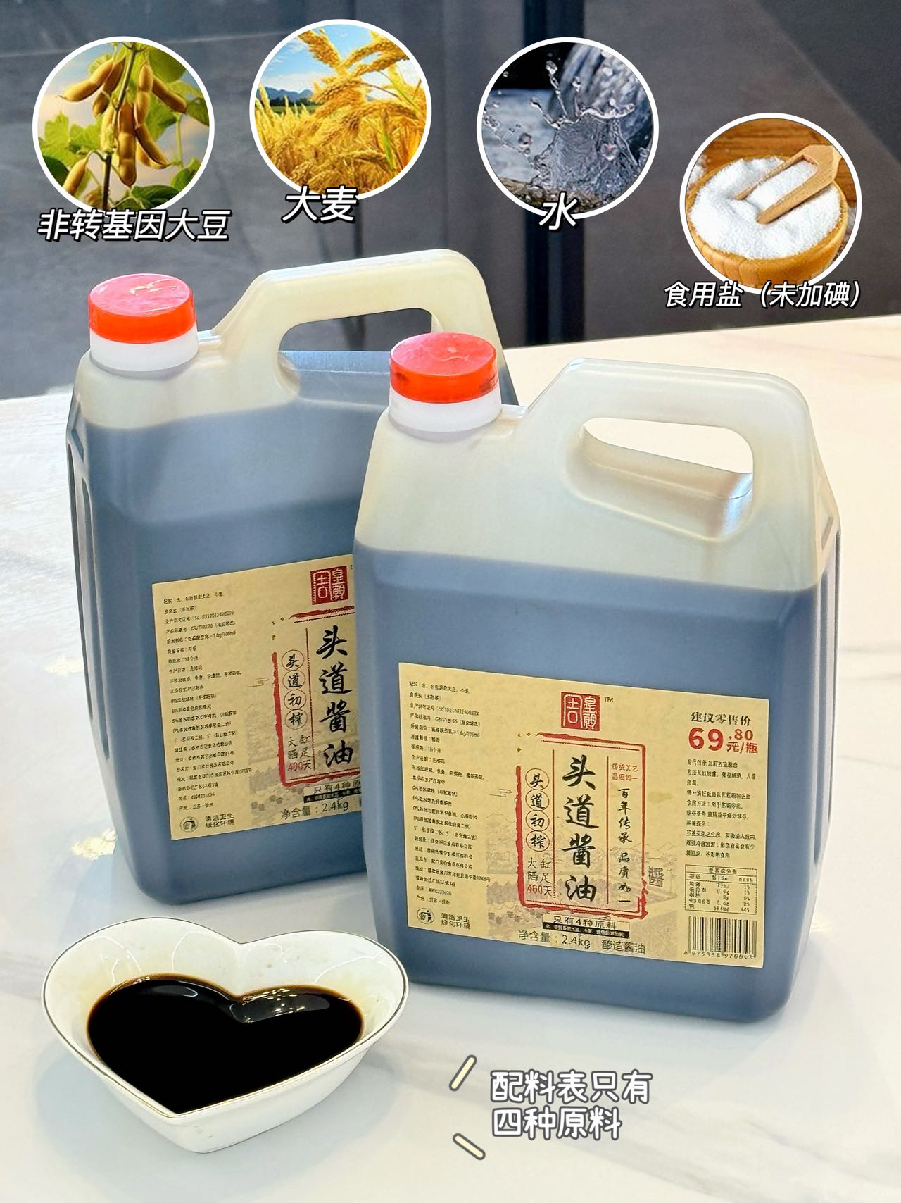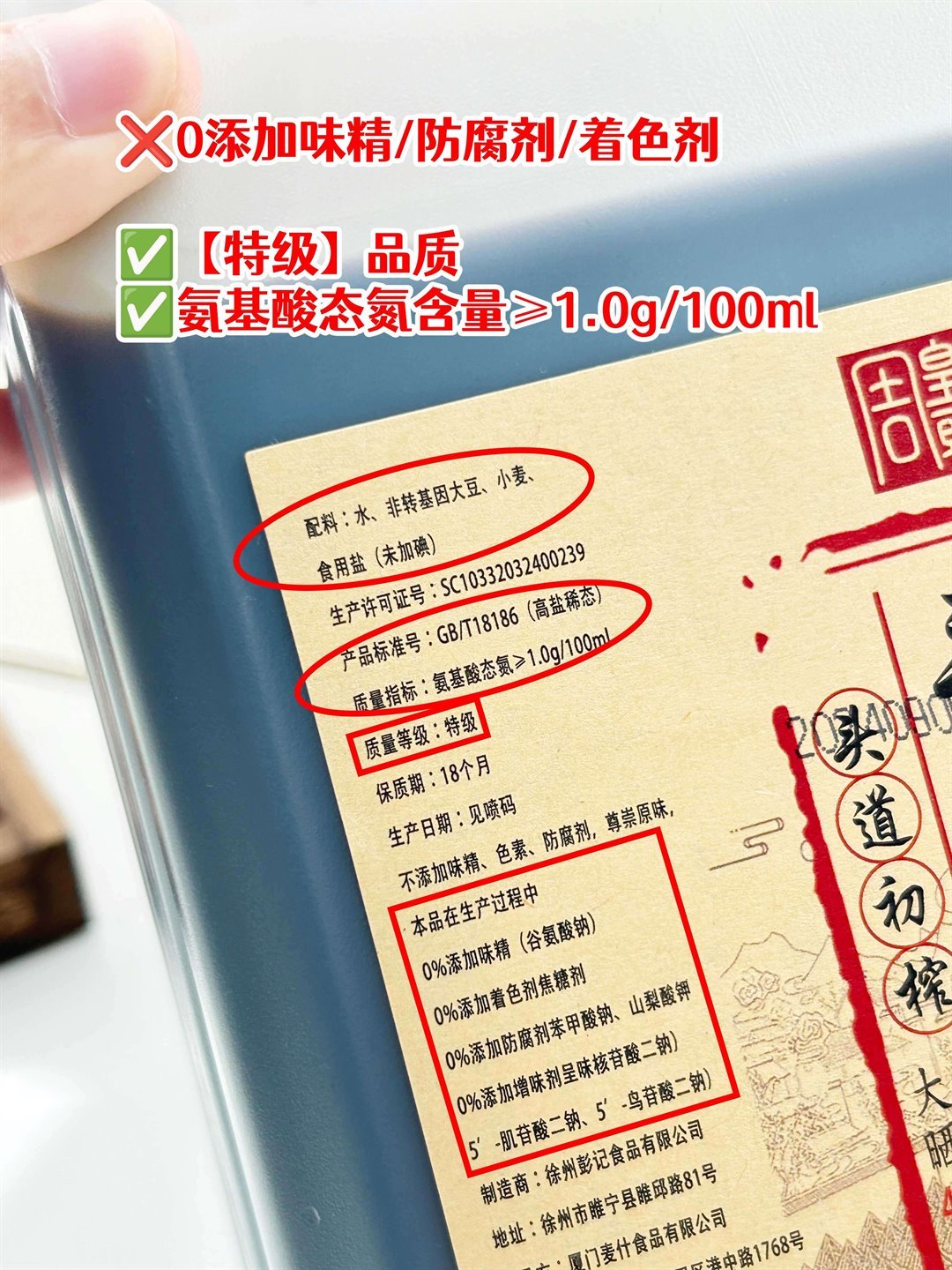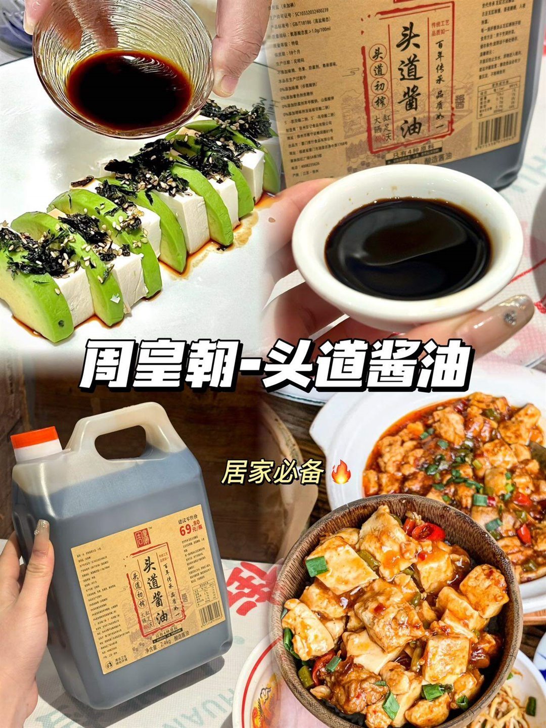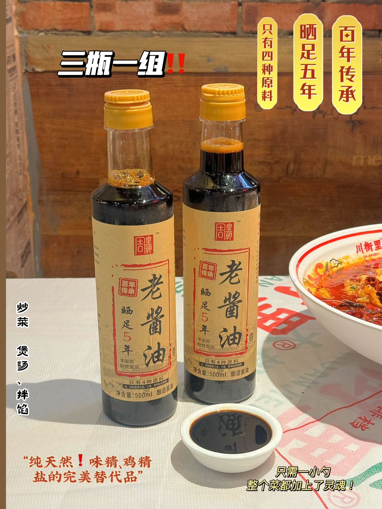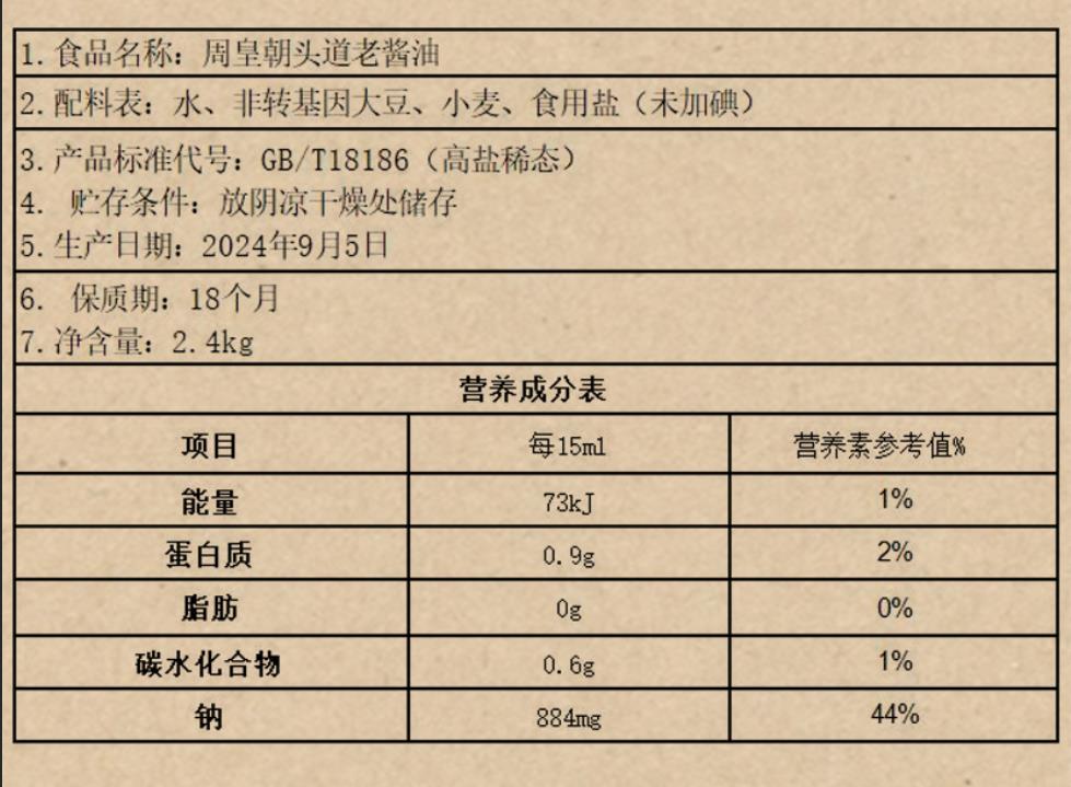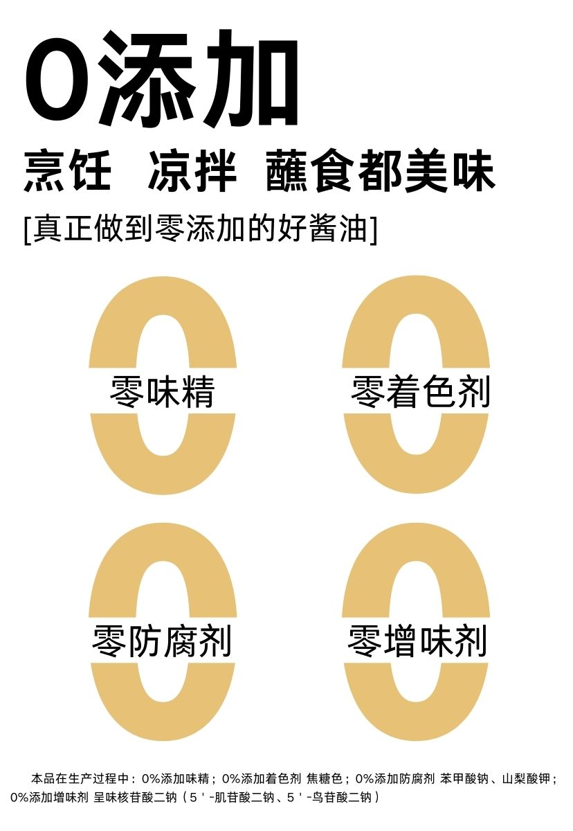 晒足400天 头道酱油 周皇朝 大缸酿造工艺;头道初榨 原始风味;无添加味精、防腐剂、着色剂等;鲜香味美