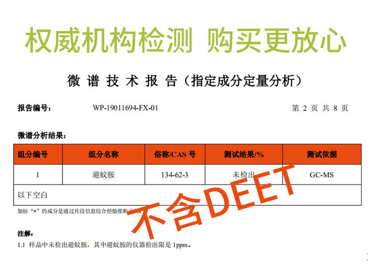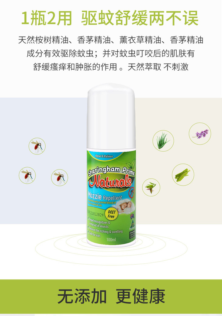 不含DEET化学物质,成分精简且硬核,由:桉树精油+香茅精油+薰衣草精油+芦荟油组成!安全到全家上下都能用!精油成分喷洒在皮肤上,缓慢挥发,对皮肤形成4小时的保护圈,只驱蚊,不杀蚊,以气味驱逐蚊虫,同时植物精油成分不仅不会对皮肤造成伤害,反而还有舒缓皮肤的功效,不慎被蚊虫叮咬形成的肿包,使用它也能得到缓解!