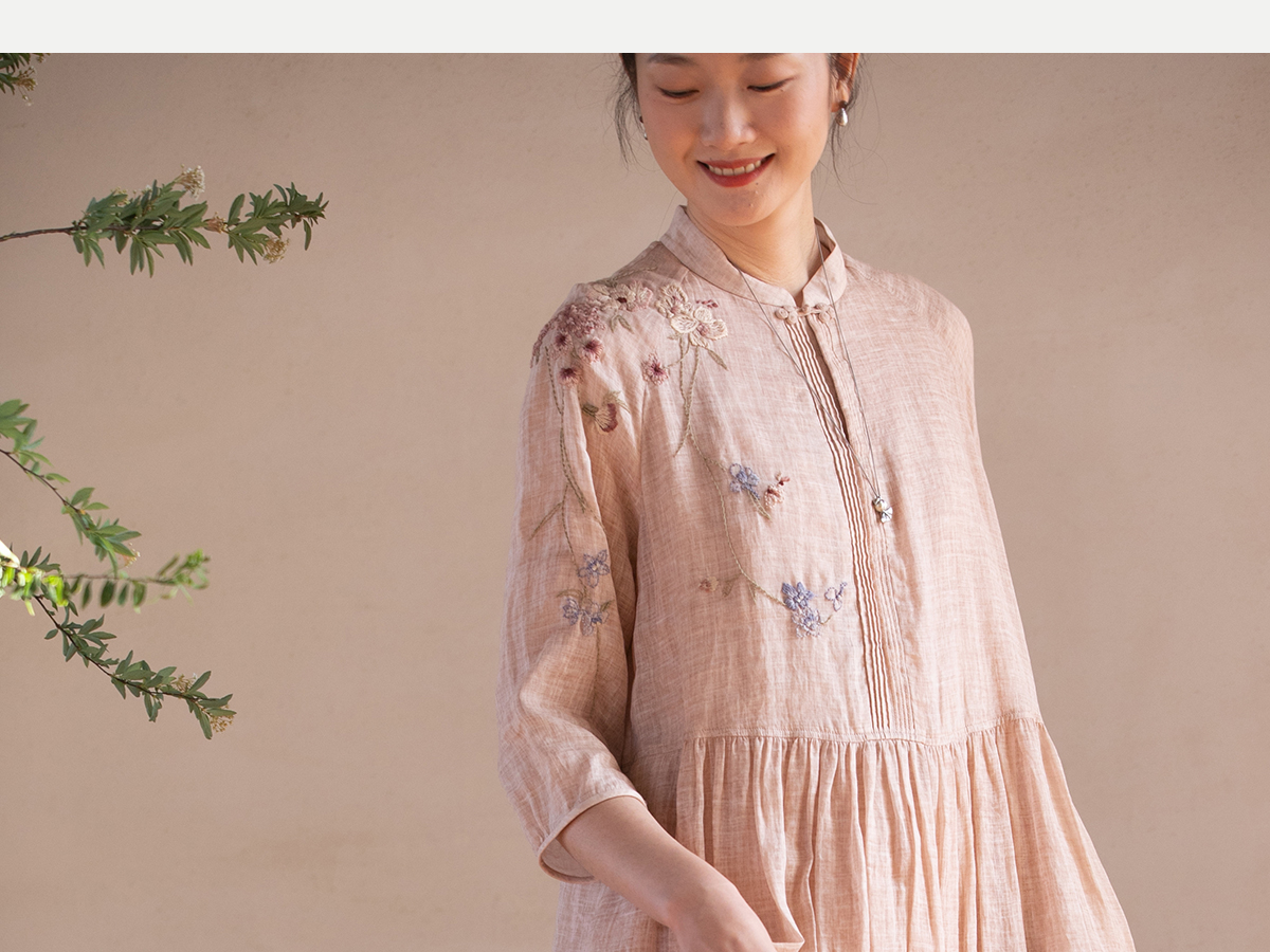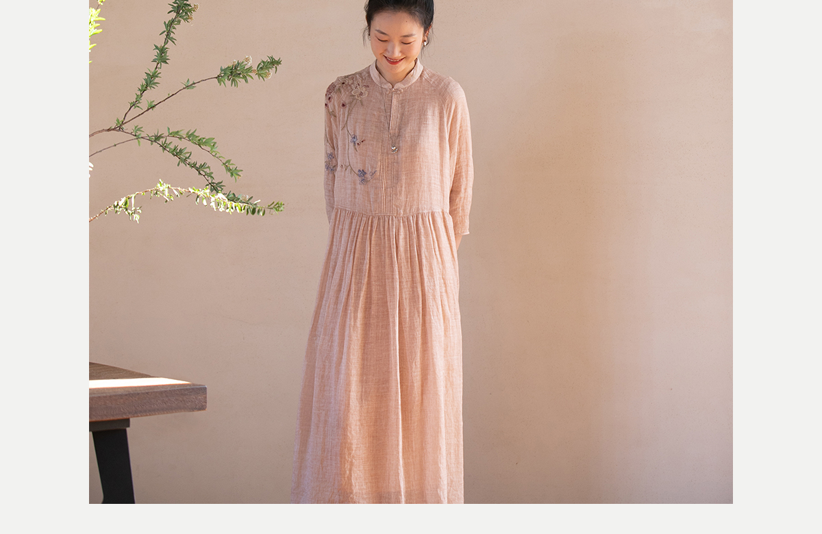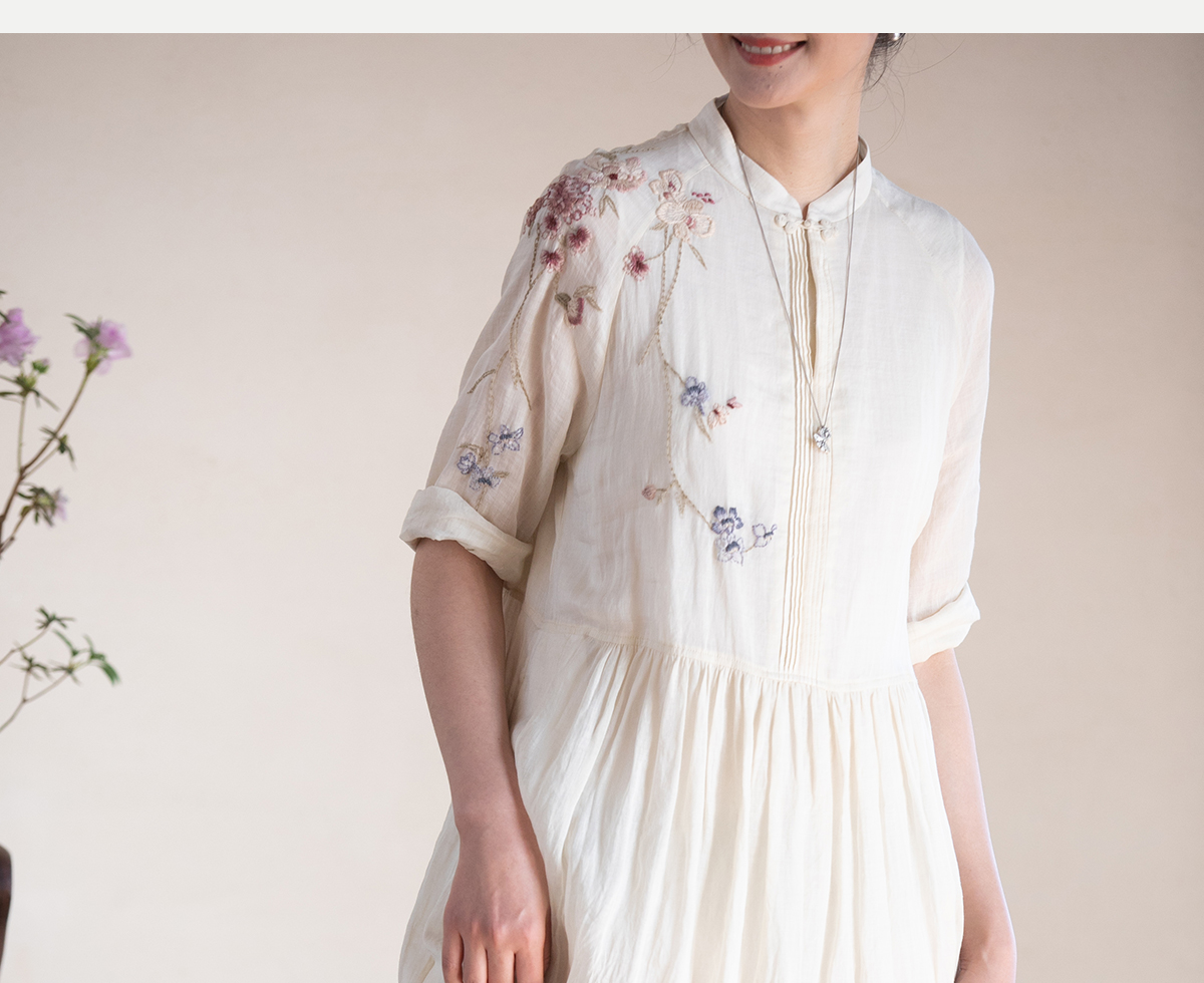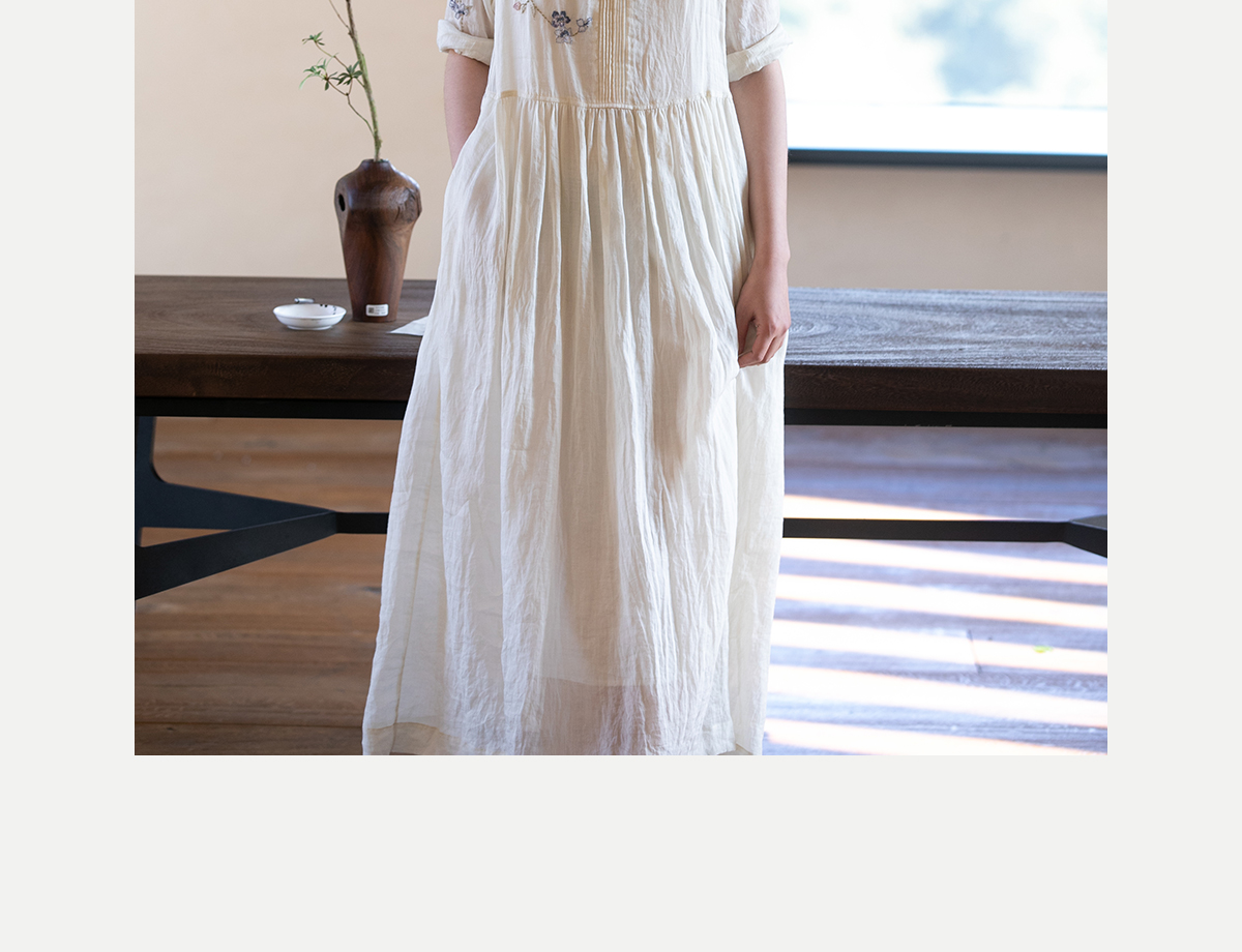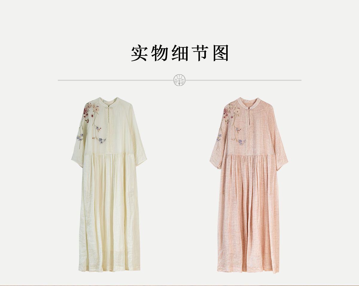牧衣游原创 手工刺绣苎麻炒色连衣裙新品轻薄文艺气质长裙 清溪