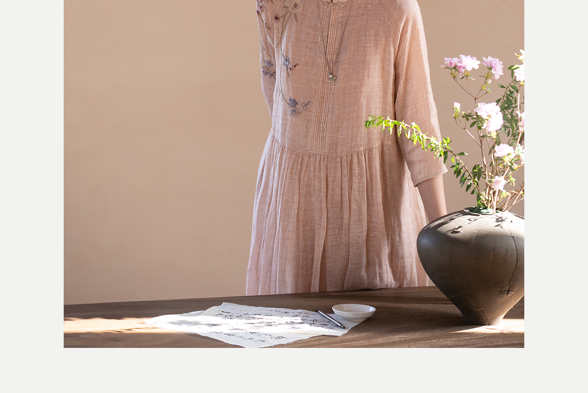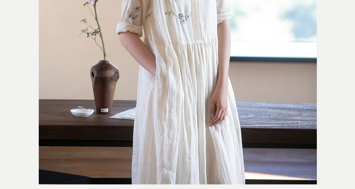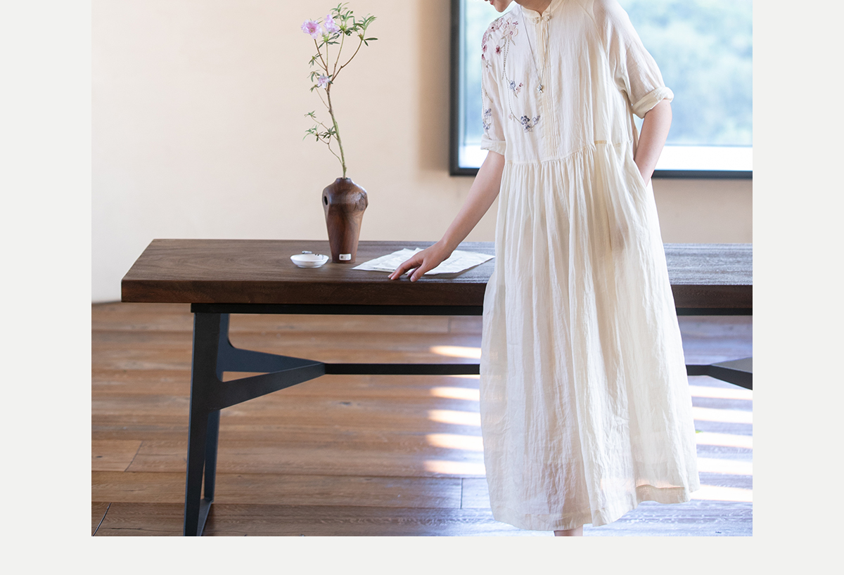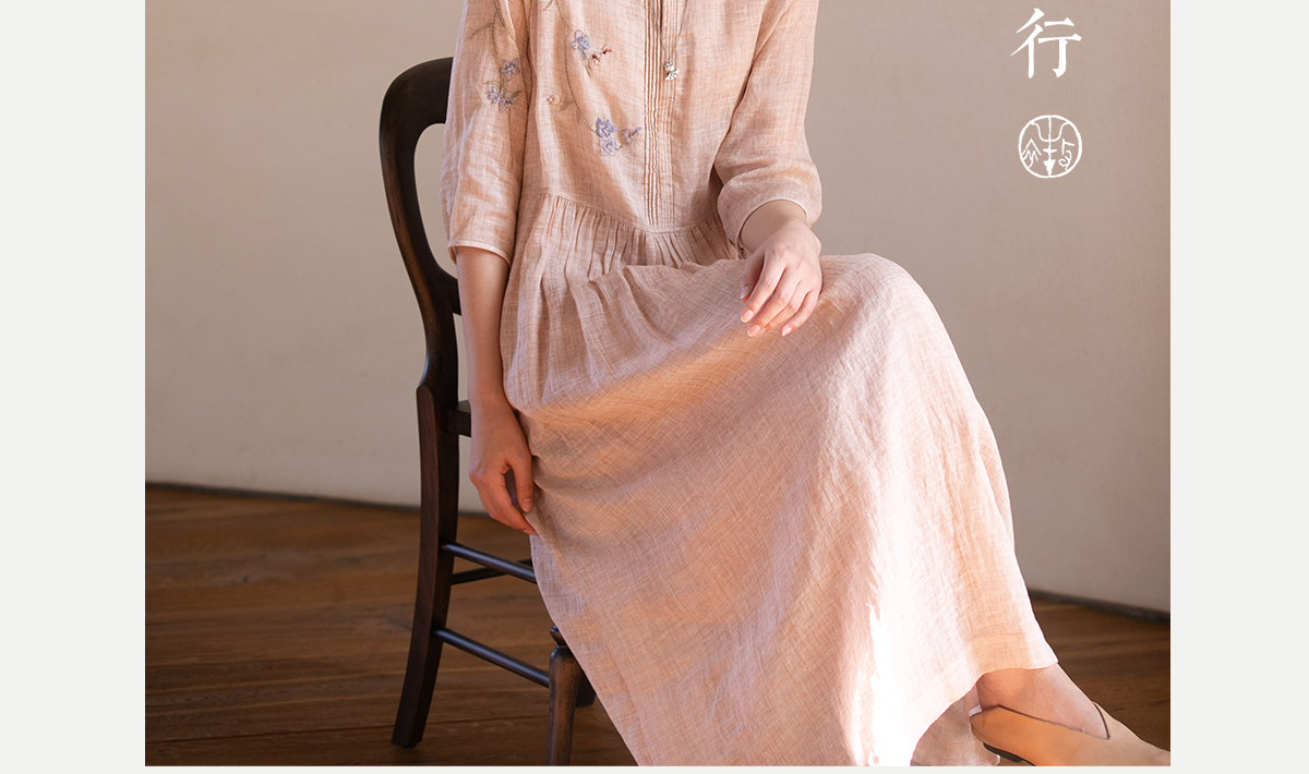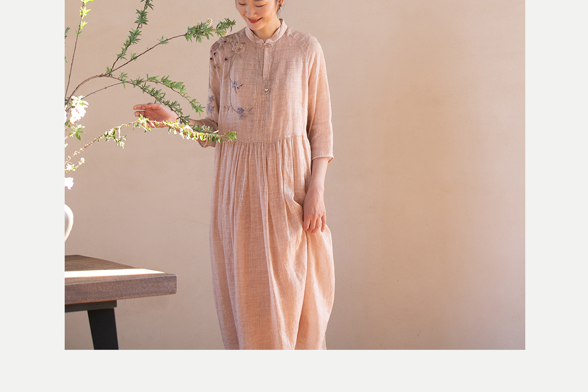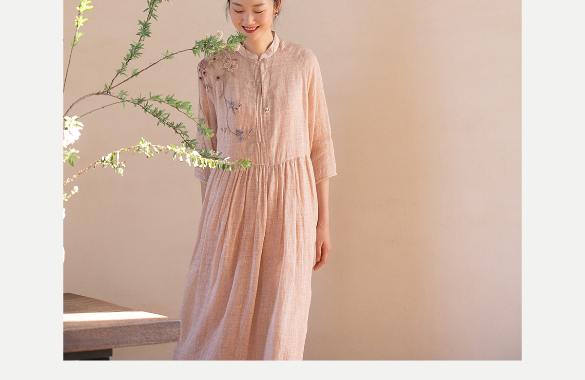 牧衣游原创 手工刺绣苎麻炒色连衣裙新品轻薄文艺气质长裙 清溪