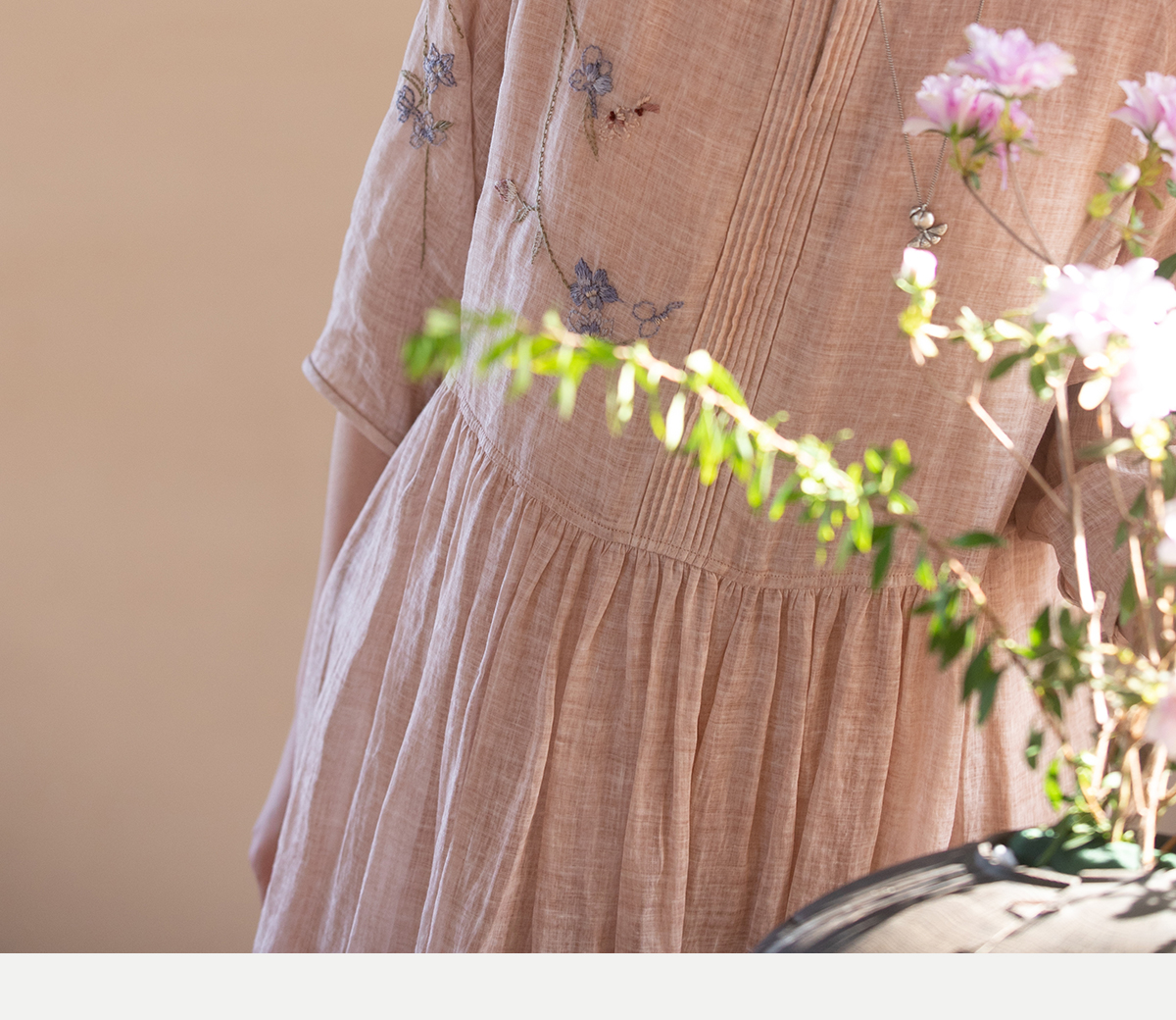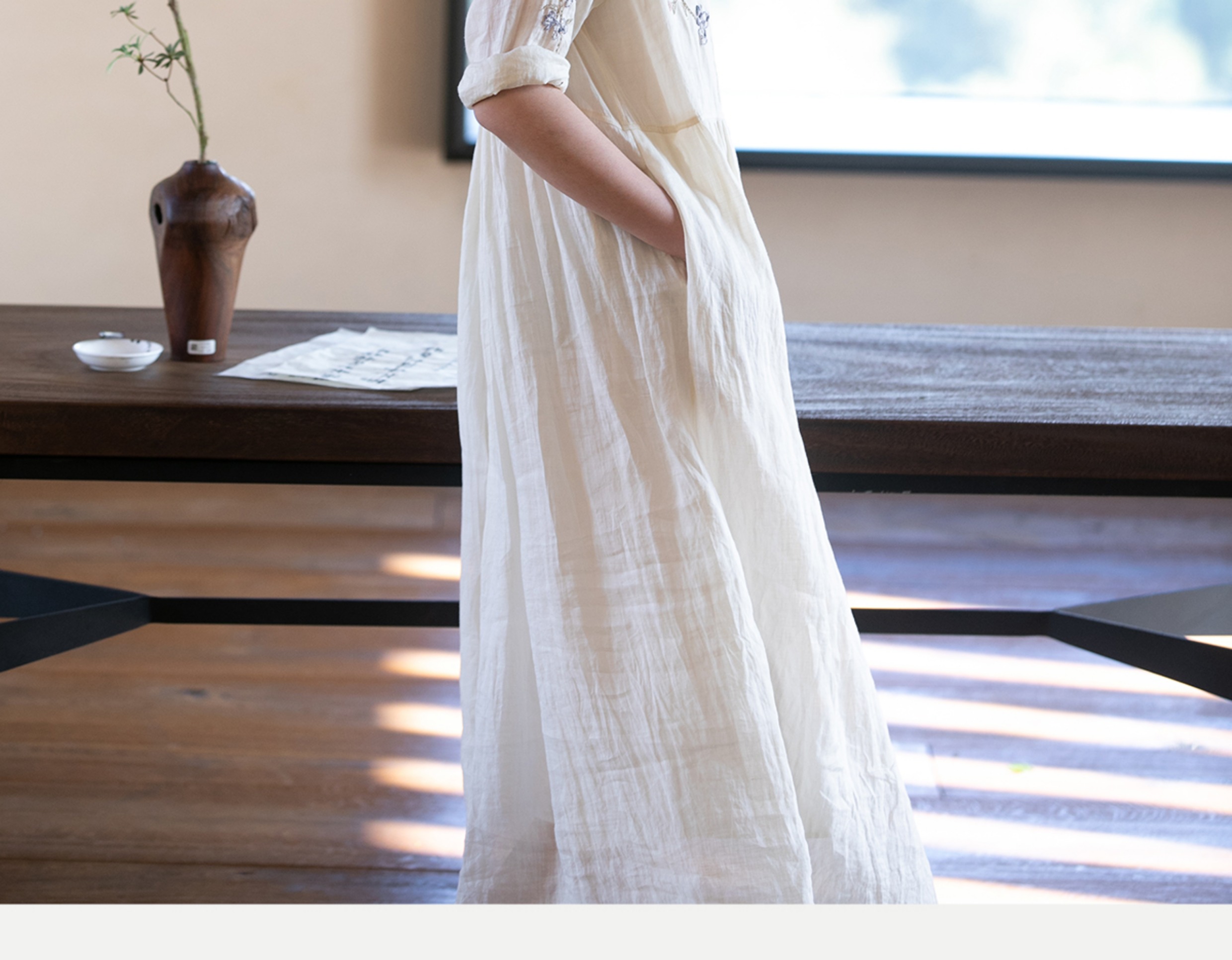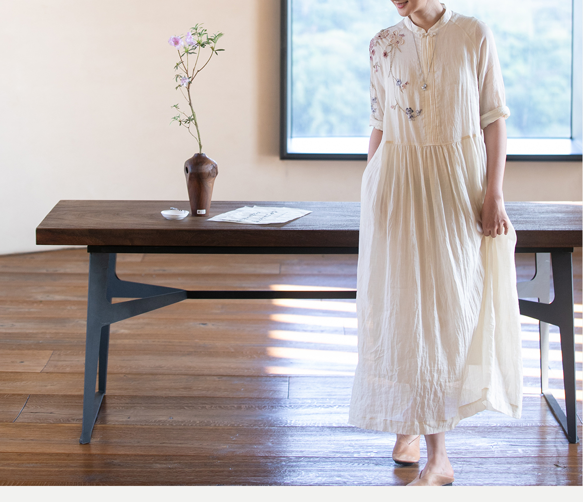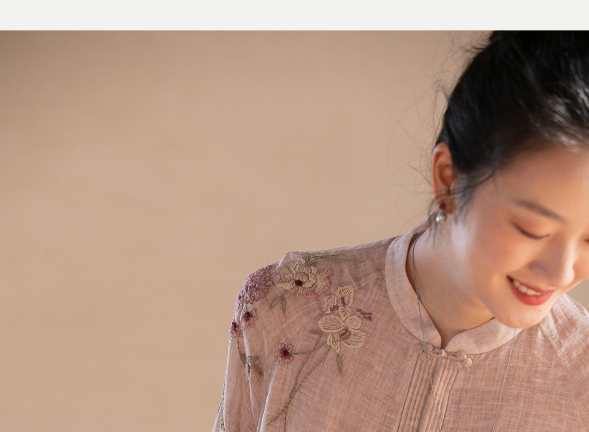 牧衣游原创 手工刺绣苎麻炒色连衣裙新品轻薄文艺气质长裙 清溪