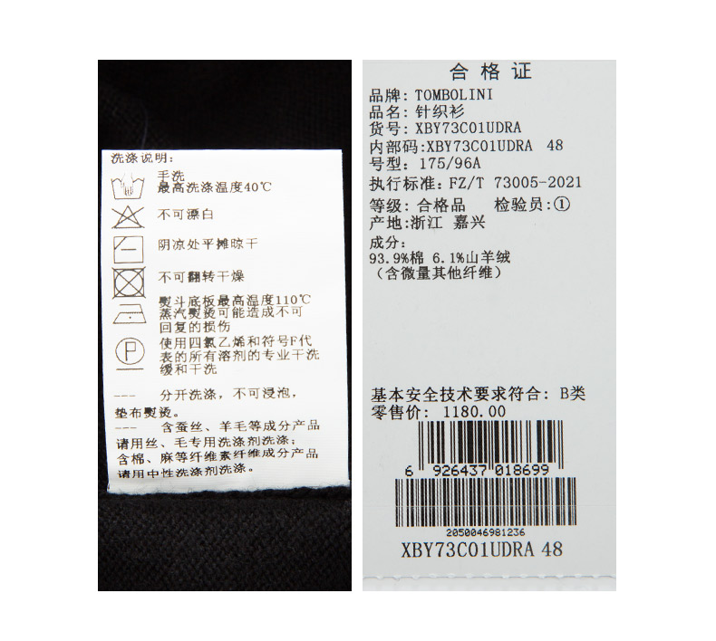 成分:;93.9%棉 6.1%山羊绒;(含微量其他纤维)