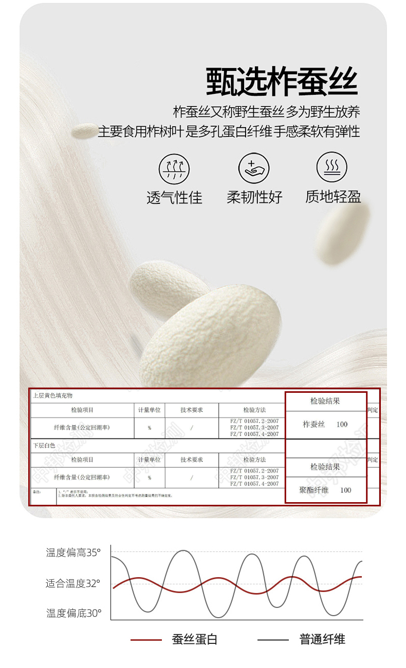 填充: 上层:100%榨蚕丝(有检测口) 下层:100%聚酯纤维