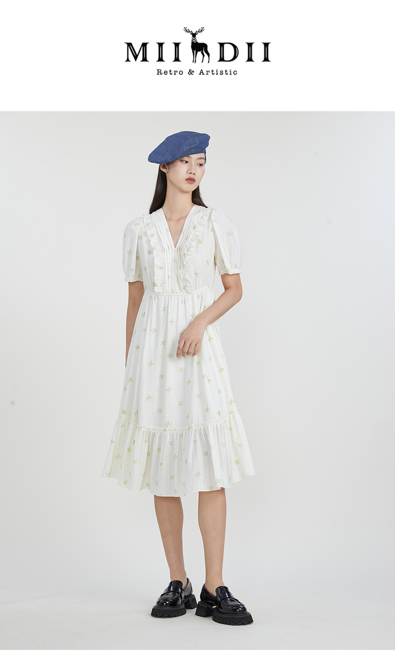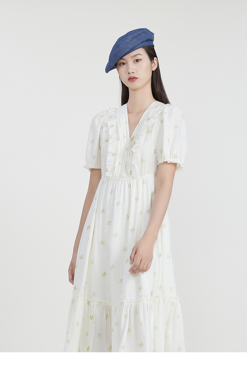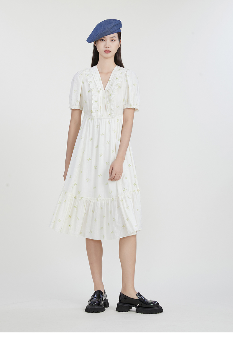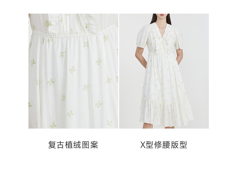谜底V领提花中长款连衣裙2023春新款小清新荷叶边裙短袖231ML0134