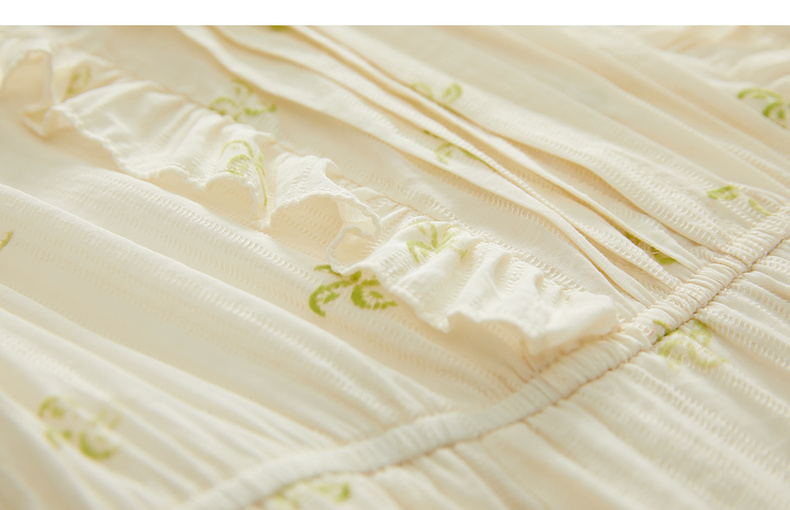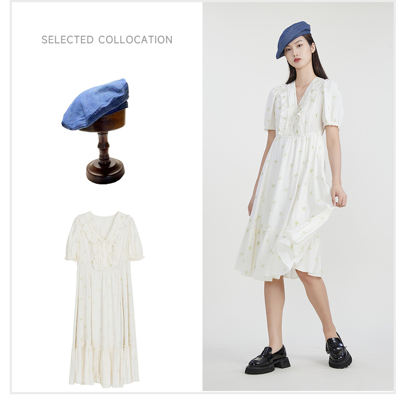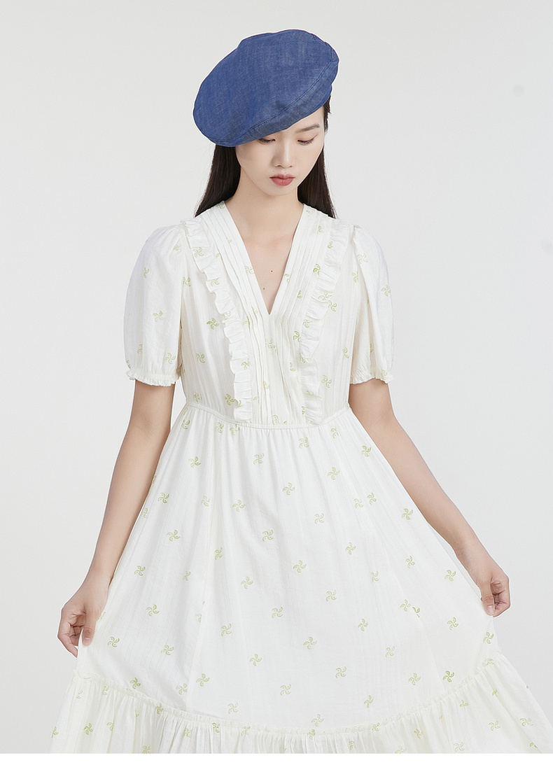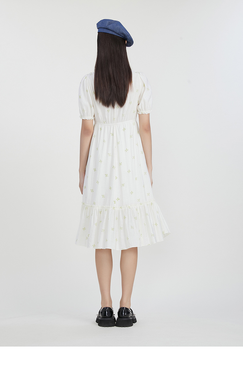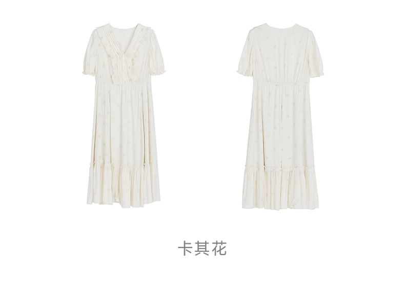 谜底V领提花中长款连衣裙2023春新款小清新荷叶边裙短袖231ML0134