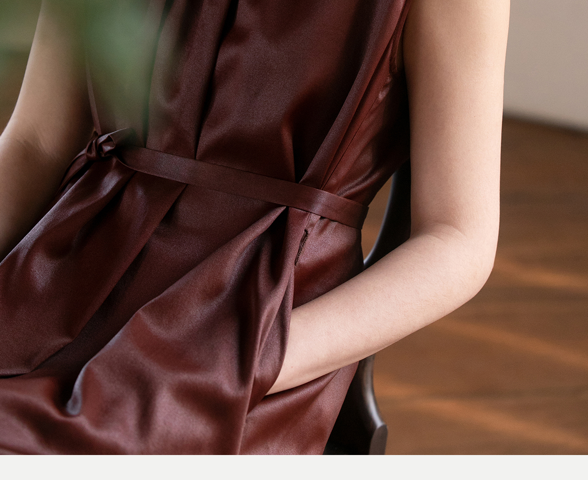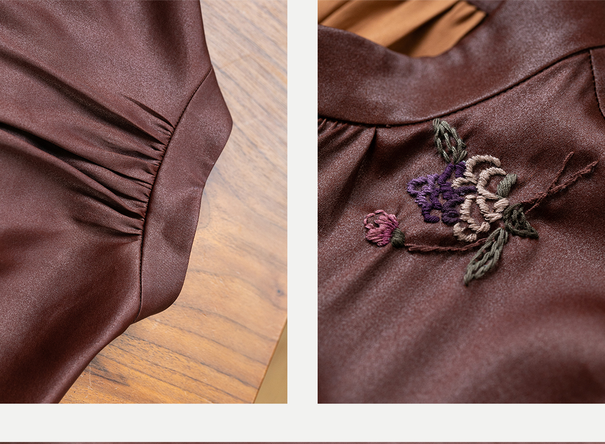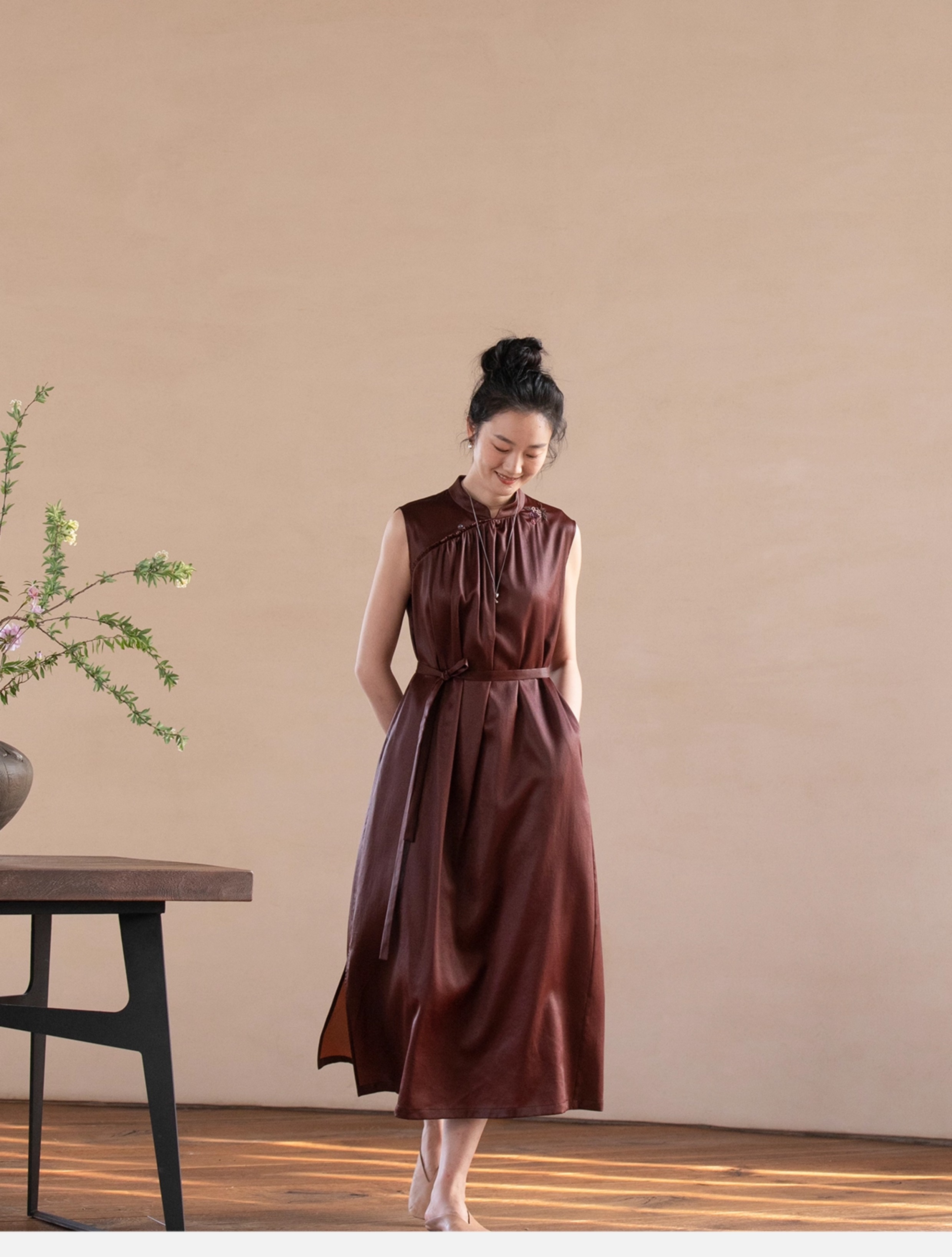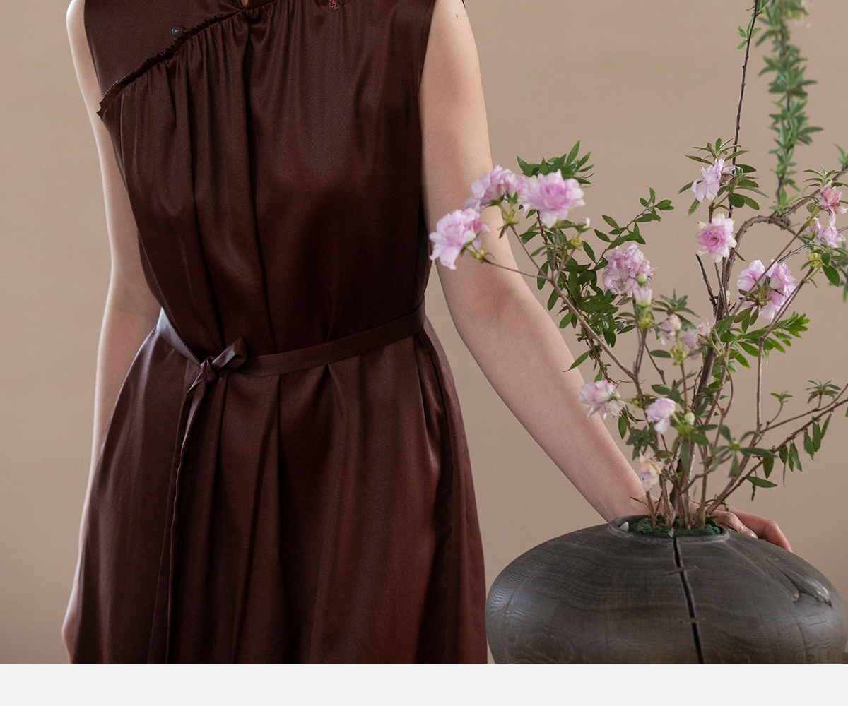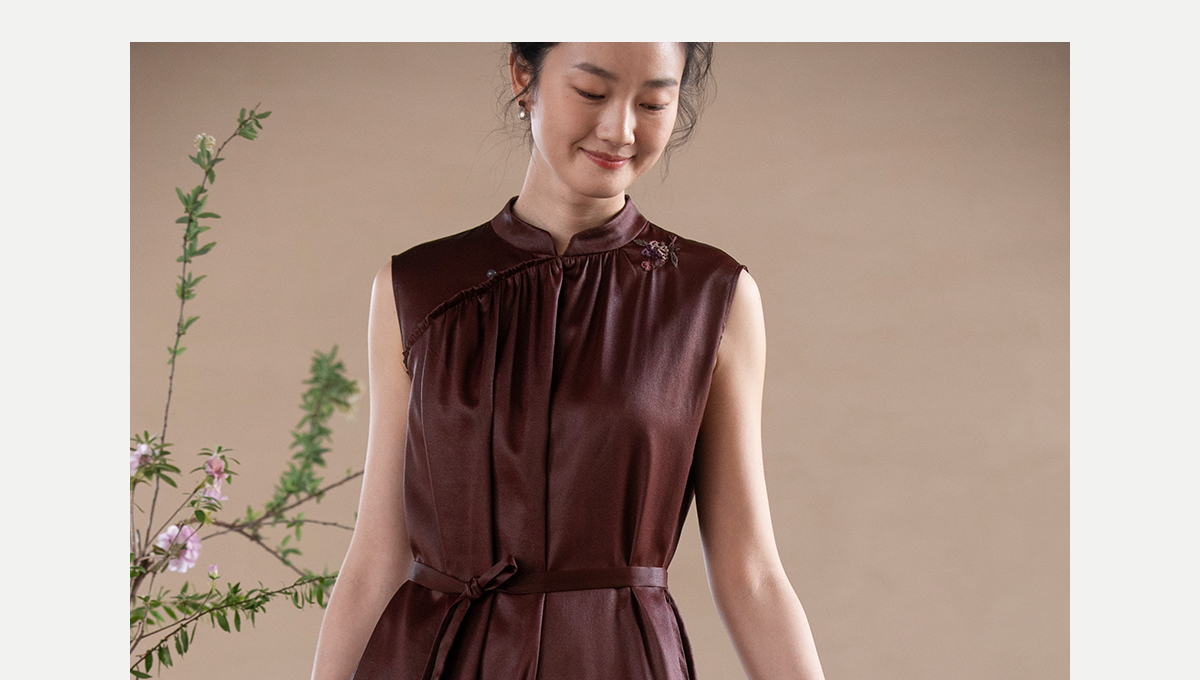 牧衣游原创 醇正薯莨红云纱手工刺绣连衣裙气质无袖长裙 洛木花