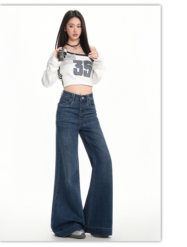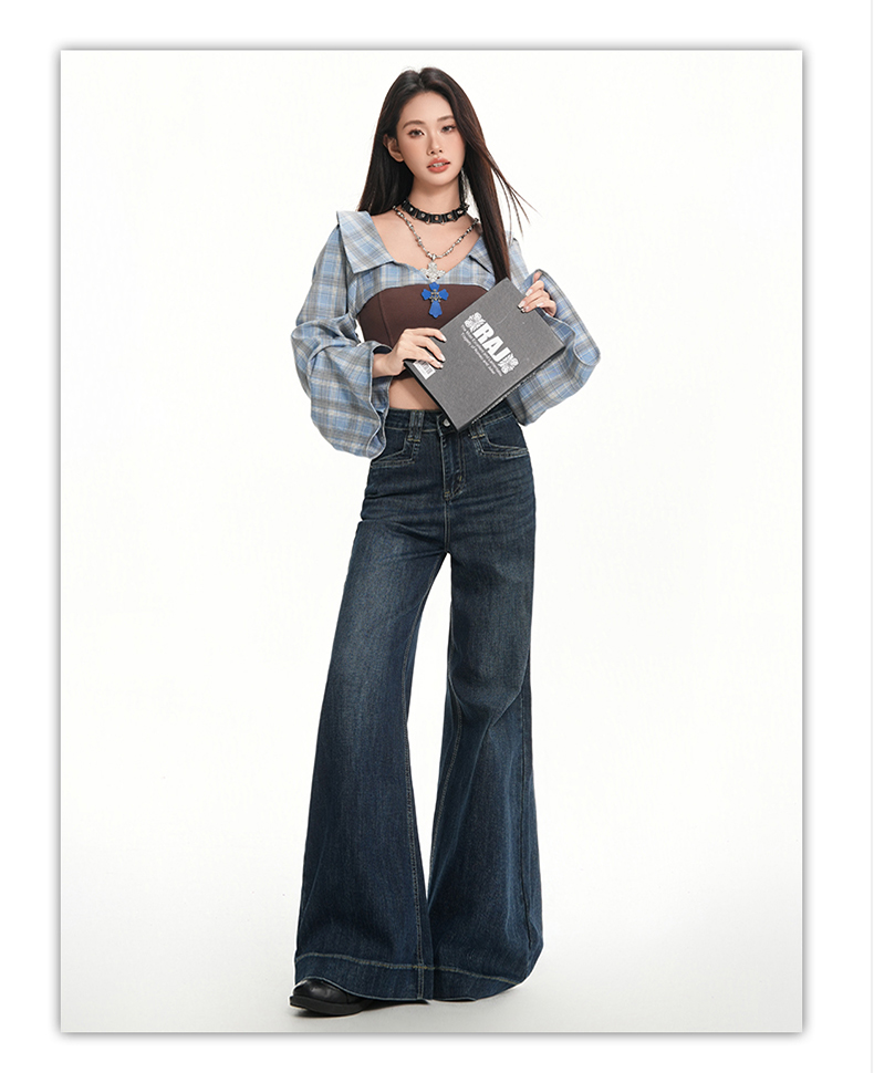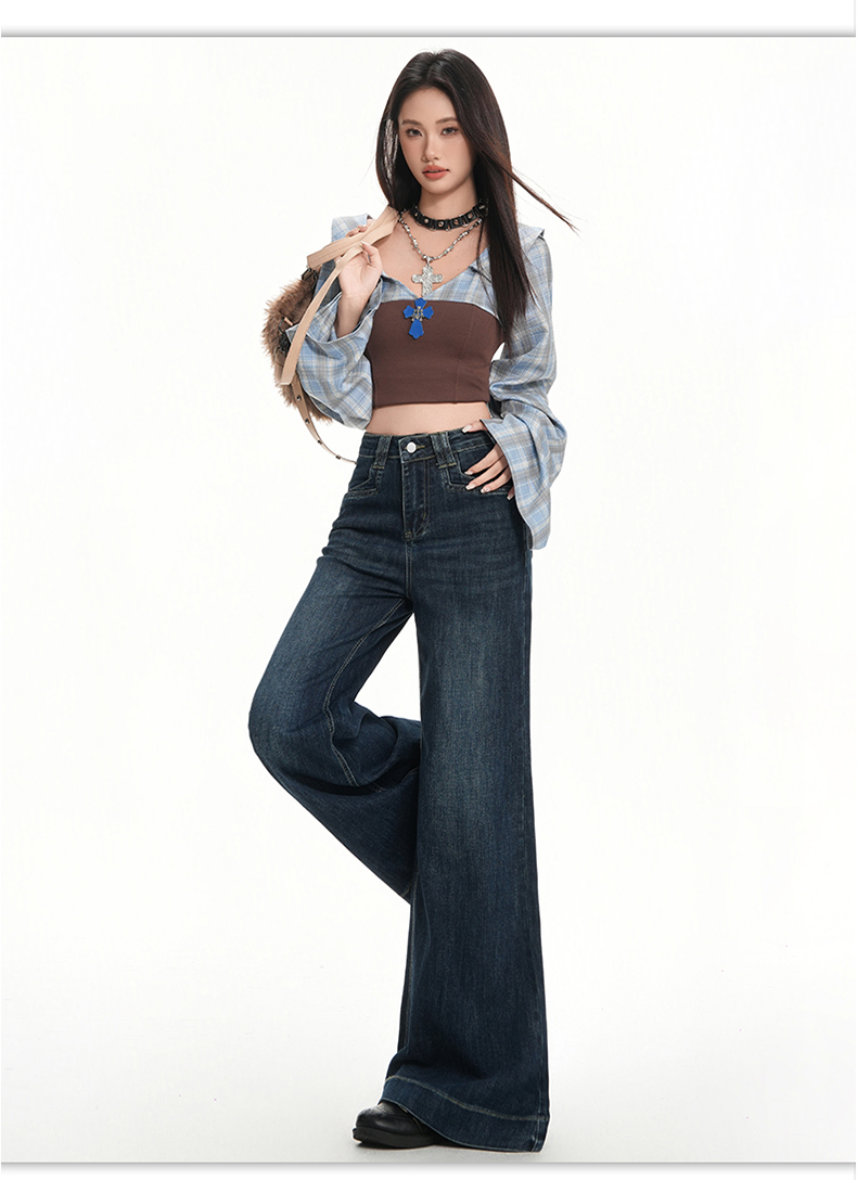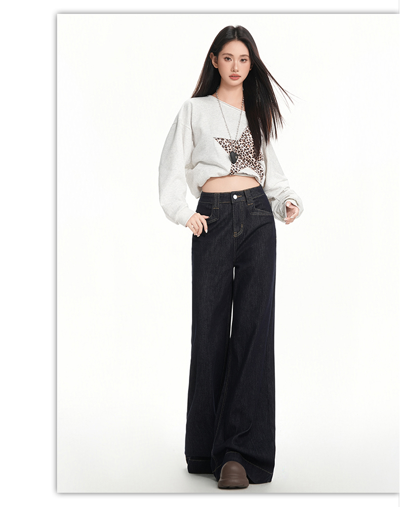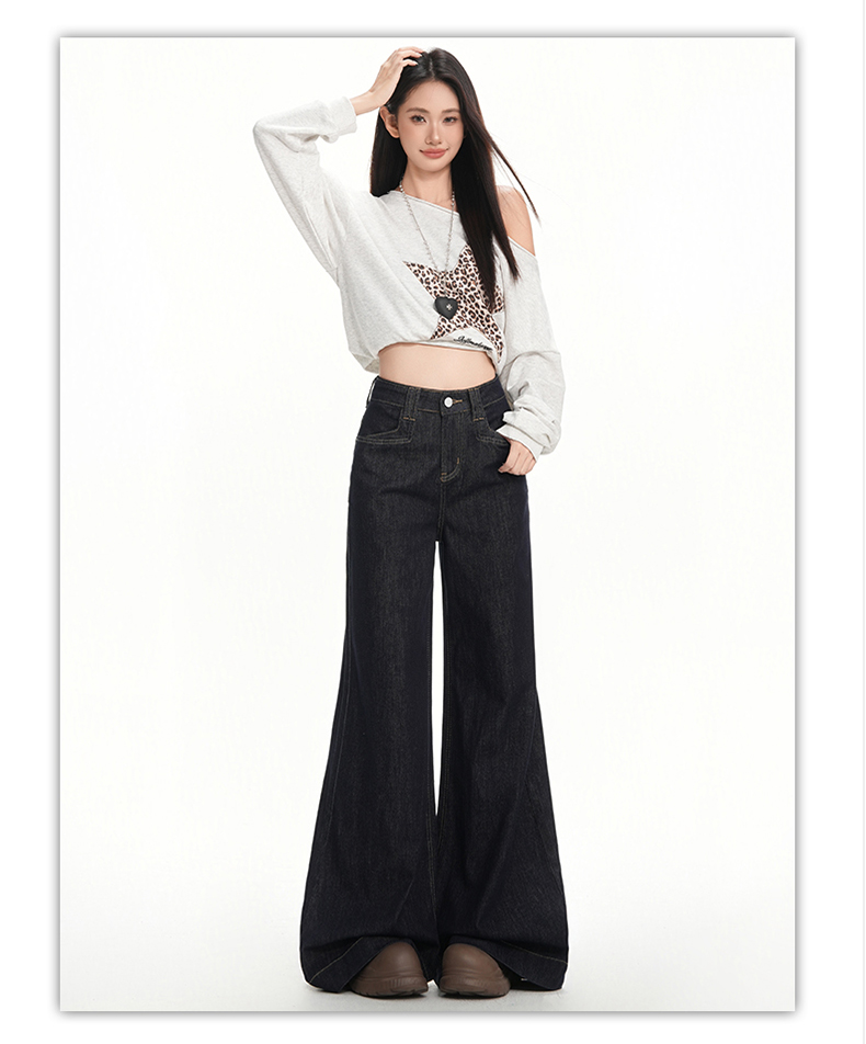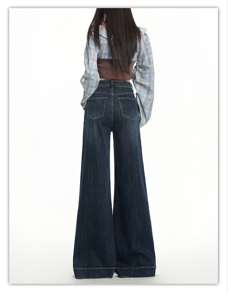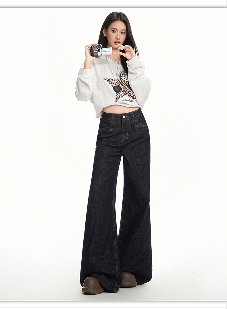 罗蒙秋冬美式复古女士牛仔裤深色高腰喇叭裤宽松显瘦阔腿拖地长裤