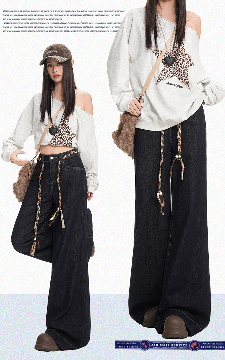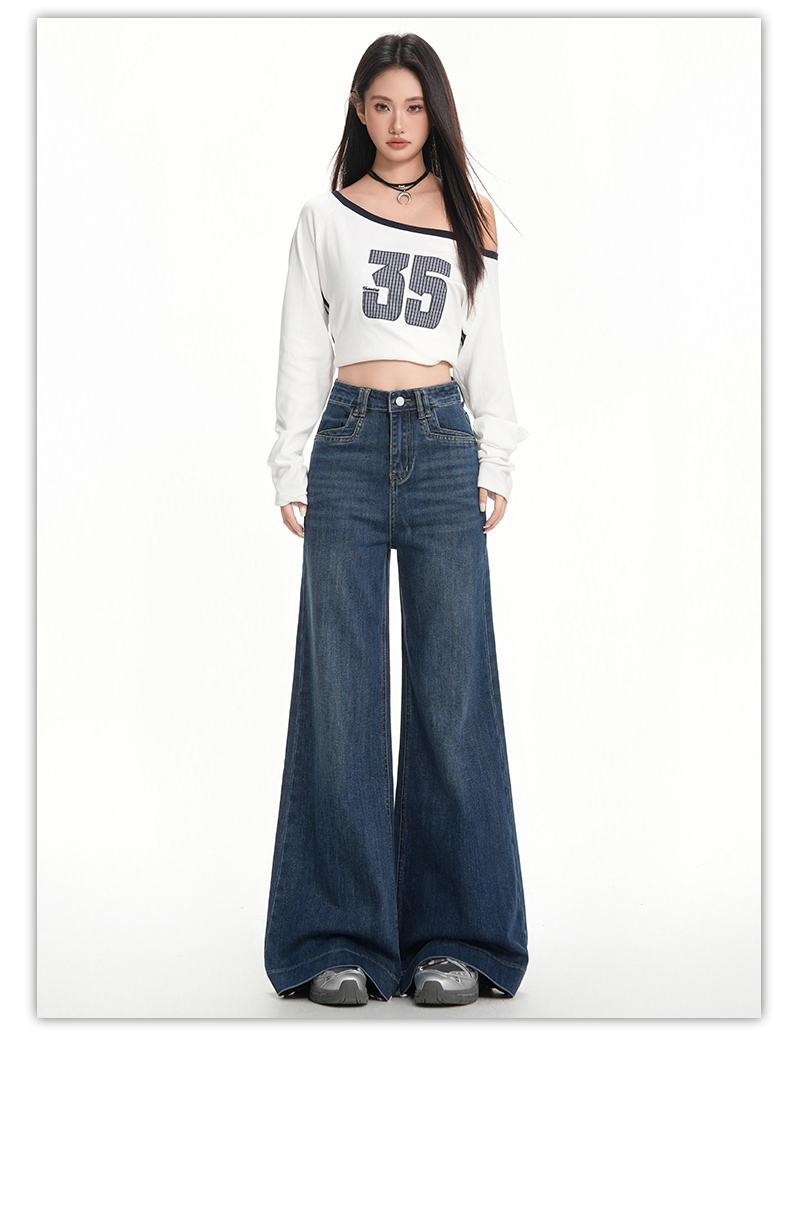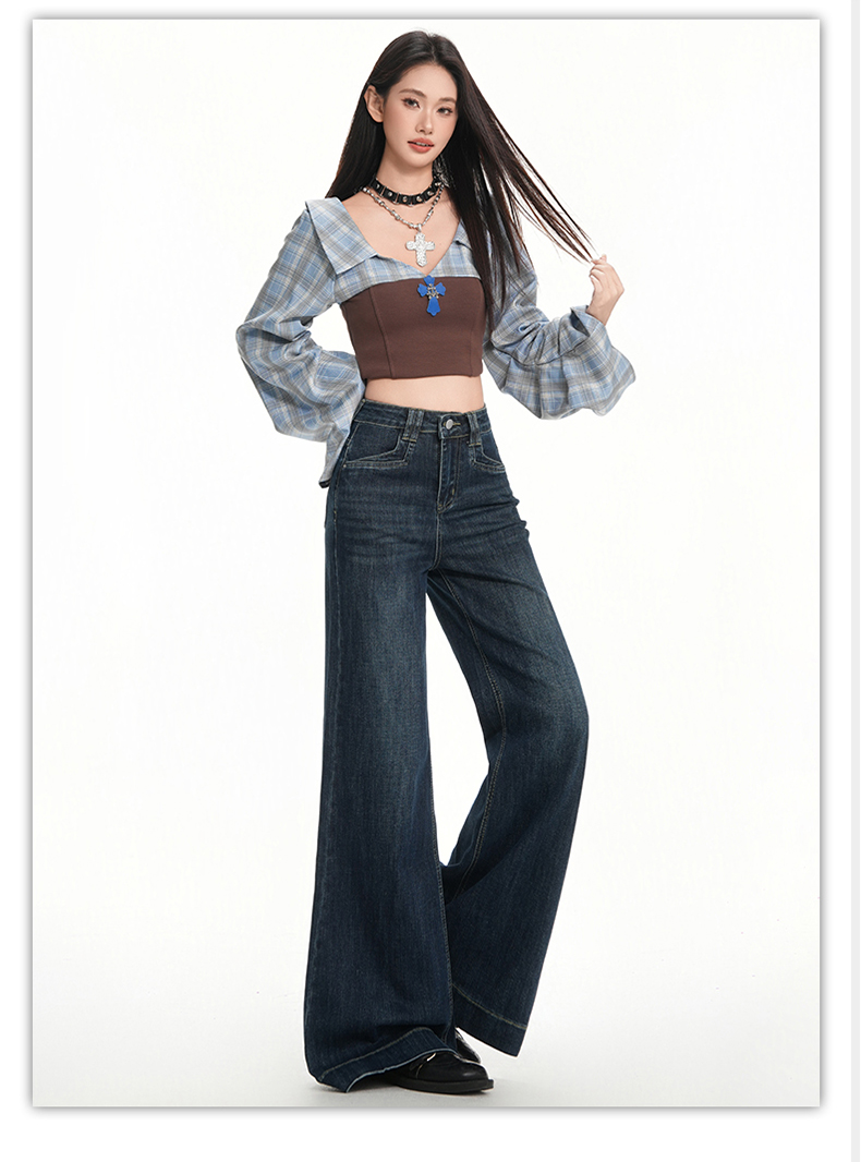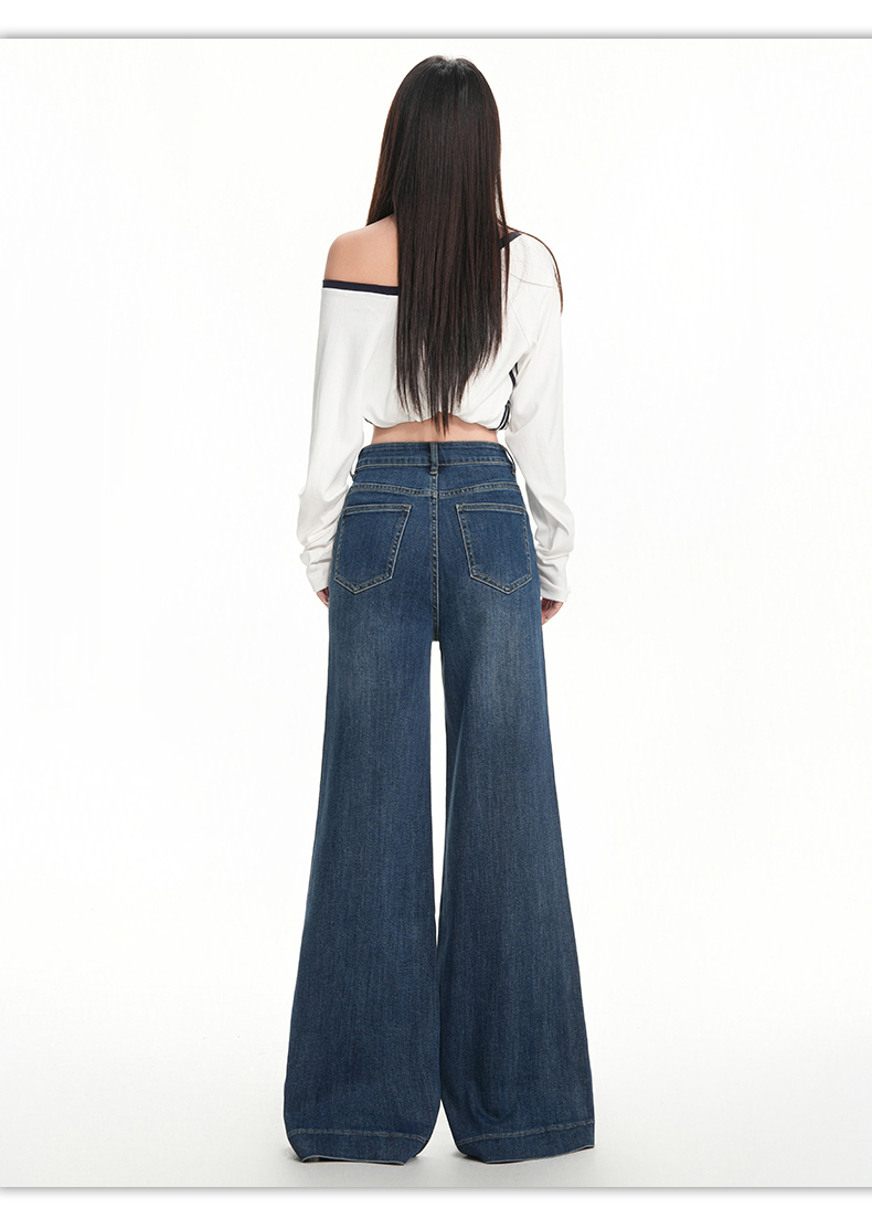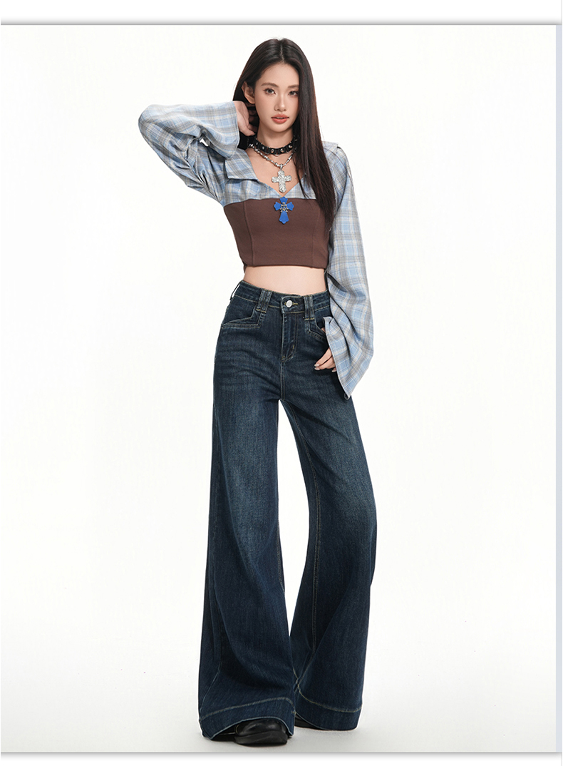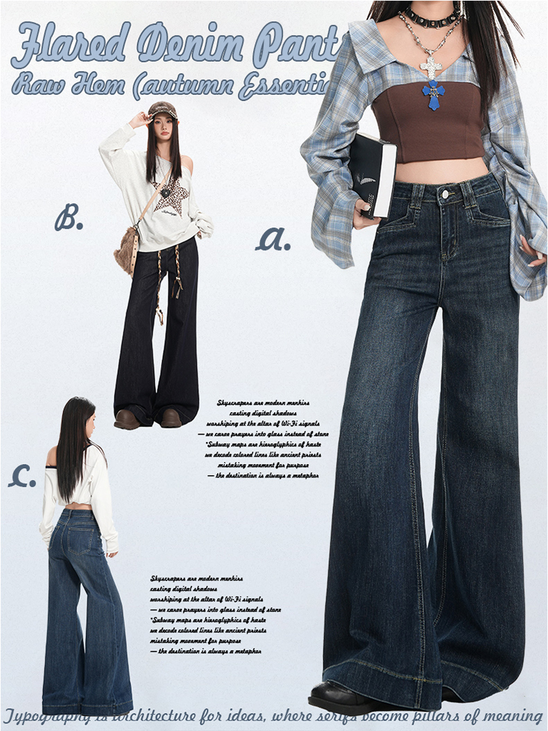 罗蒙秋冬美式复古女士牛仔裤深色高腰喇叭裤宽松显瘦阔腿拖地长裤