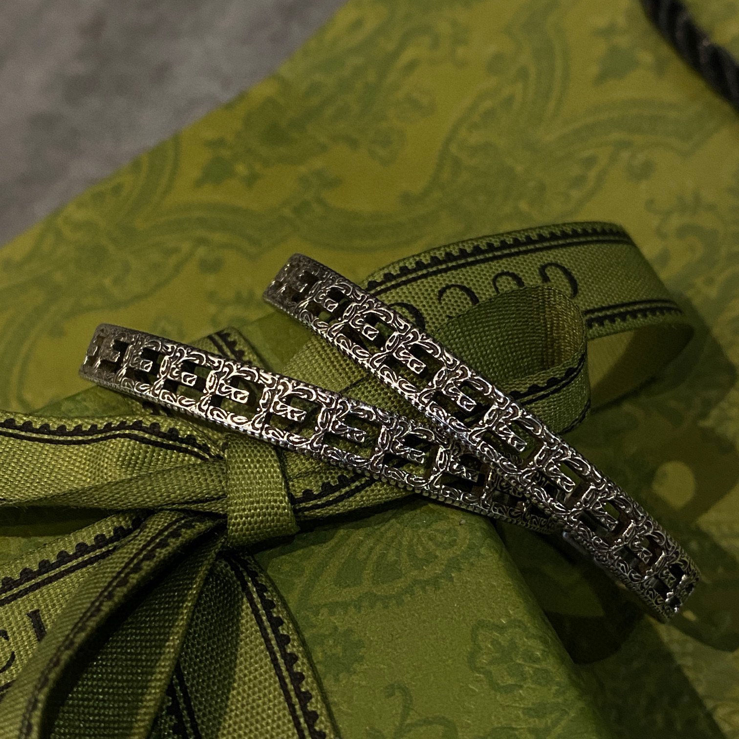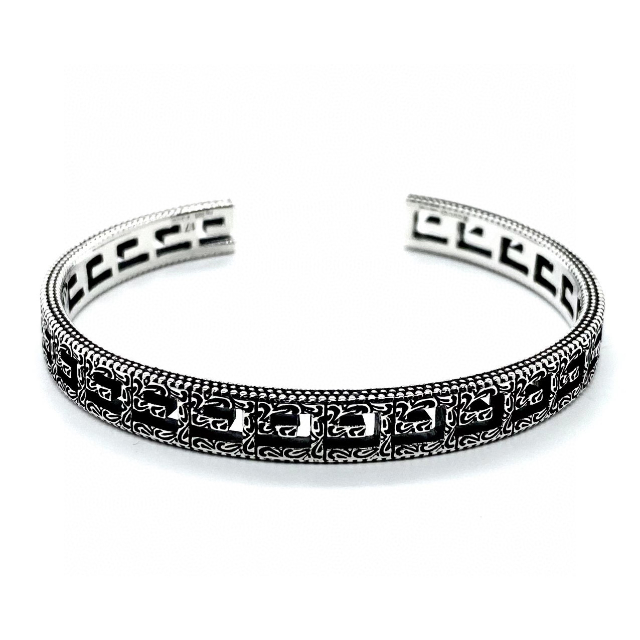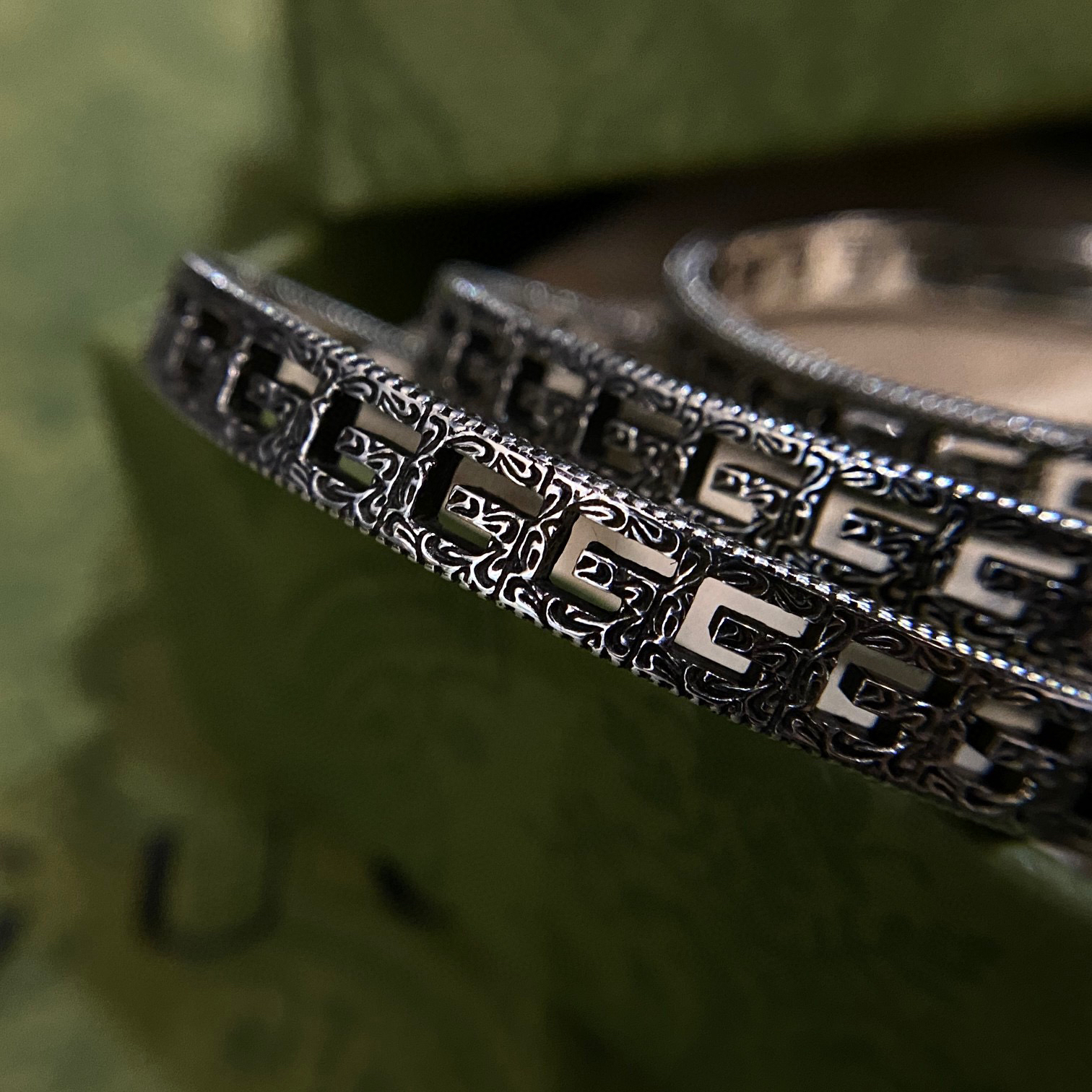 纯银做旧效果 方形 G 镂空图案 边缘呈现织纹效果 阿拉伯风格刻花图案