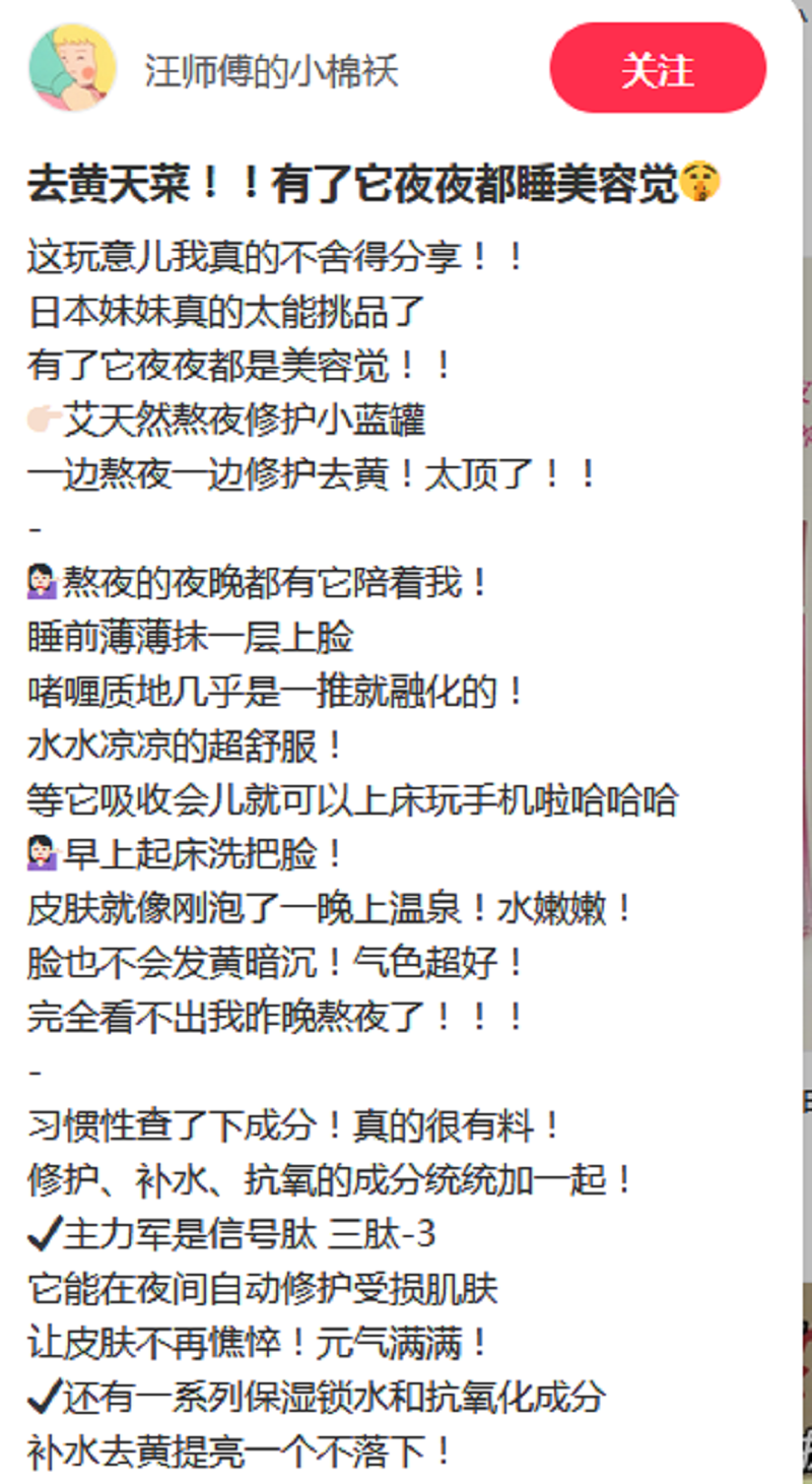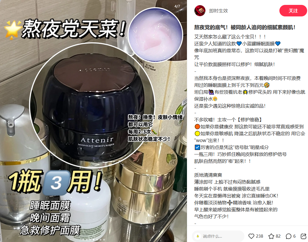 主打修复保湿,夜间休息中提高肌肤修复能力,有效成分直达细胞深层,三种保湿氨基酸成分,同时配合神经酰胺,强固的保湿层,2小时内高效渗透,使用两个月后,肌肤纹理更加顺滑,恢复肌肤生命力。夜间睡眠面膜主打保湿修复~在睡眠中增强皮肤细胞的再生能力
