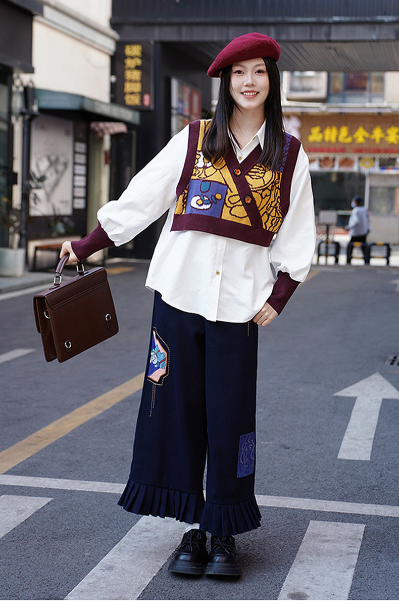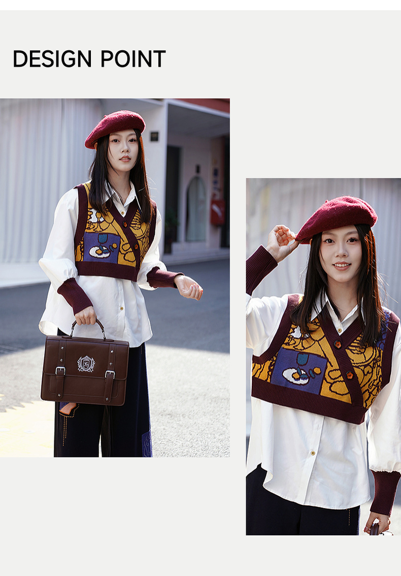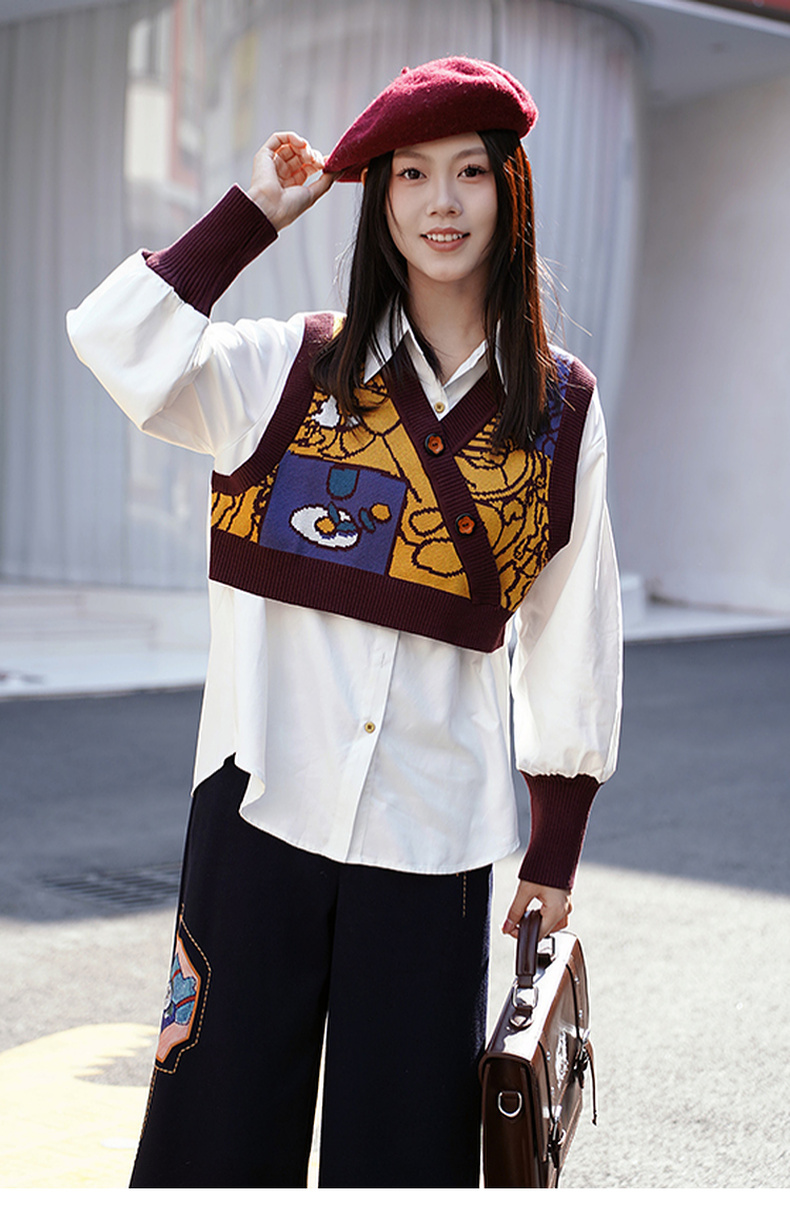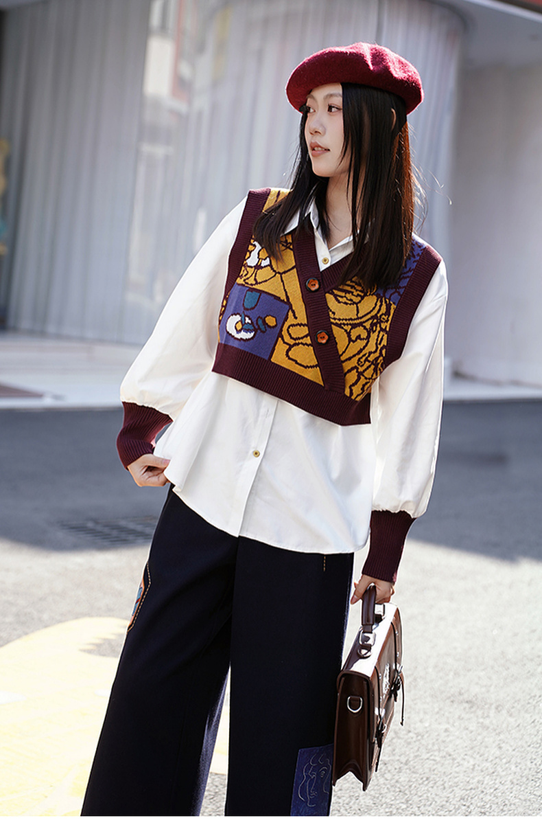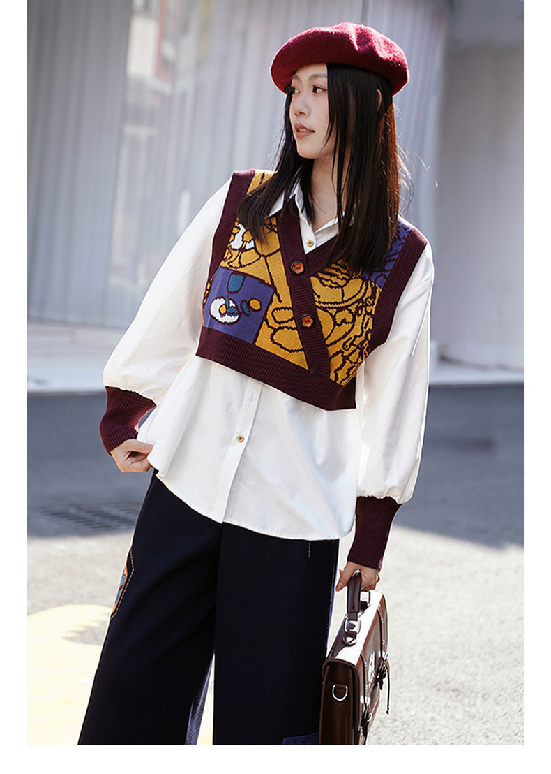 两三事梦忆瞬息2025春季新款文艺风抽象图案针织拼接假两件衬衫女