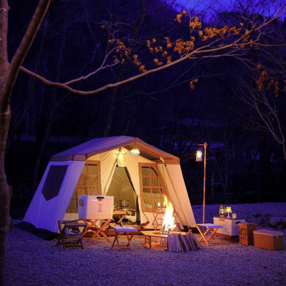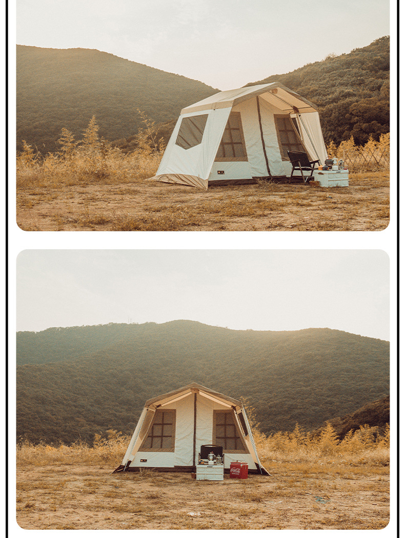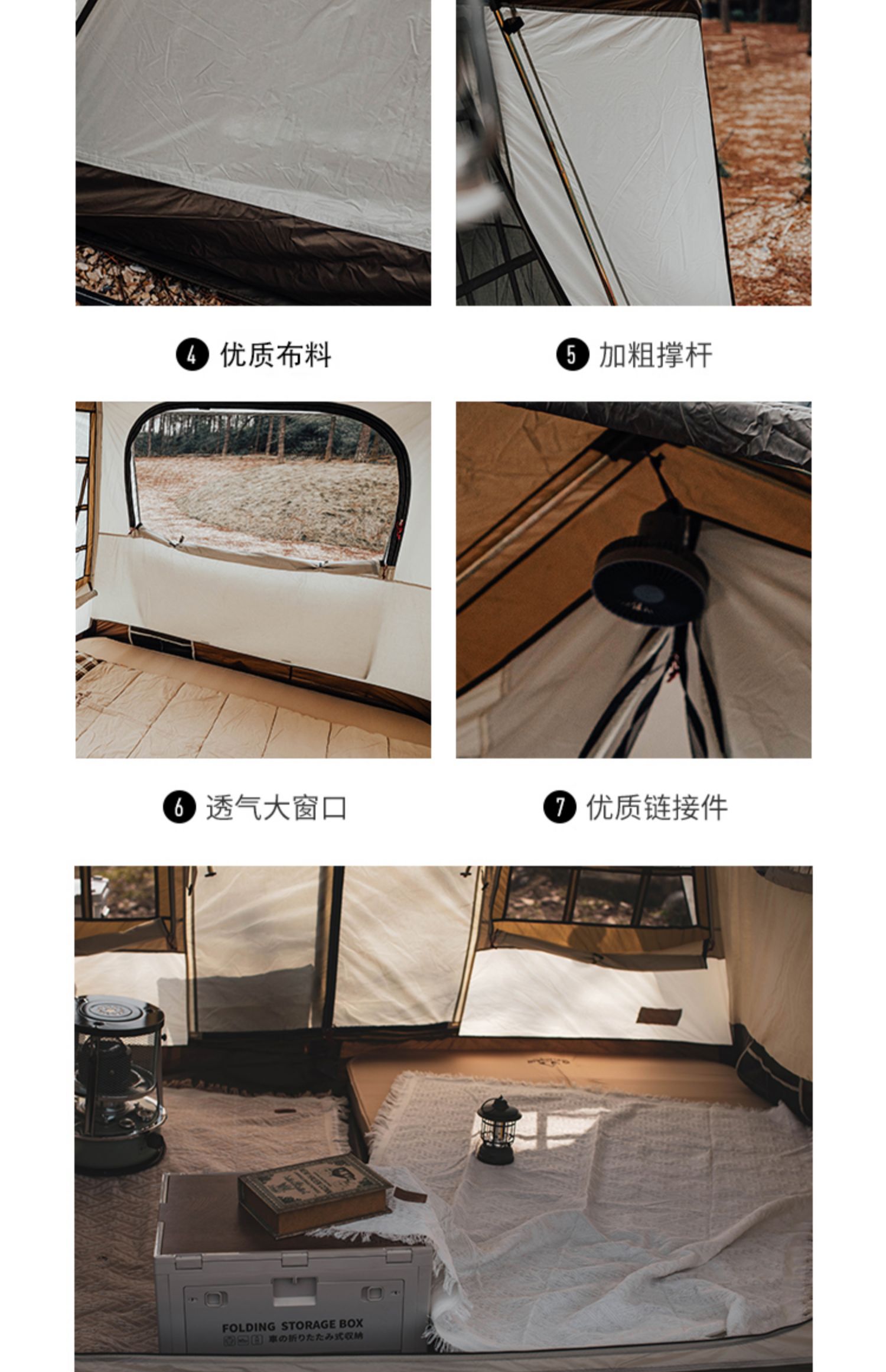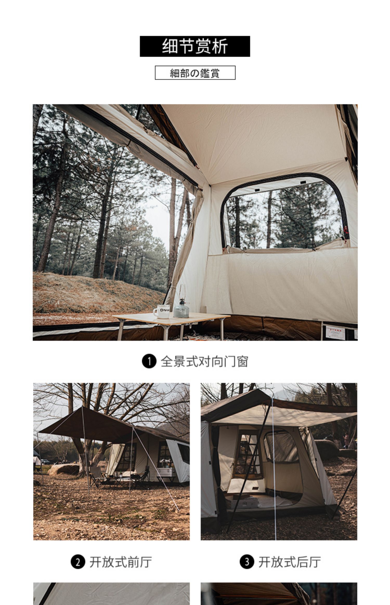 面料主要是牛津布,不锈钢支架,内外账分离,款式复古,内部空间大,防雨和通风效果不错,也可以把内帐去掉变成隧道型天幕。