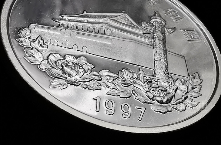 该币为中华人民共和国法定货币,由中国人民银行于1997年发行,上海造币厂、深圳国宝造币厂联合铸造。时任中国人民银行行长戴相龙签发。正面图案:国号、年号、天安门、华表及牡丹花。背面图案:上方为中国人民共和国香港特别行政区区旗;下方为香港会议展览中心及海景,并铸有BU标志;中间为礼花;周围标有“中华人民共和国香港特别行政区成立纪念”中英文字。