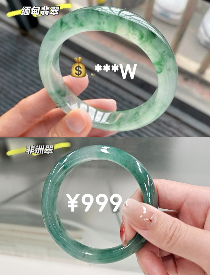 △这次带来的非洲翠的镯子vs真翡翠飘花镯子。