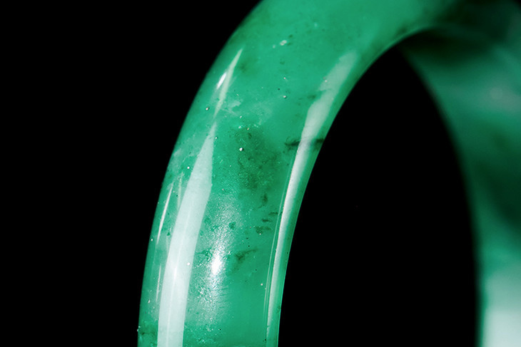在玉镯、手串上,还有独特的点状洒金,这是由黄铁矿在玉石中被包裹形成,呈点状或片状分布,在自然光增加灵动感。