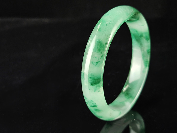 你看,这次我们带来的非洲翠种水上乘,飘花翠绿,哪怕和玻璃种飘花翡翠镯放一起,视觉美感一点都不逊色。