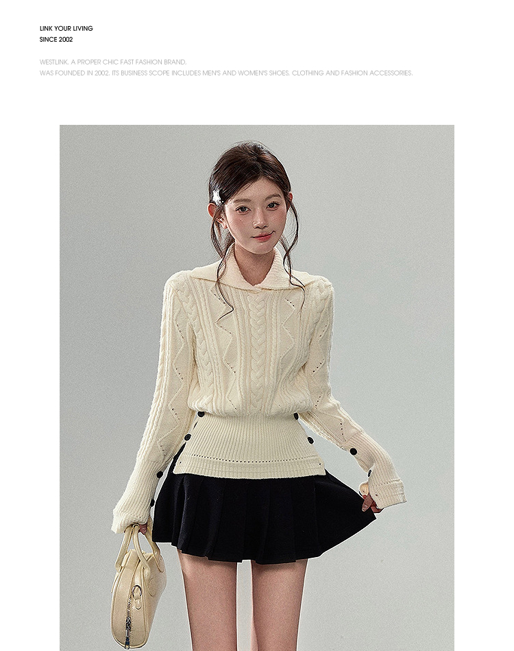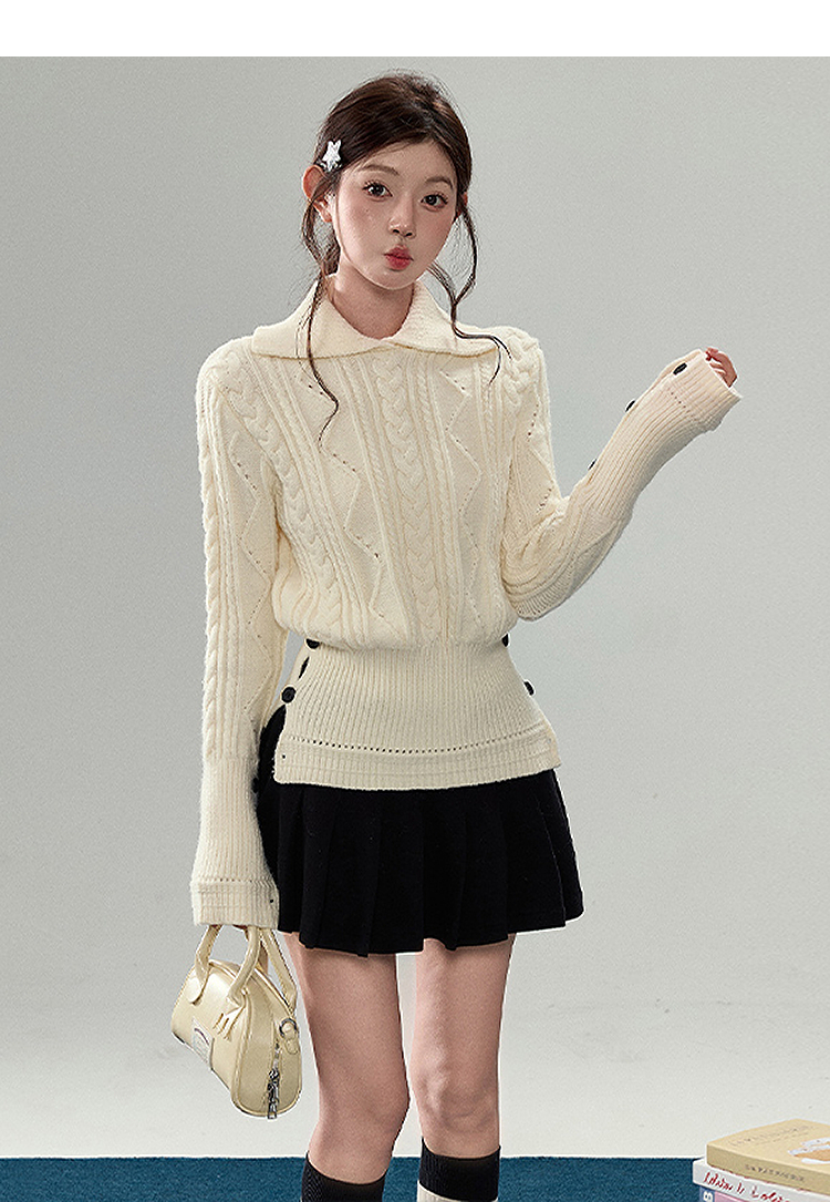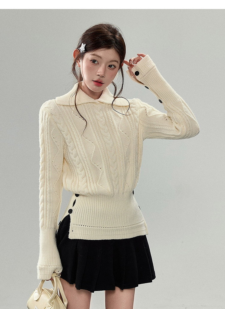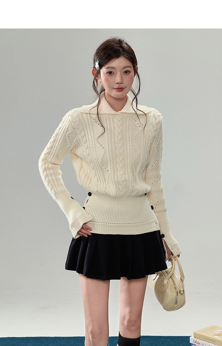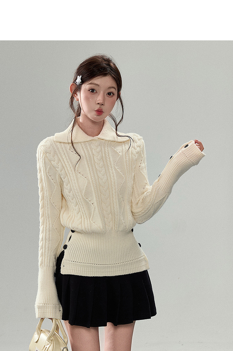 西遇大翻领老钱风麻花毛衣女冬季新款设计感纽扣收腰针织衫SS051821