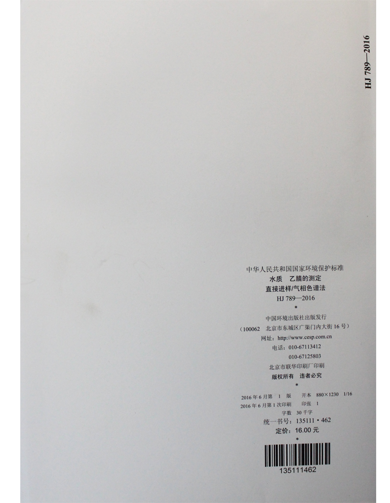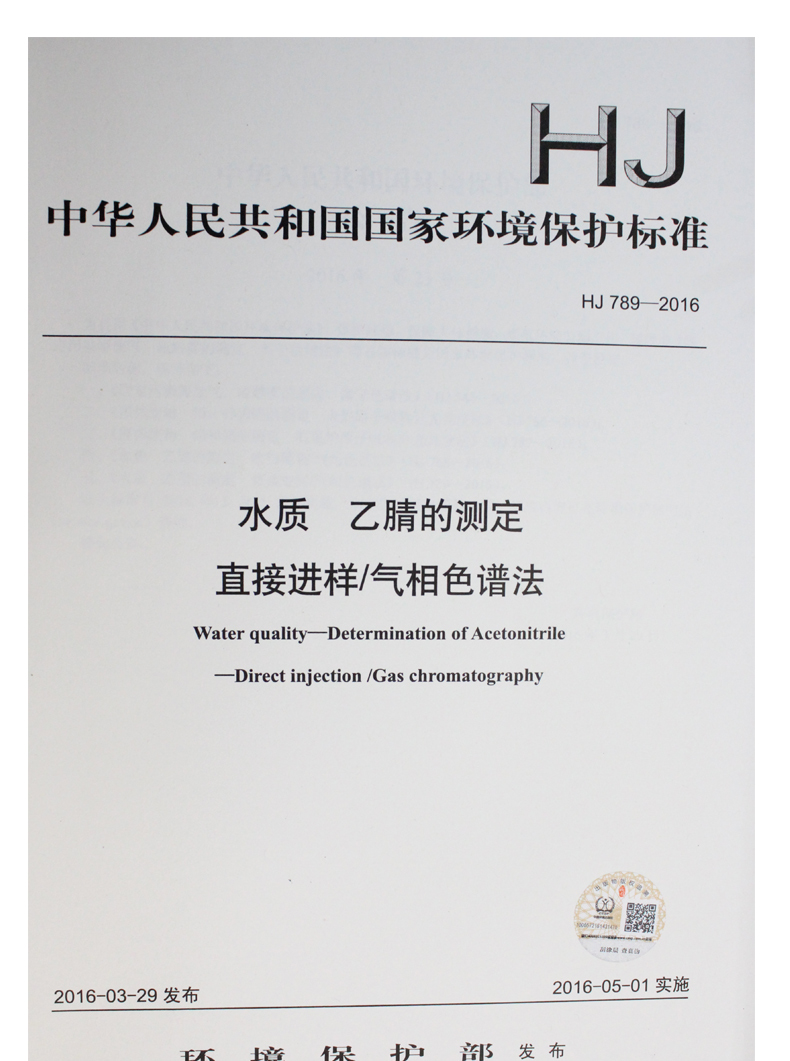 HJ 789-2016 水质 乙腈的测定 直接进样/气相色谱法 国家标准 国标 GB 环境保护 135111462