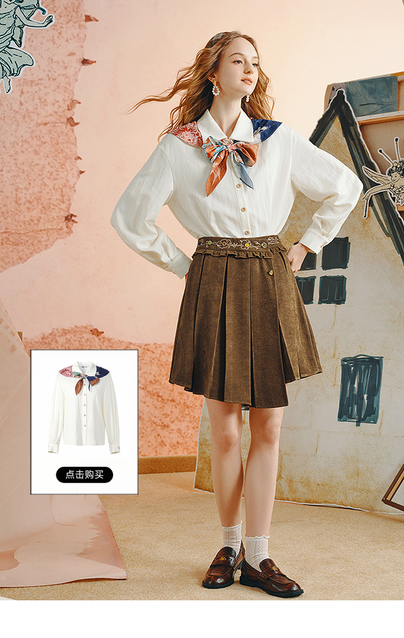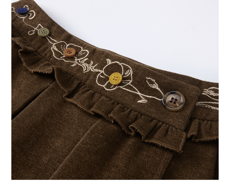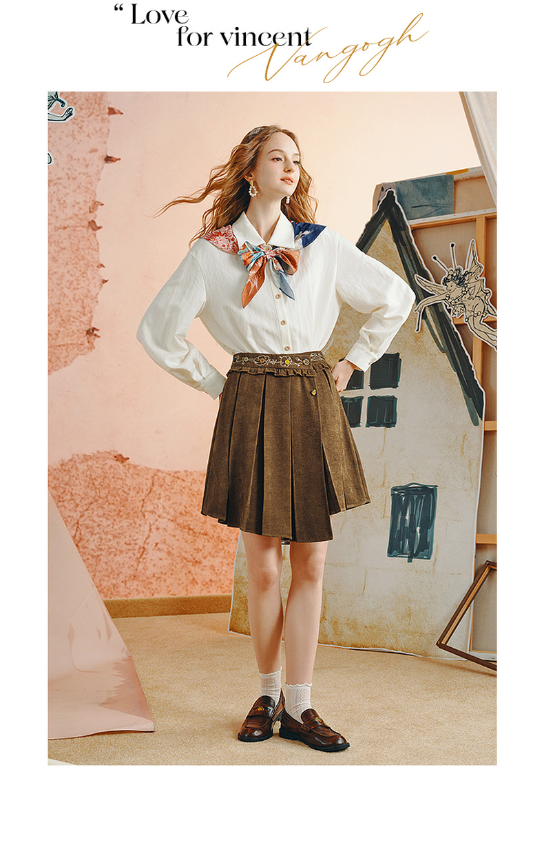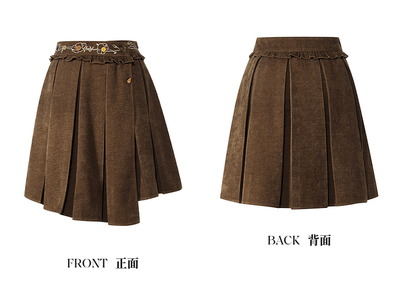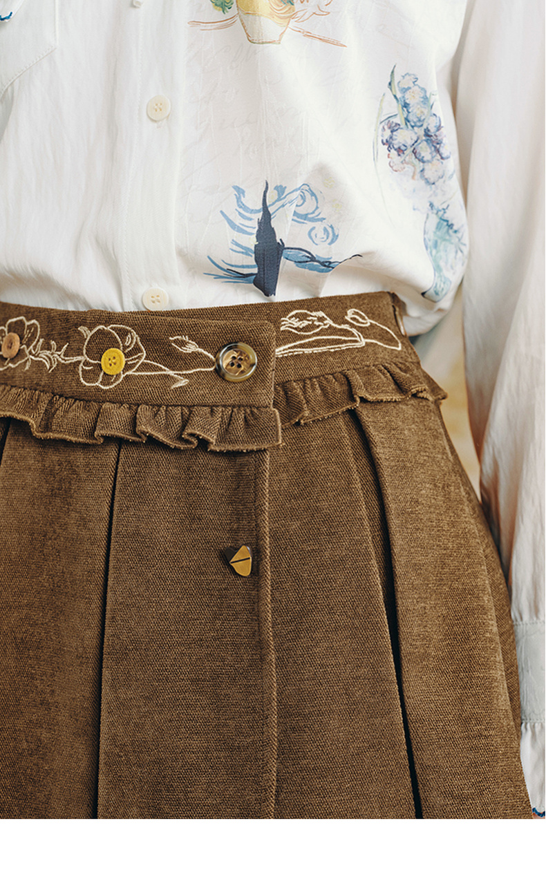 两三事梵高文艺棕野栗歌2025秋新款复古绣花不对称百褶短裙半身裙