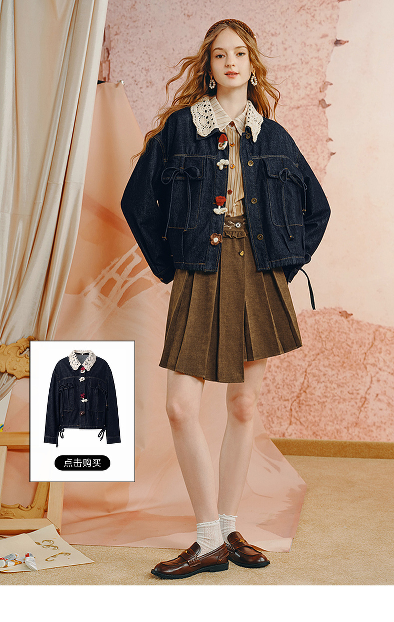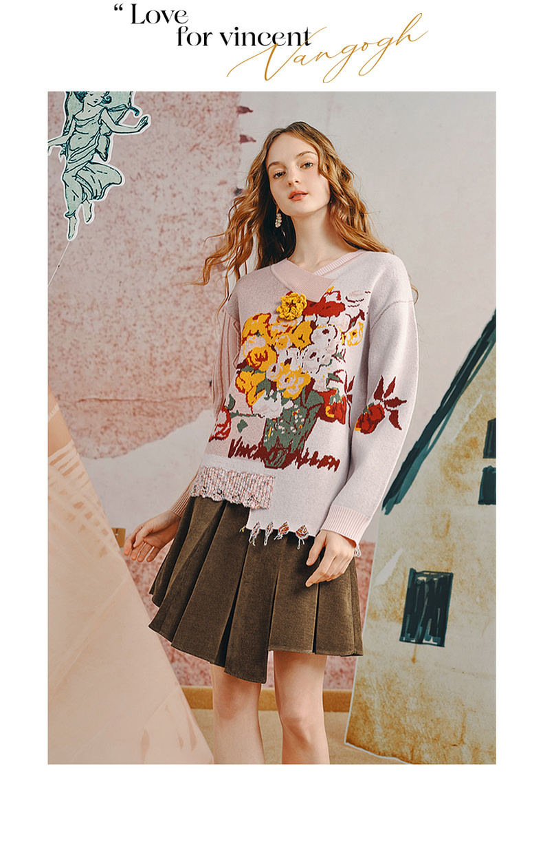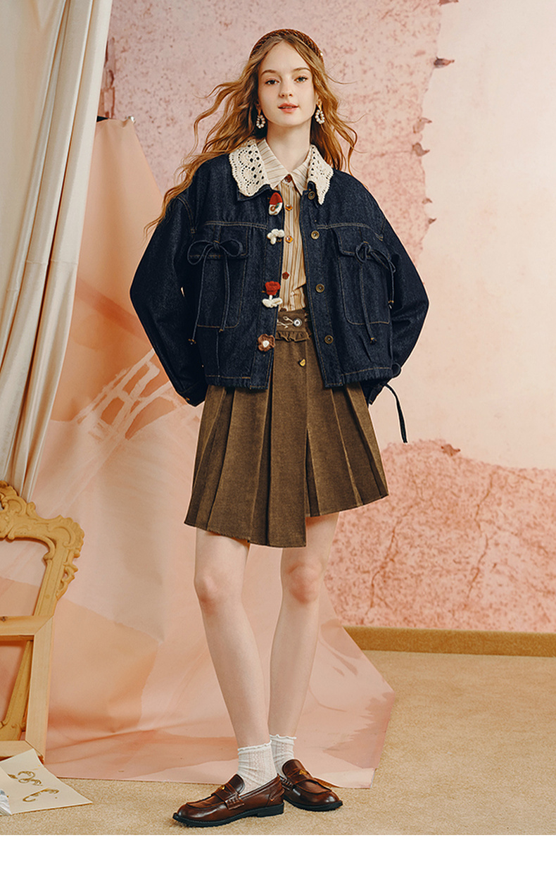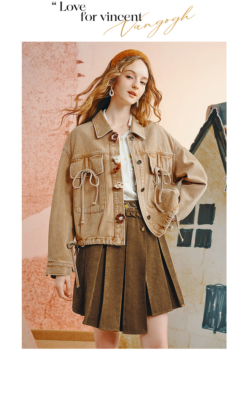两三事梵高文艺棕野栗歌2025秋新款复古绣花不对称百褶短裙半身裙