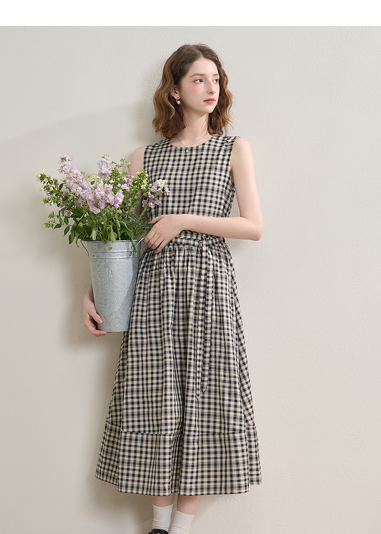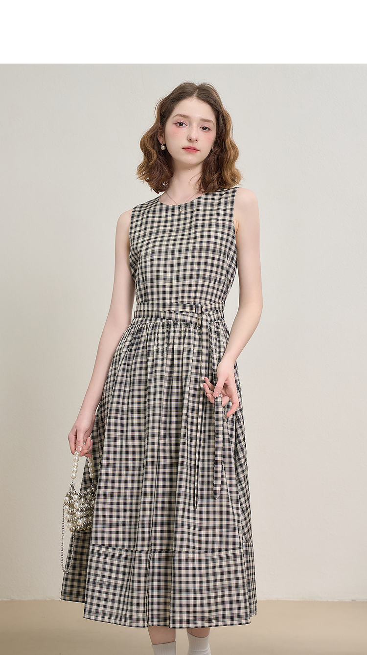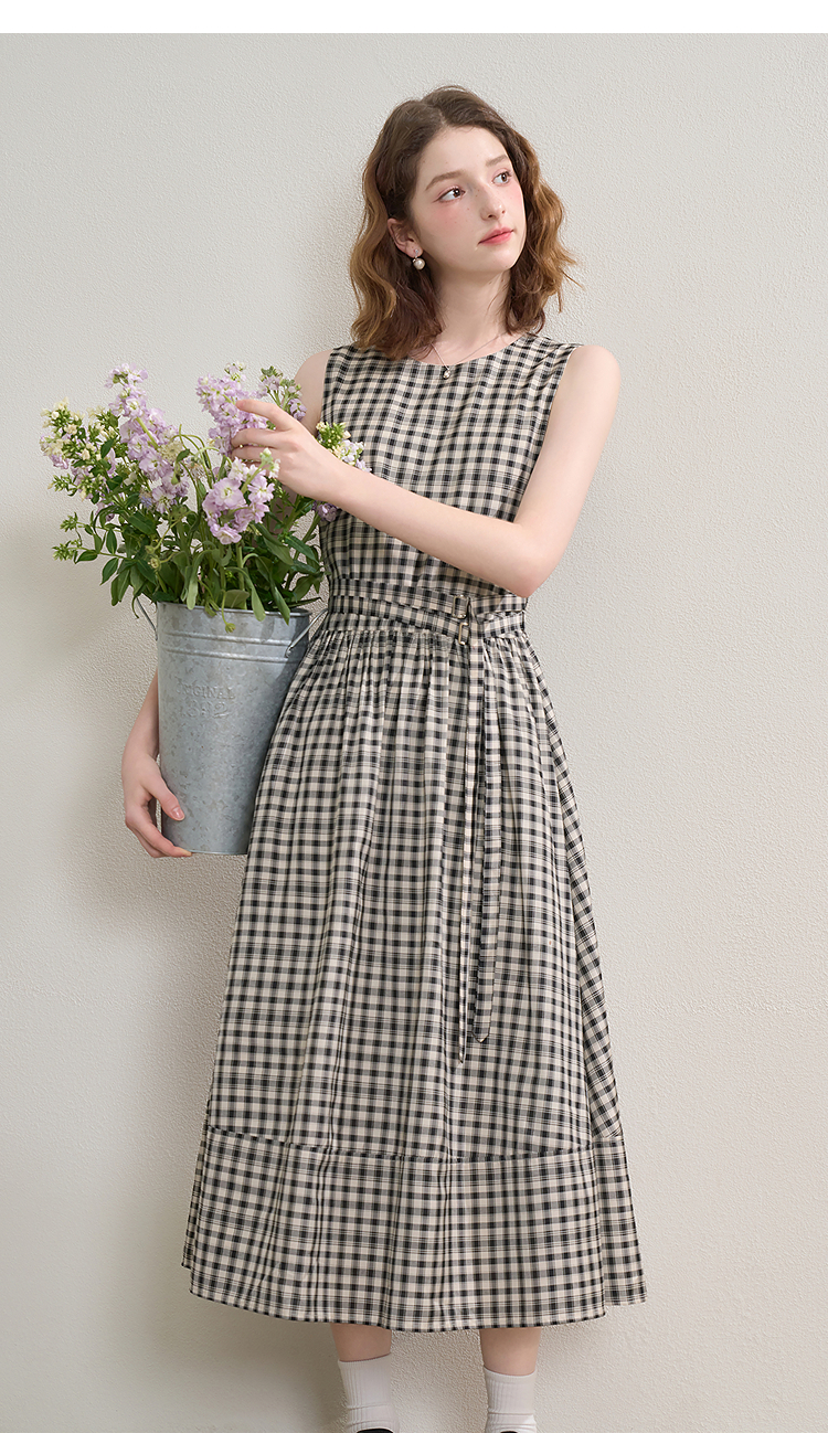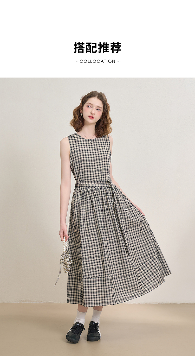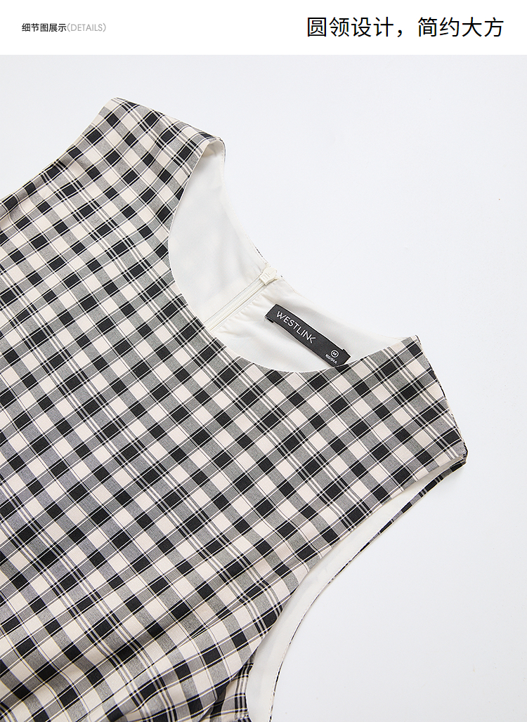 黑白格纹无袖圆领背心裙女夏季收腰大裙摆显瘦气质连衣裙V1350849