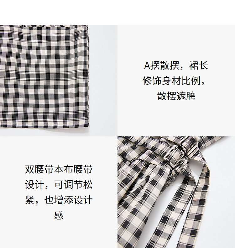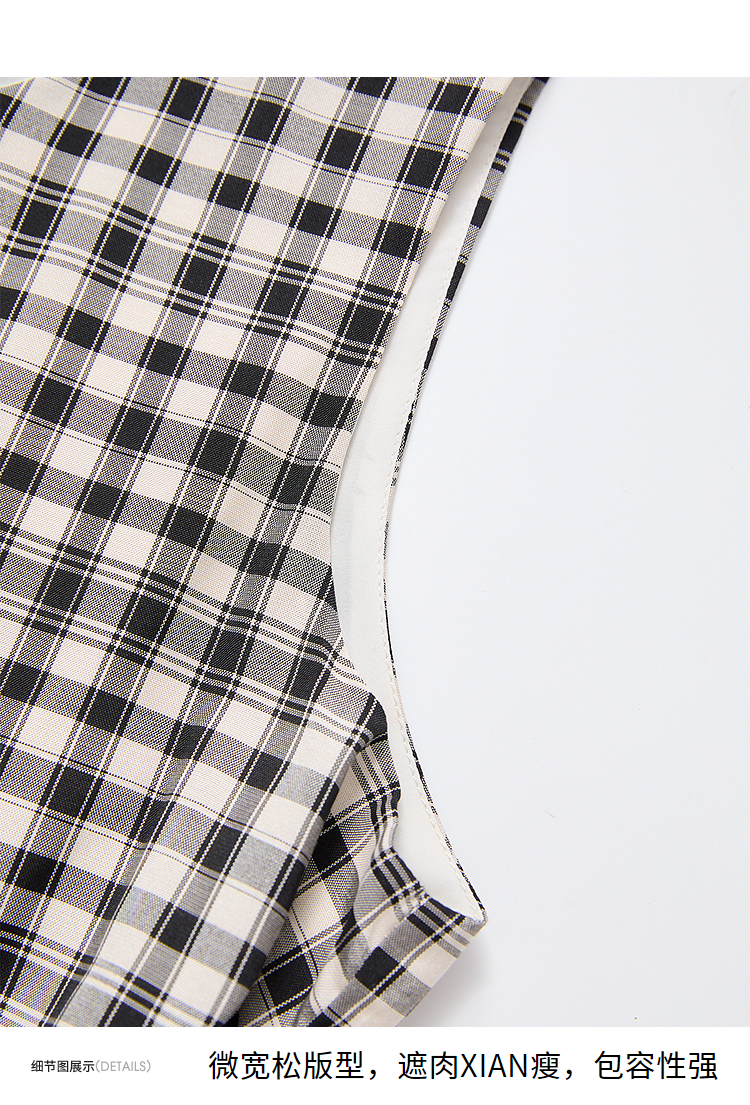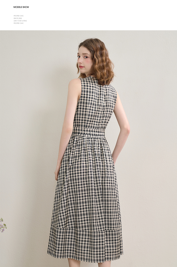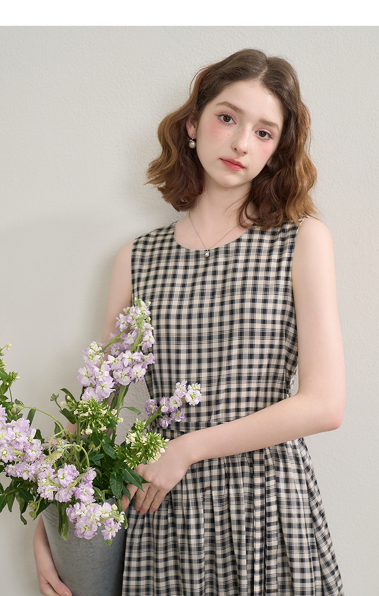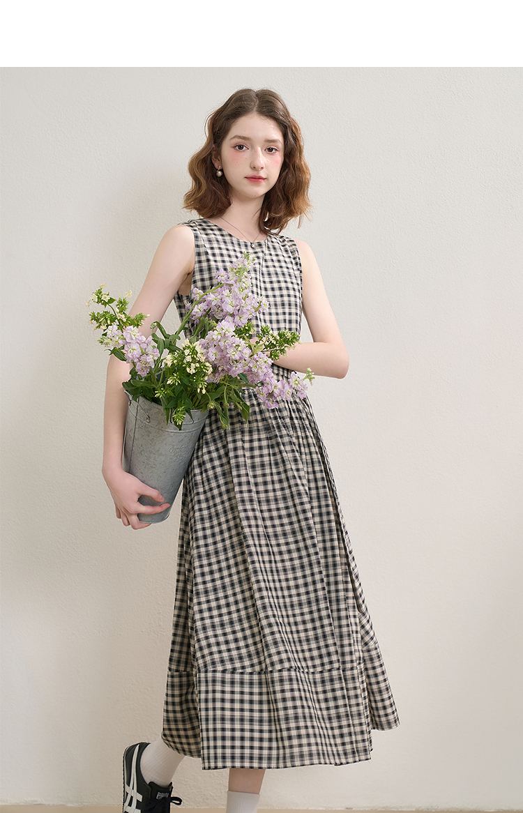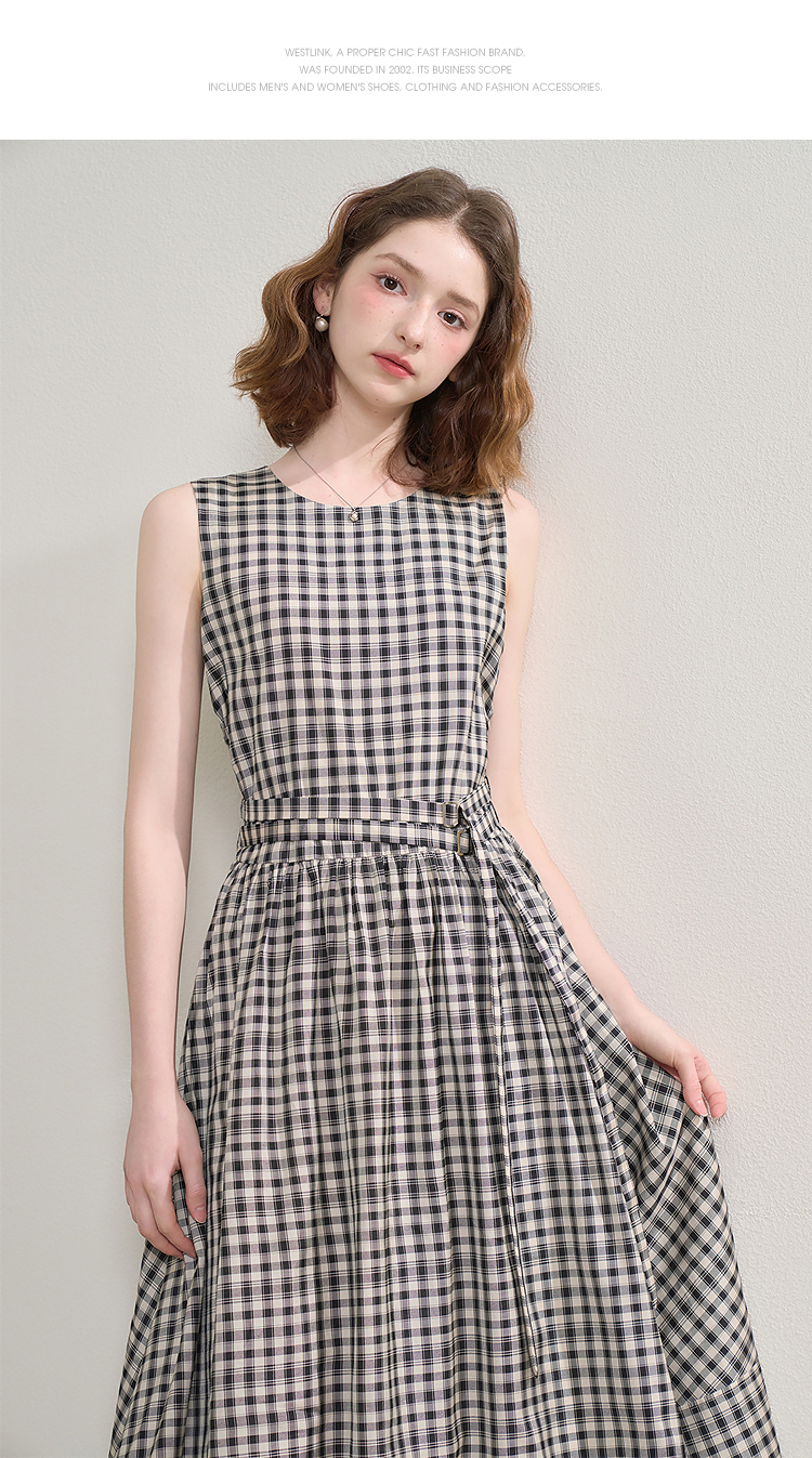 黑白格纹无袖圆领背心裙女夏季收腰大裙摆显瘦气质连衣裙V1350849