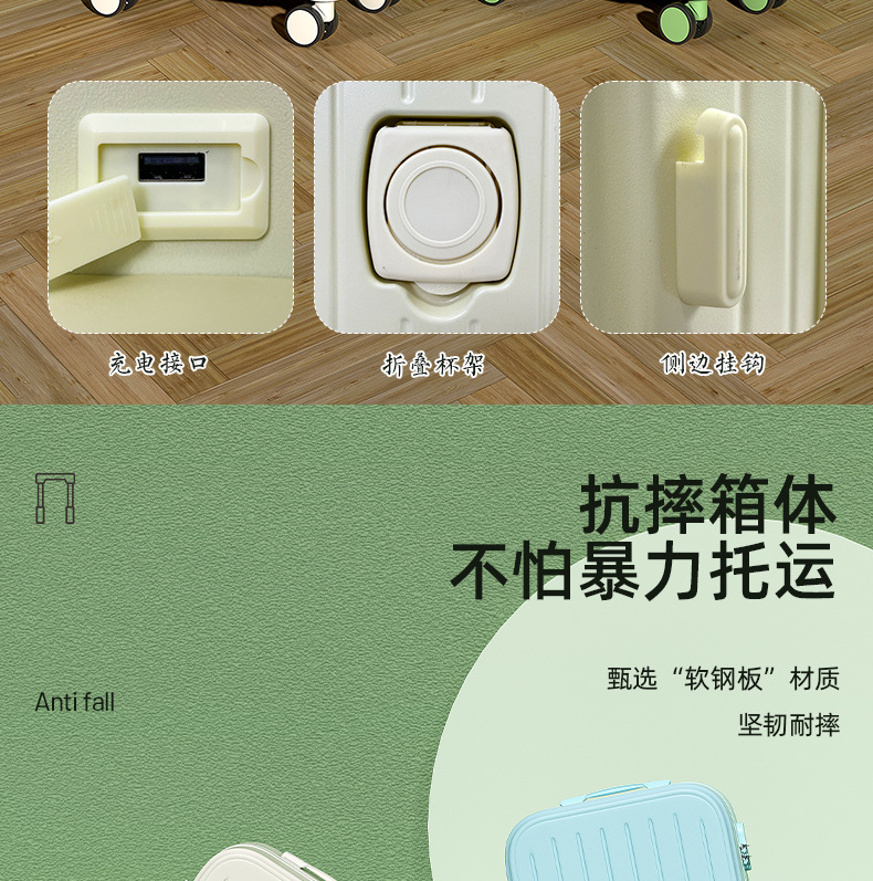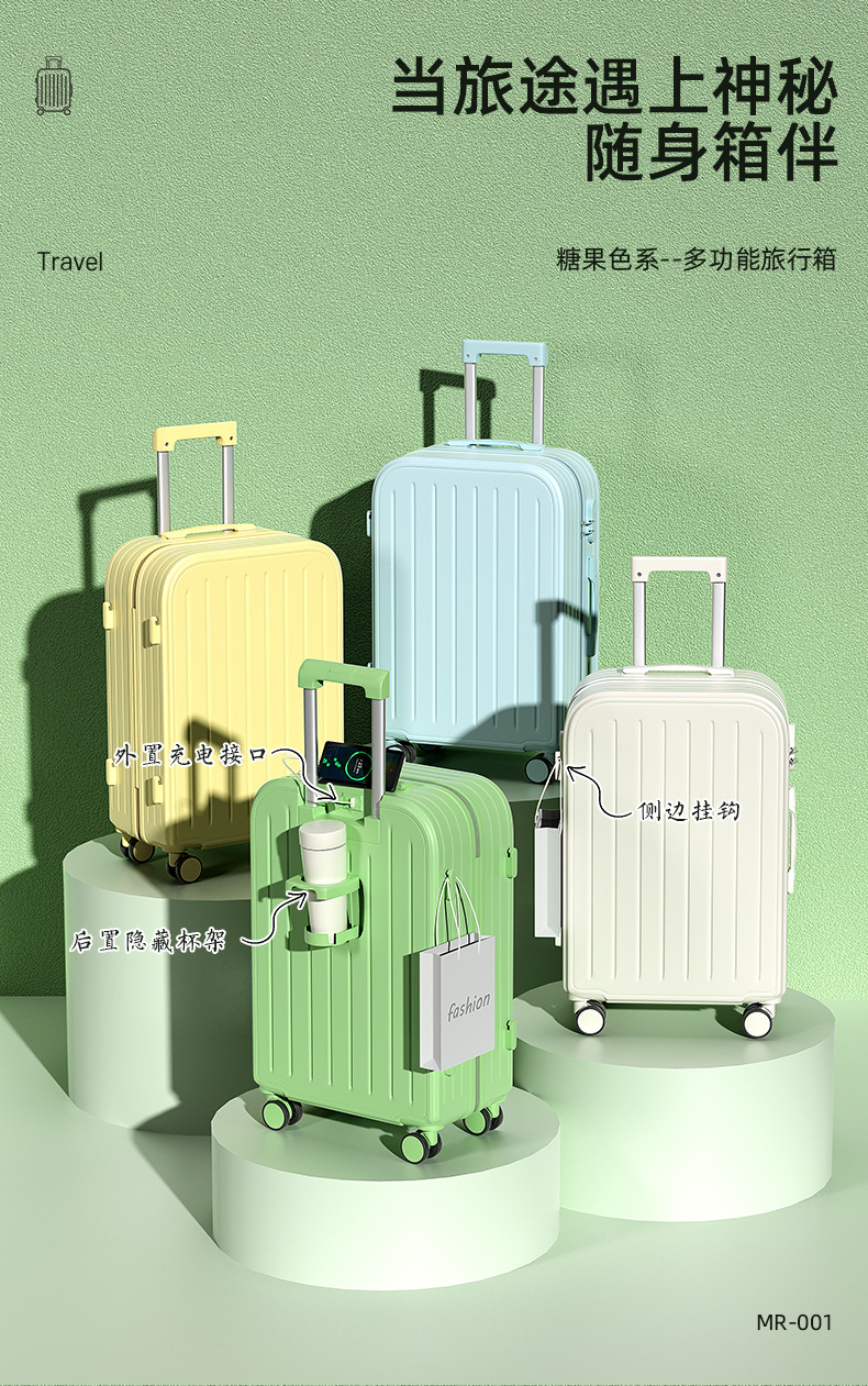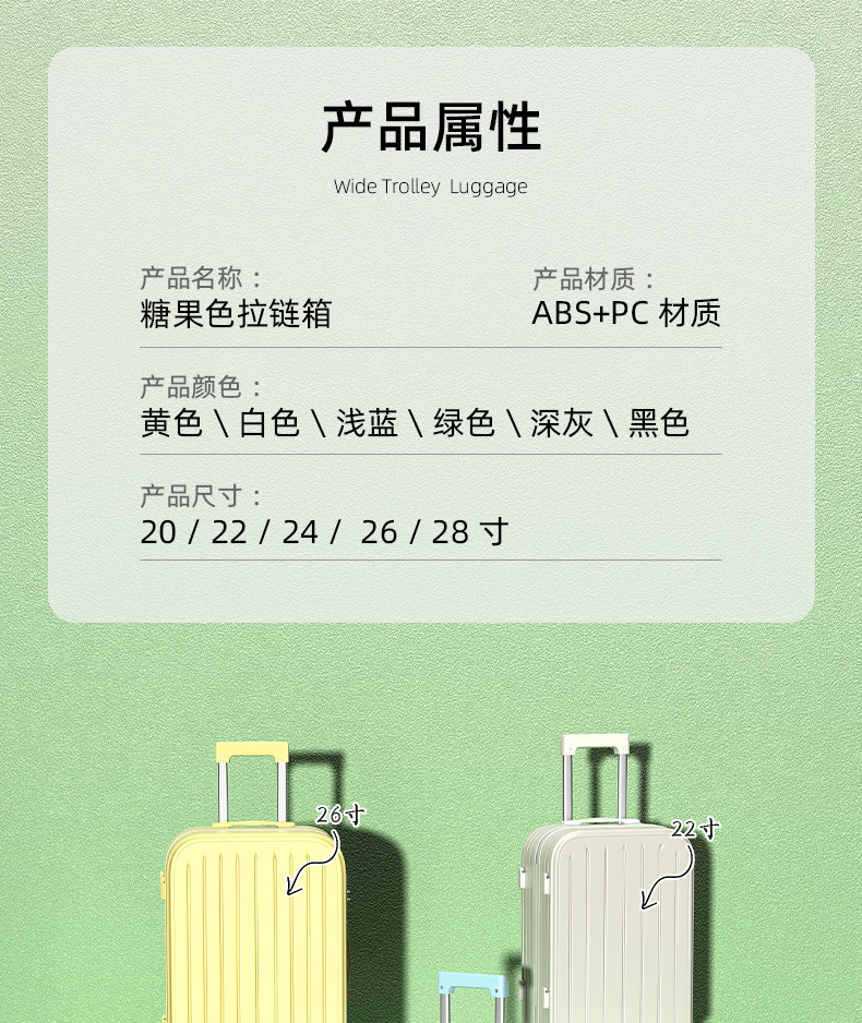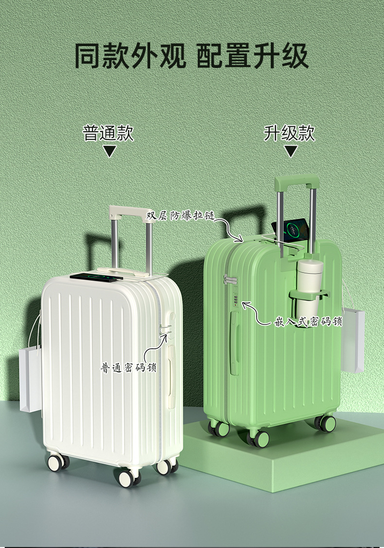 【轻盈便携!旅行出差必备】时尚旅人选择,轻便静音,多功能收纳;糖果色拉链随心搭,防爆拉链安心用。旅途中不再无聊,乘车充电便捷省;多向万向轮,轻松穿梭人潮间!