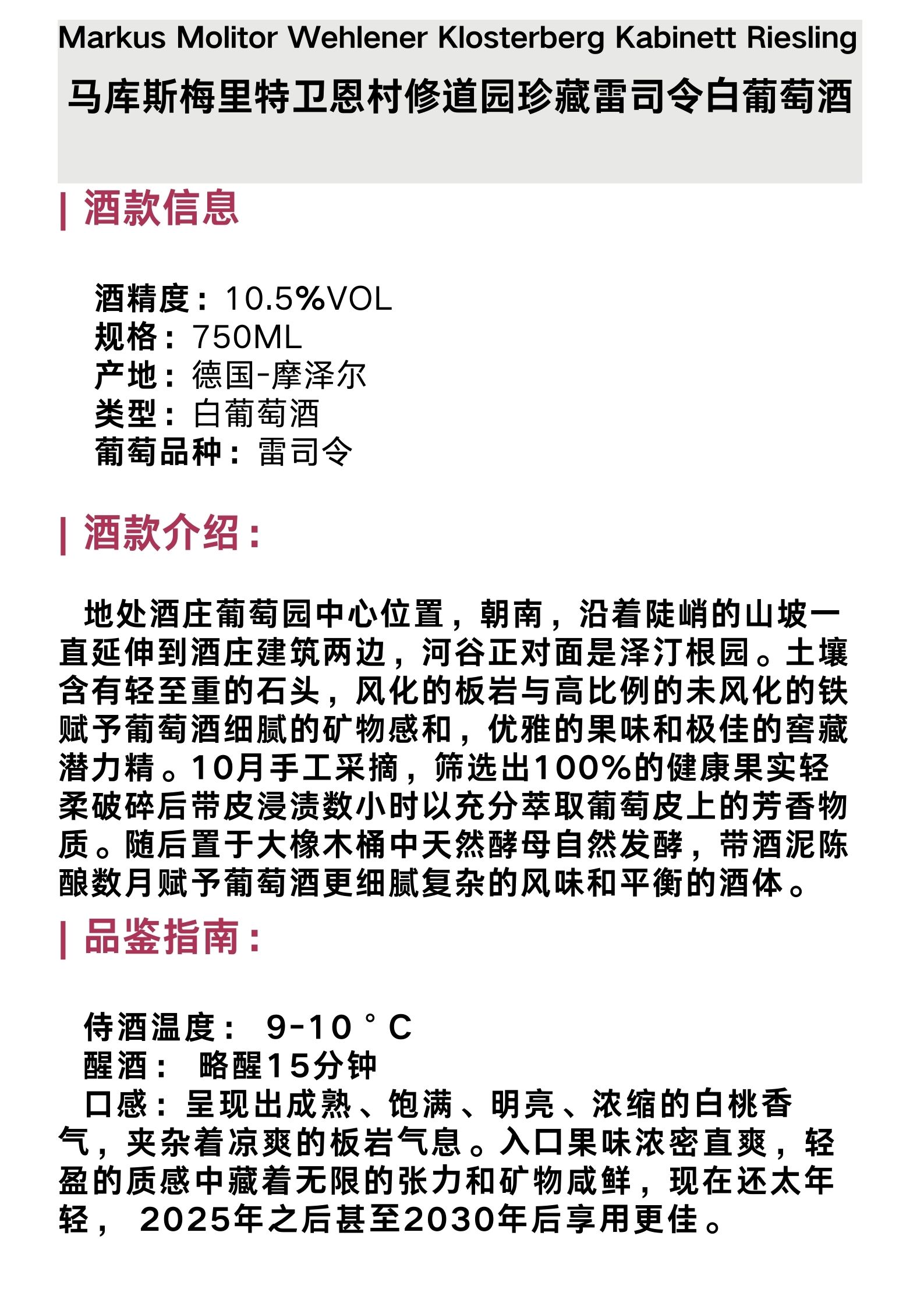 马库斯梅里特卫恩村修道园珍藏雷司令白葡萄酒 Markus Molitor Wehlener Klosterberg Riesling Kabinett