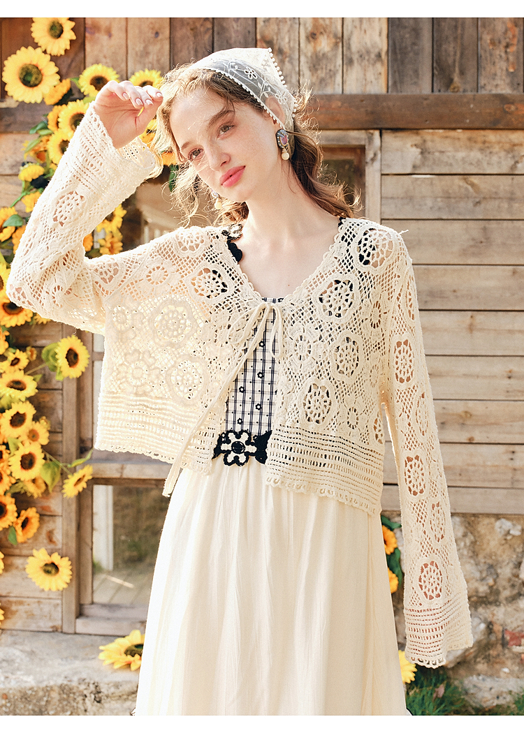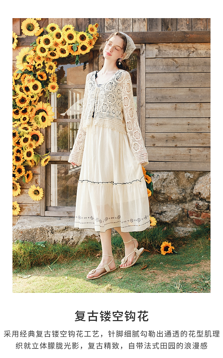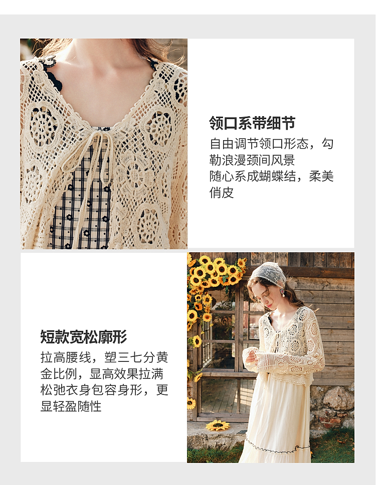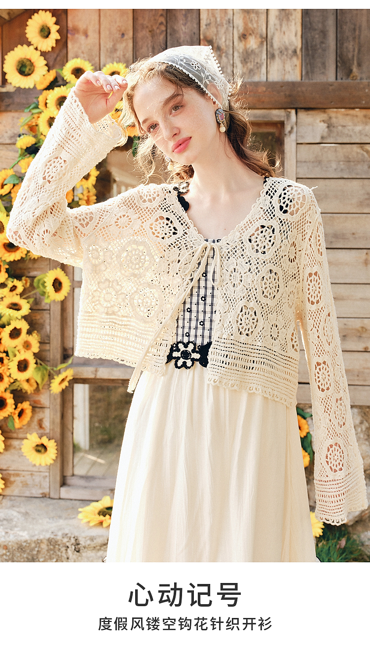 两三事 心动记号 2026春季新款田园风镂空编织绑带针织开衫女