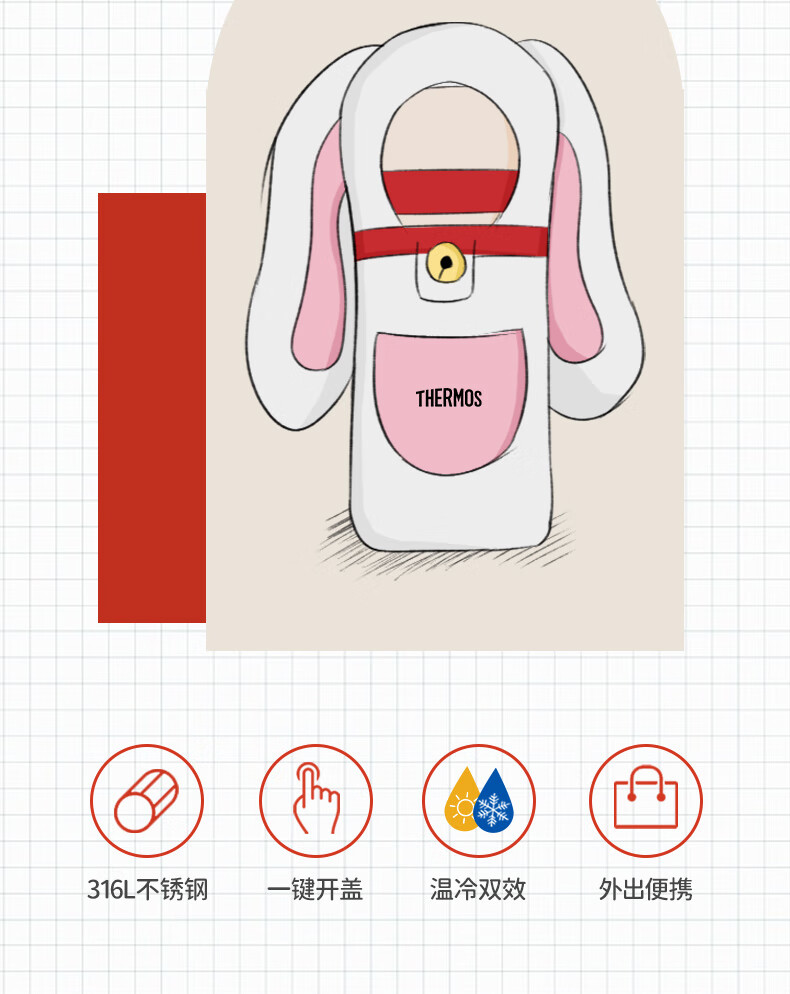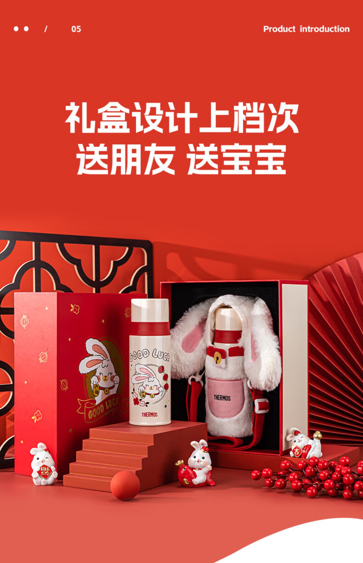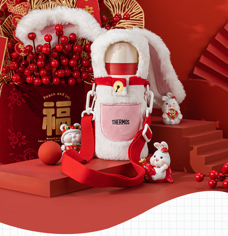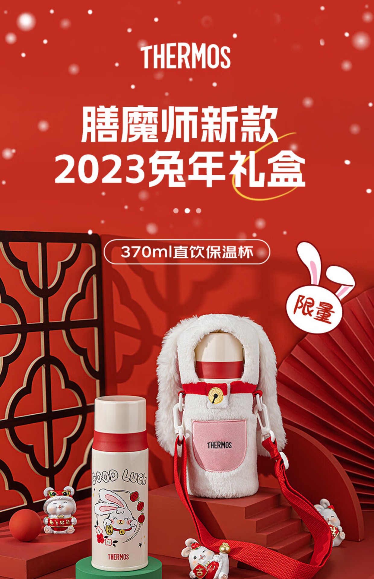 膳魔师THERMOS 兔年保温杯可爱毛绒兔子儿童学生两用不锈钢直饮杯