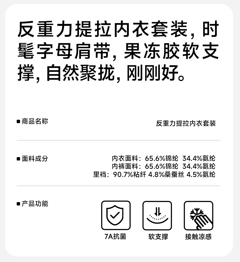 面料:内衣面料65.6%锦纶 34.4%氨纶 ,内裤面料65.6%锦纶34.4%氨纶 ,内裤里档90.7%粘纤4.8%桑蚕丝4.5%氨纶