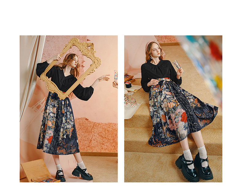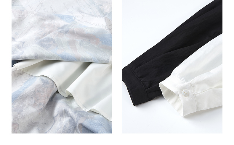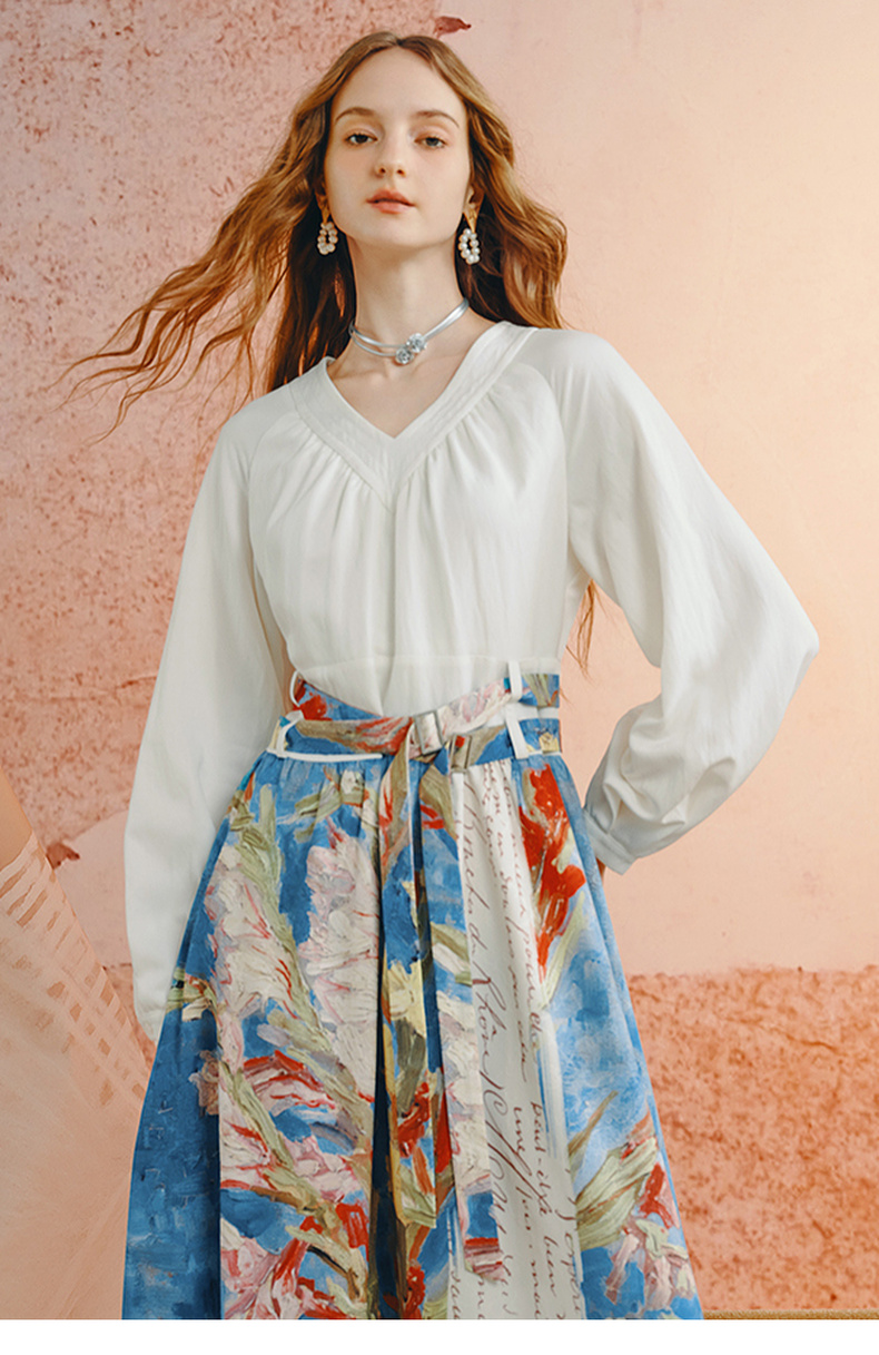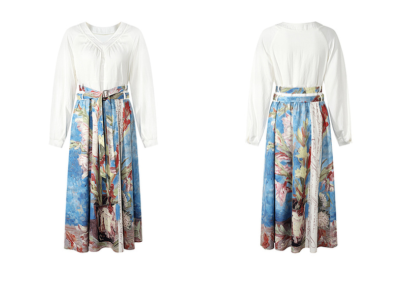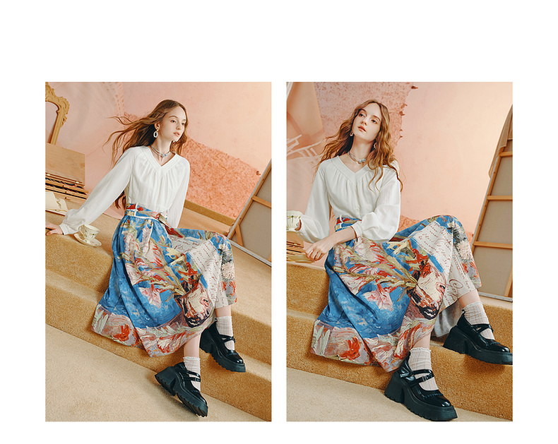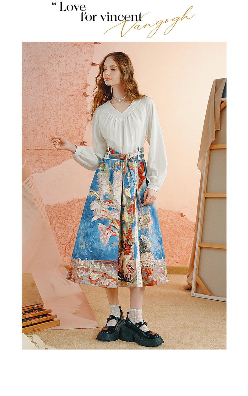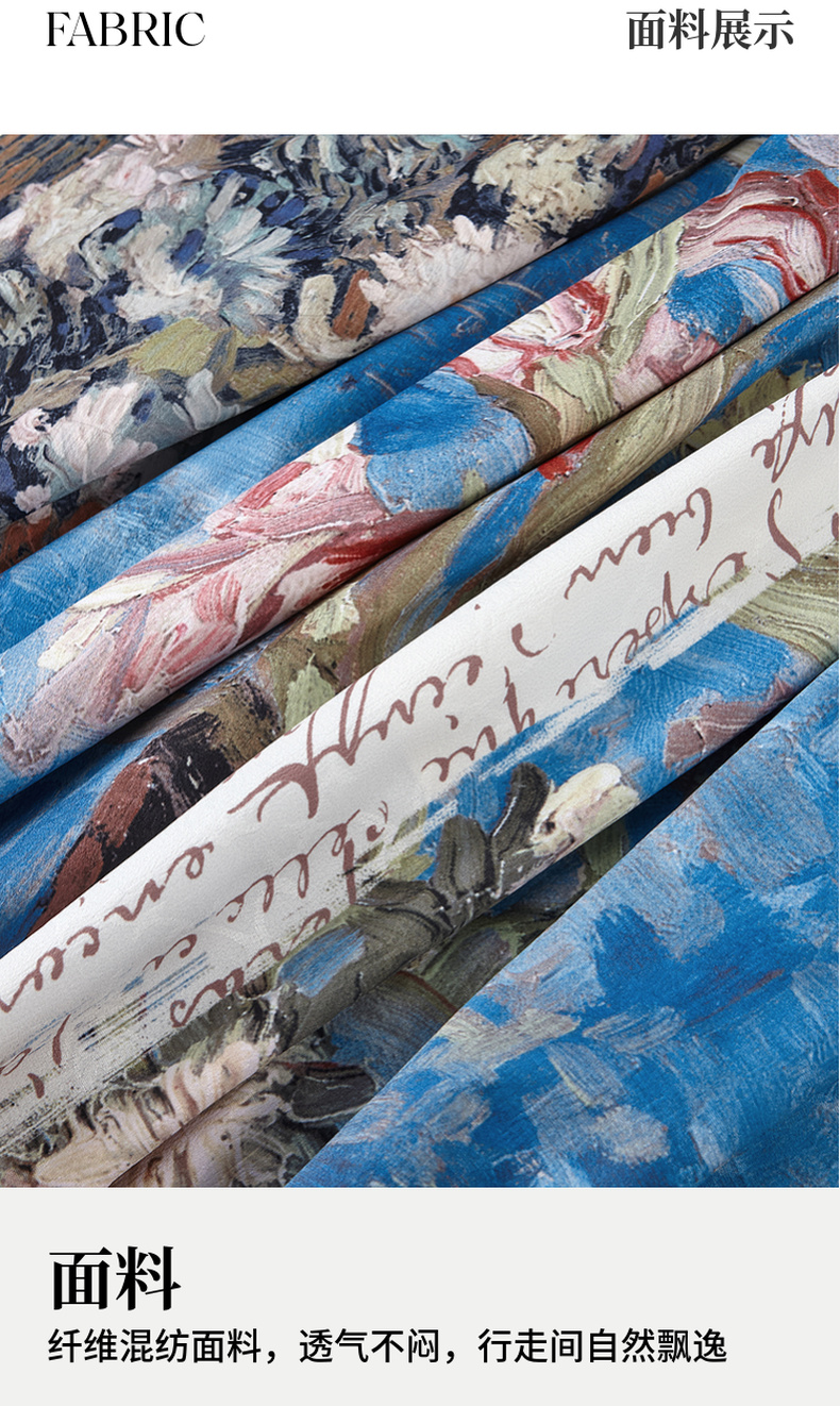 两三事梵高艺术花也谈情夏季压褶拼接印花两面穿雪纺衫女