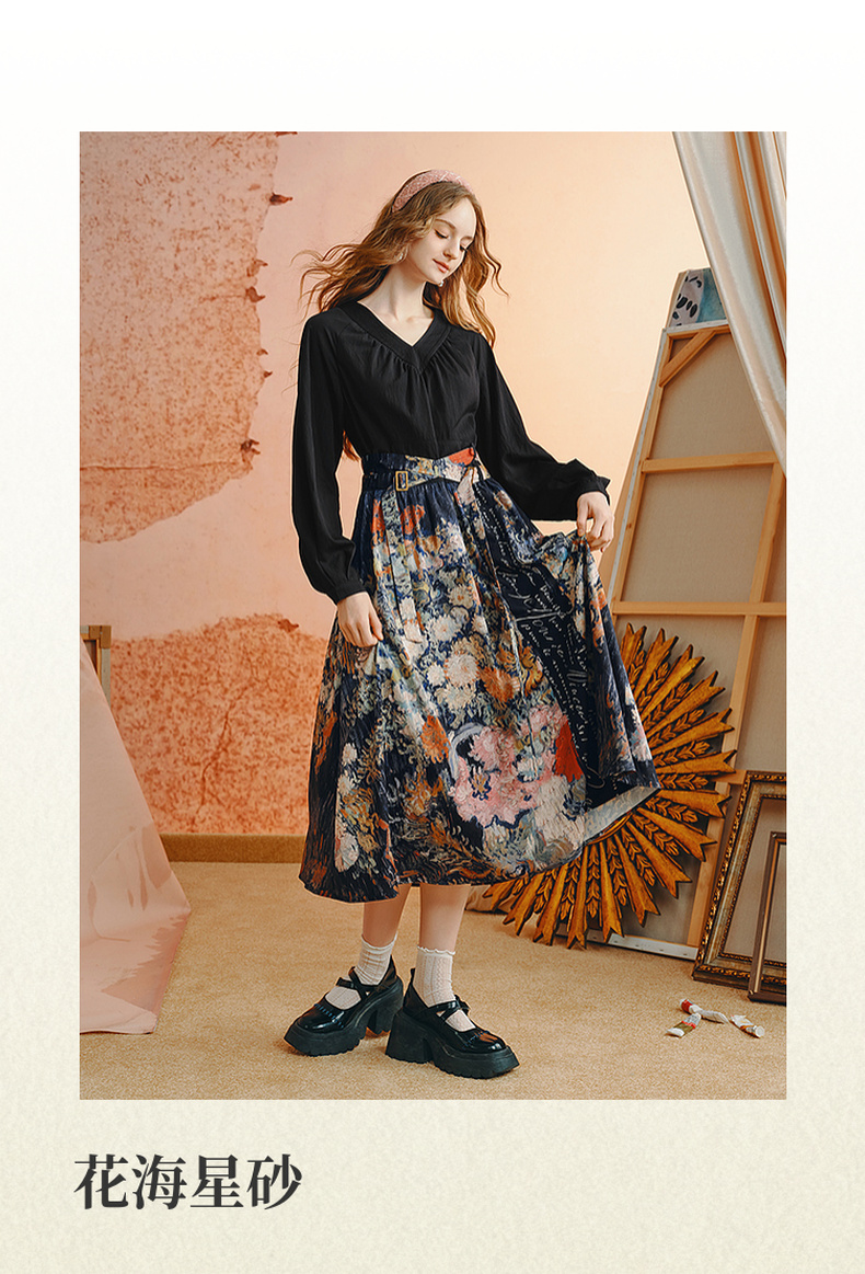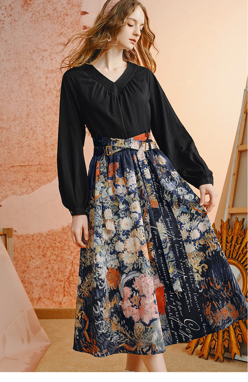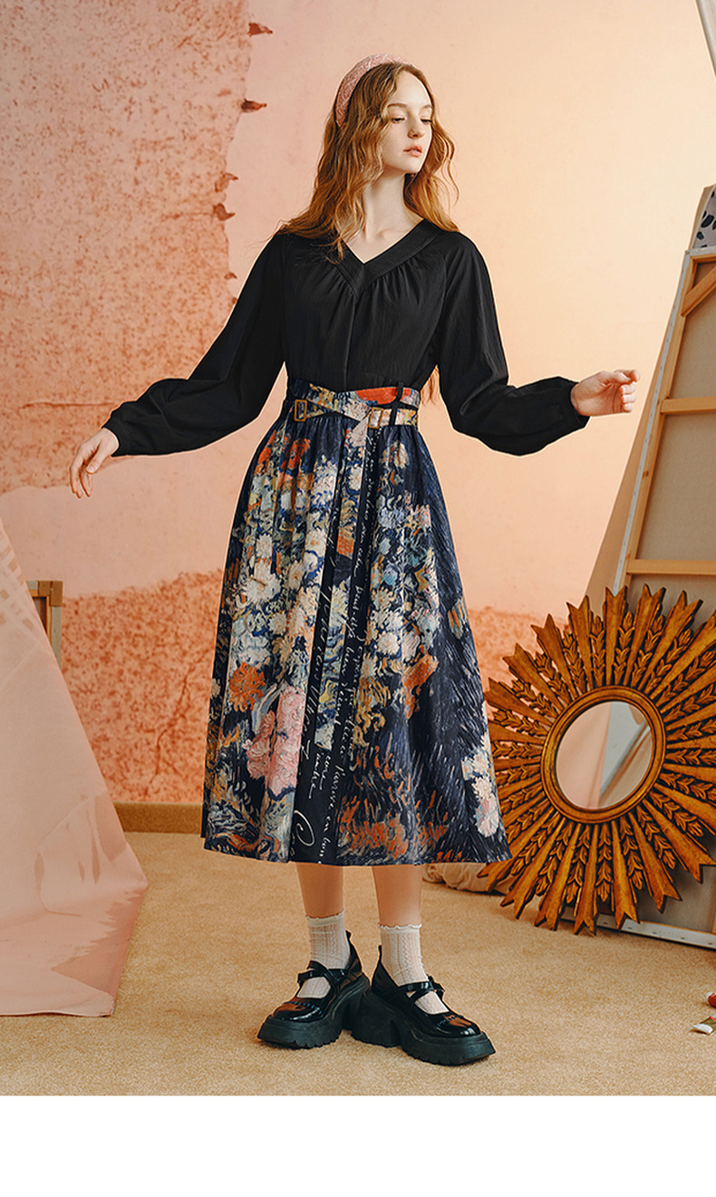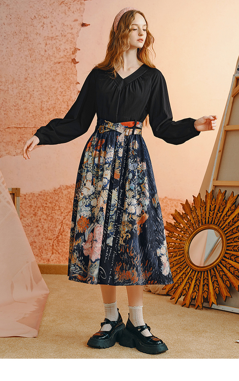 两三事梵高文艺花海星砂2025秋季新款法式印花裙摆拼接a字连衣裙