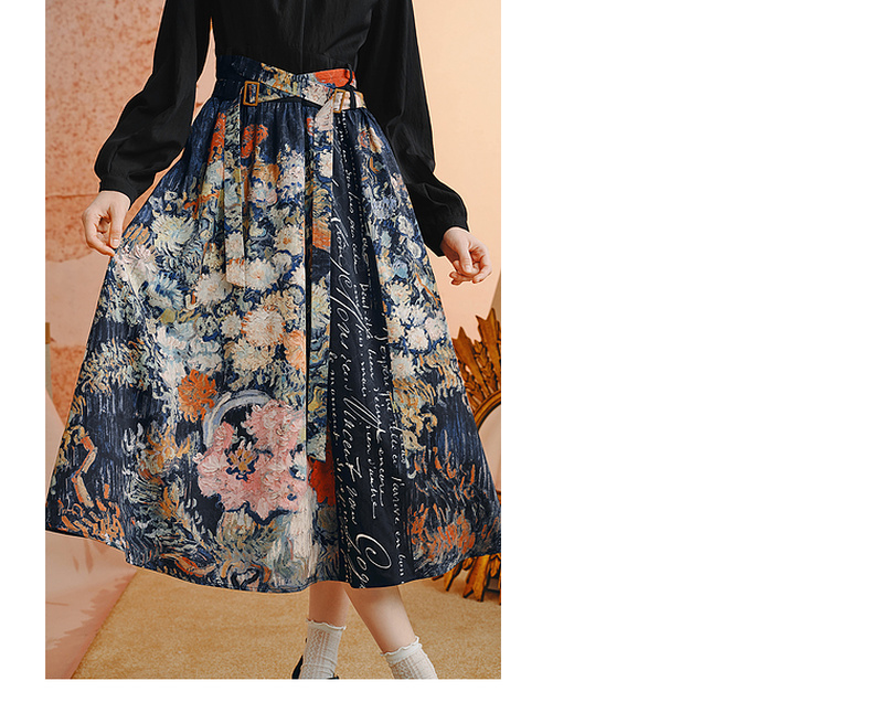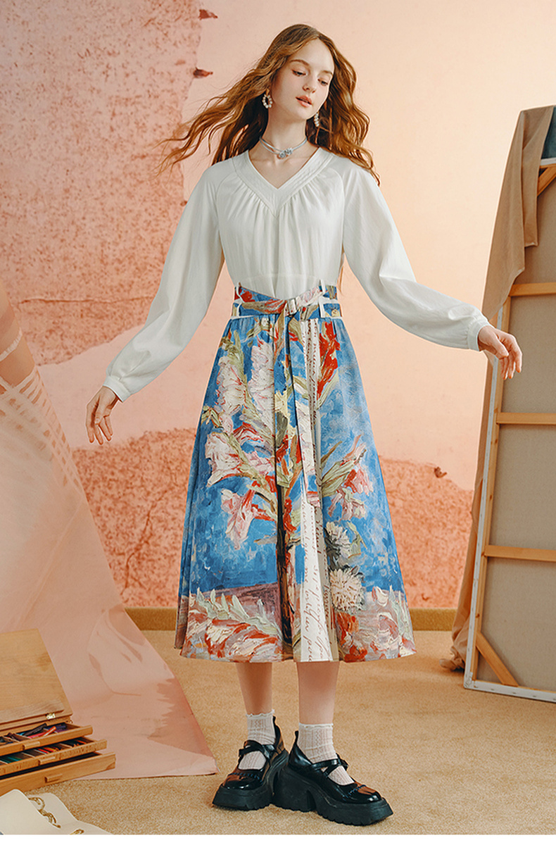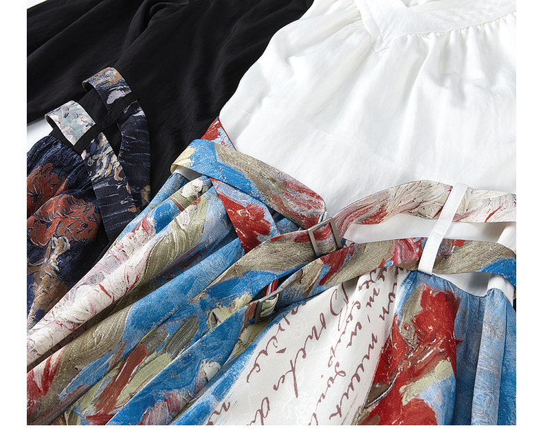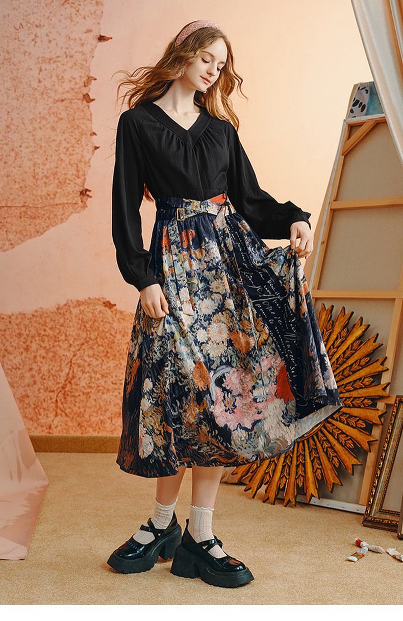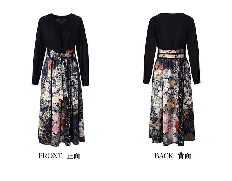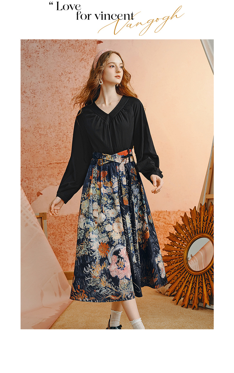 两三事梵高文艺花海星砂2025秋季新款法式印花裙摆拼接a字连衣裙