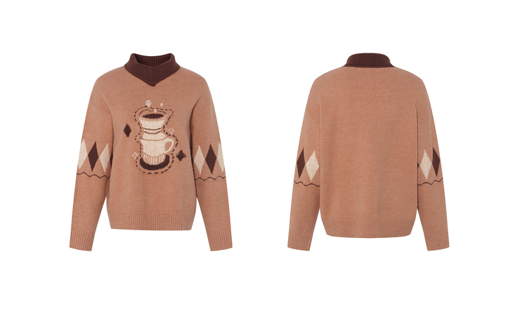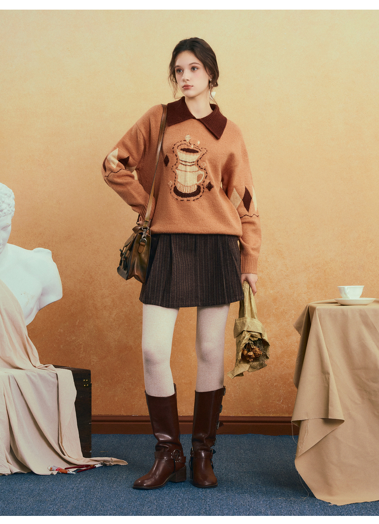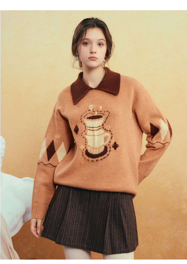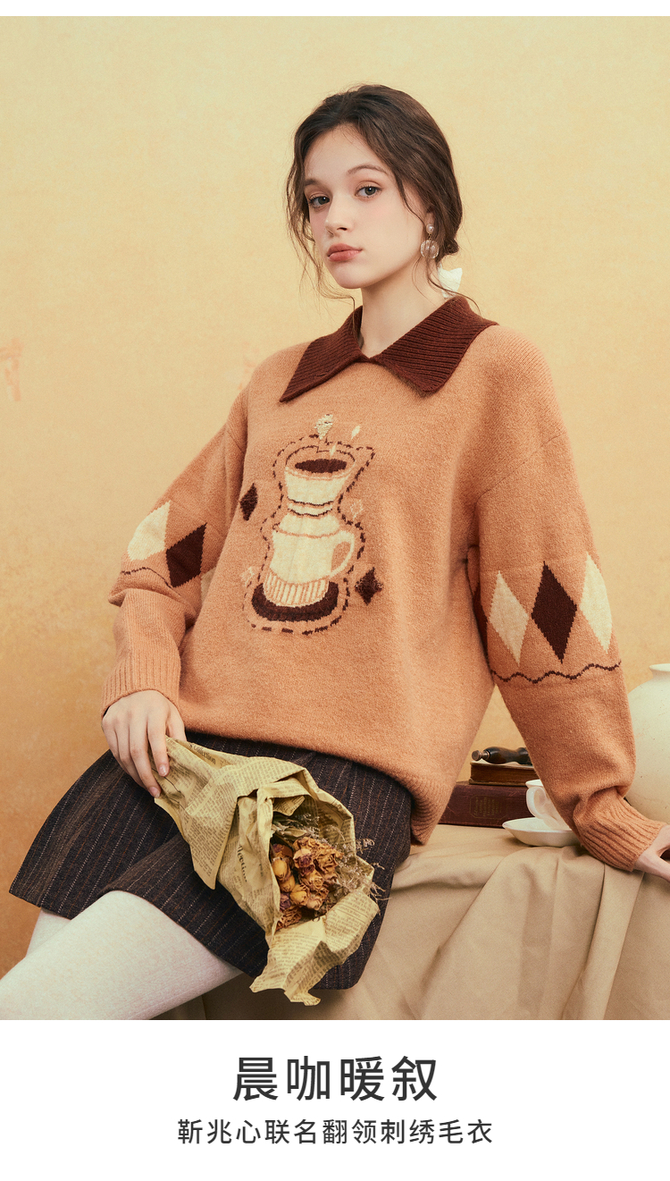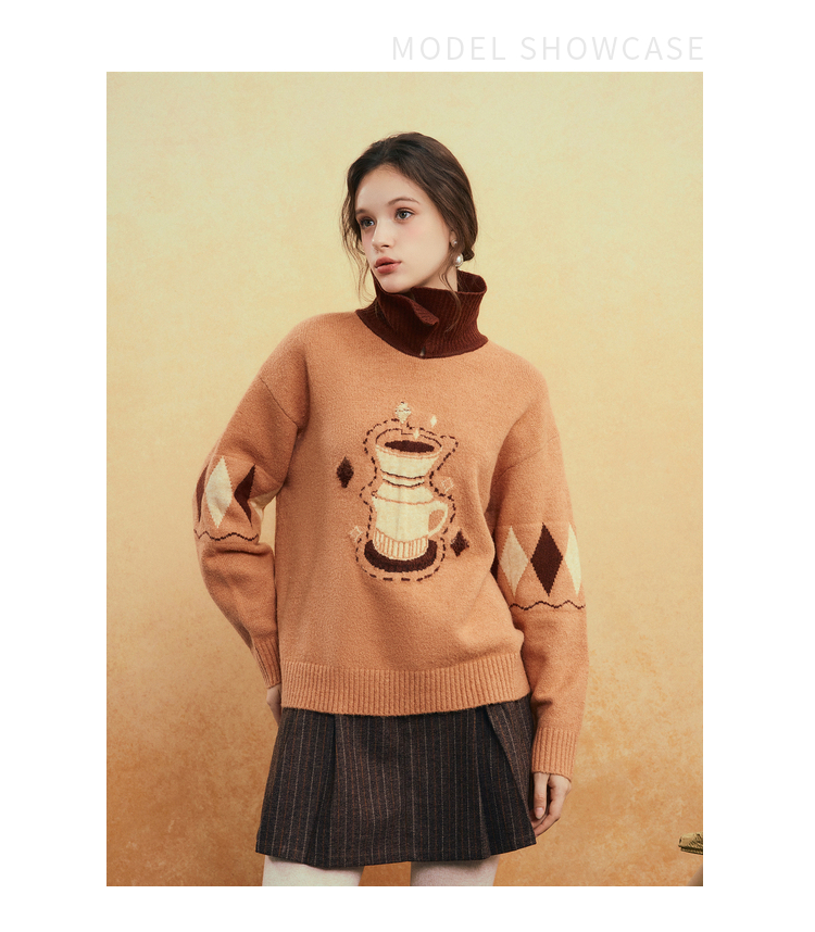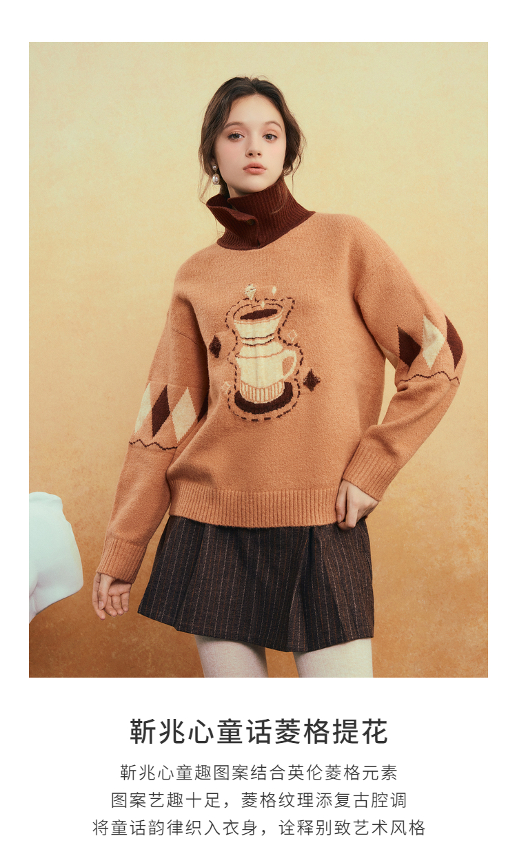 两三事晨咖暖叙2025冬季新款森系风咖啡壶图案拼色翻领套头毛衣女